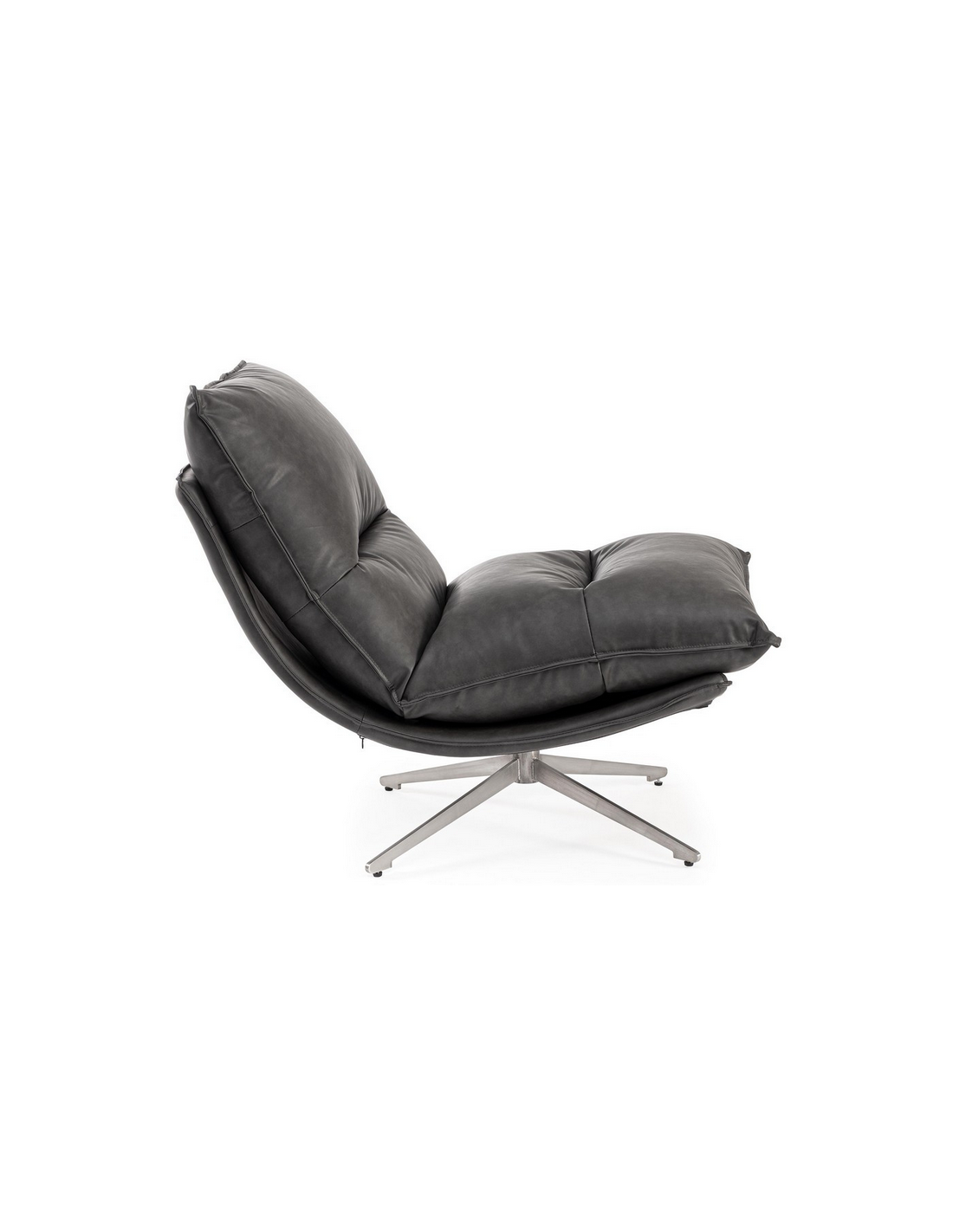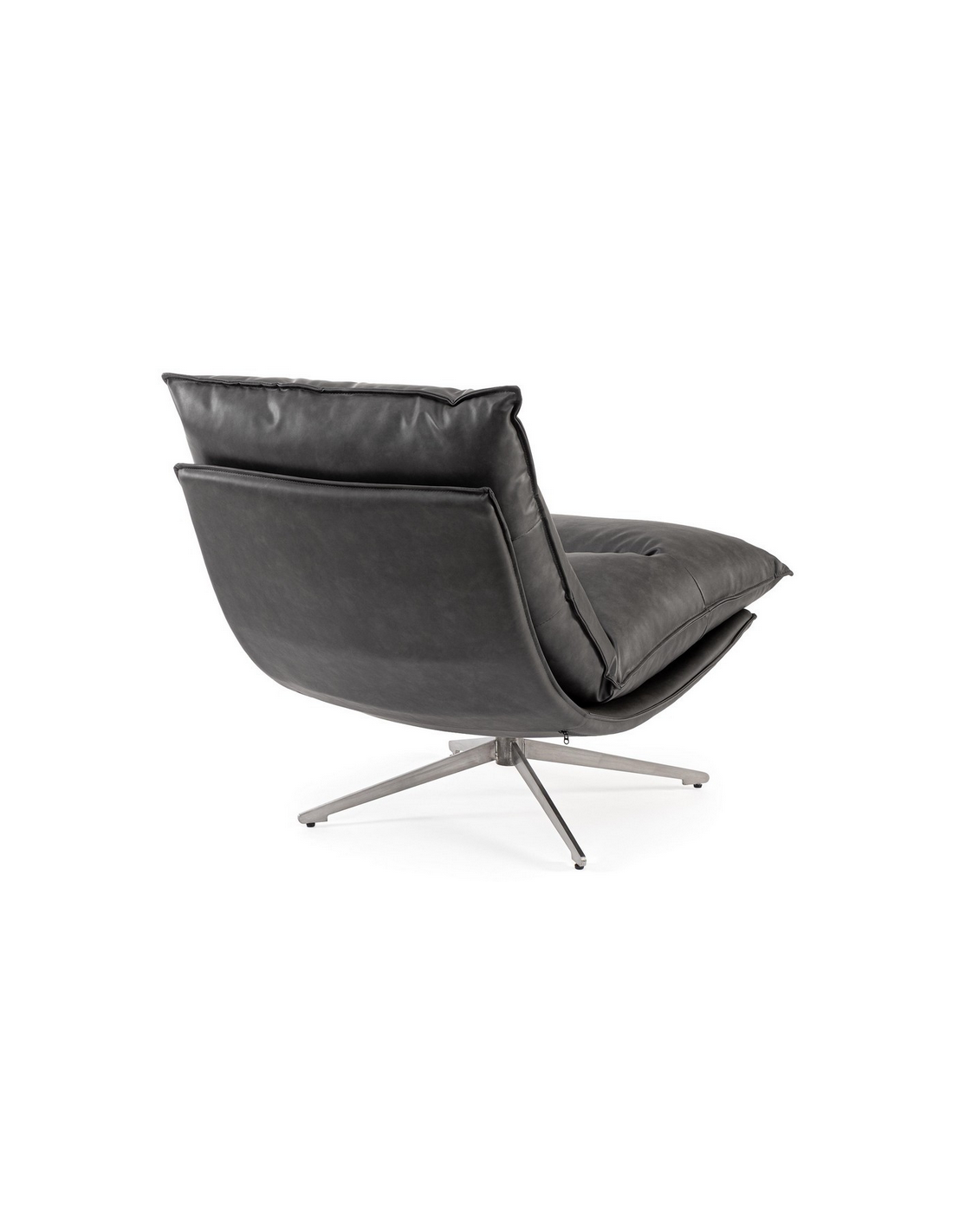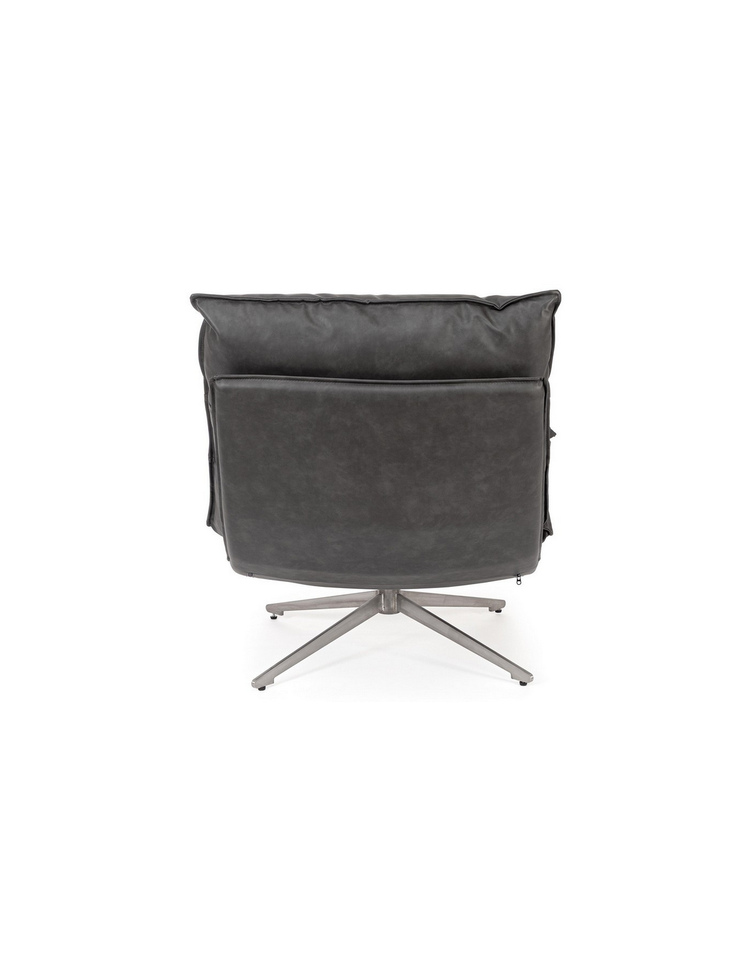 ALAN Lænestol med 360 graders drejbart stel, udført i et moderne design af stålgrå lakeret stål og mørkegrå kunstlæder. Stolen måler 81 cm i højden over ryggen og med siddehøjde på 49 cm.