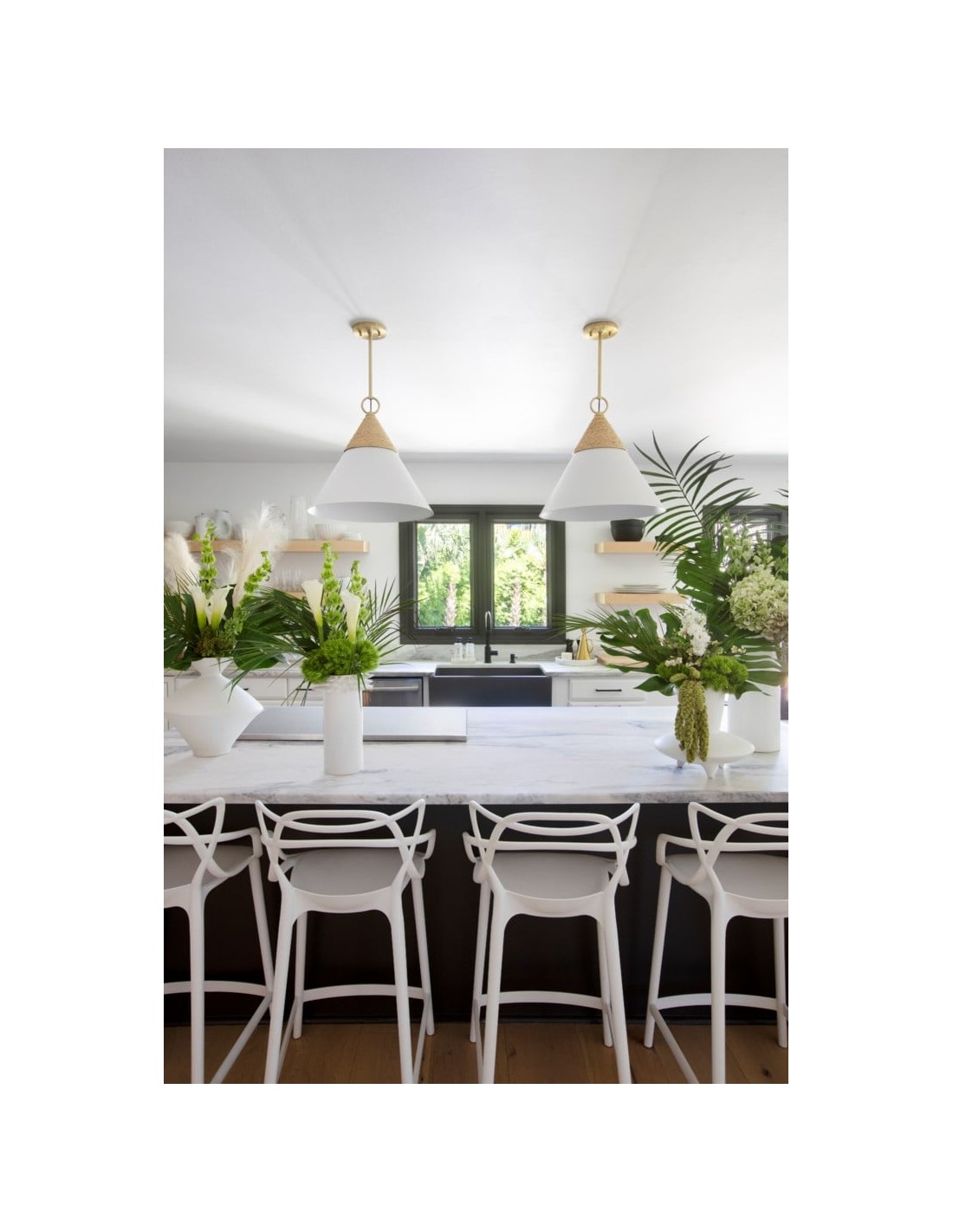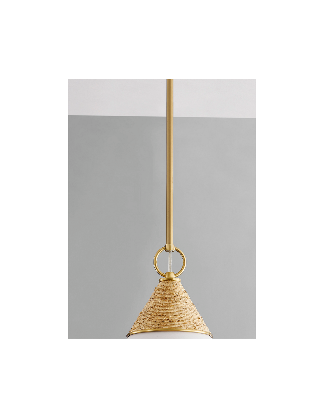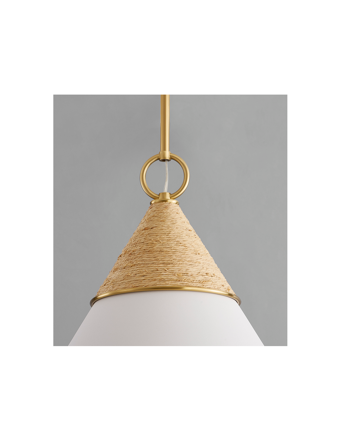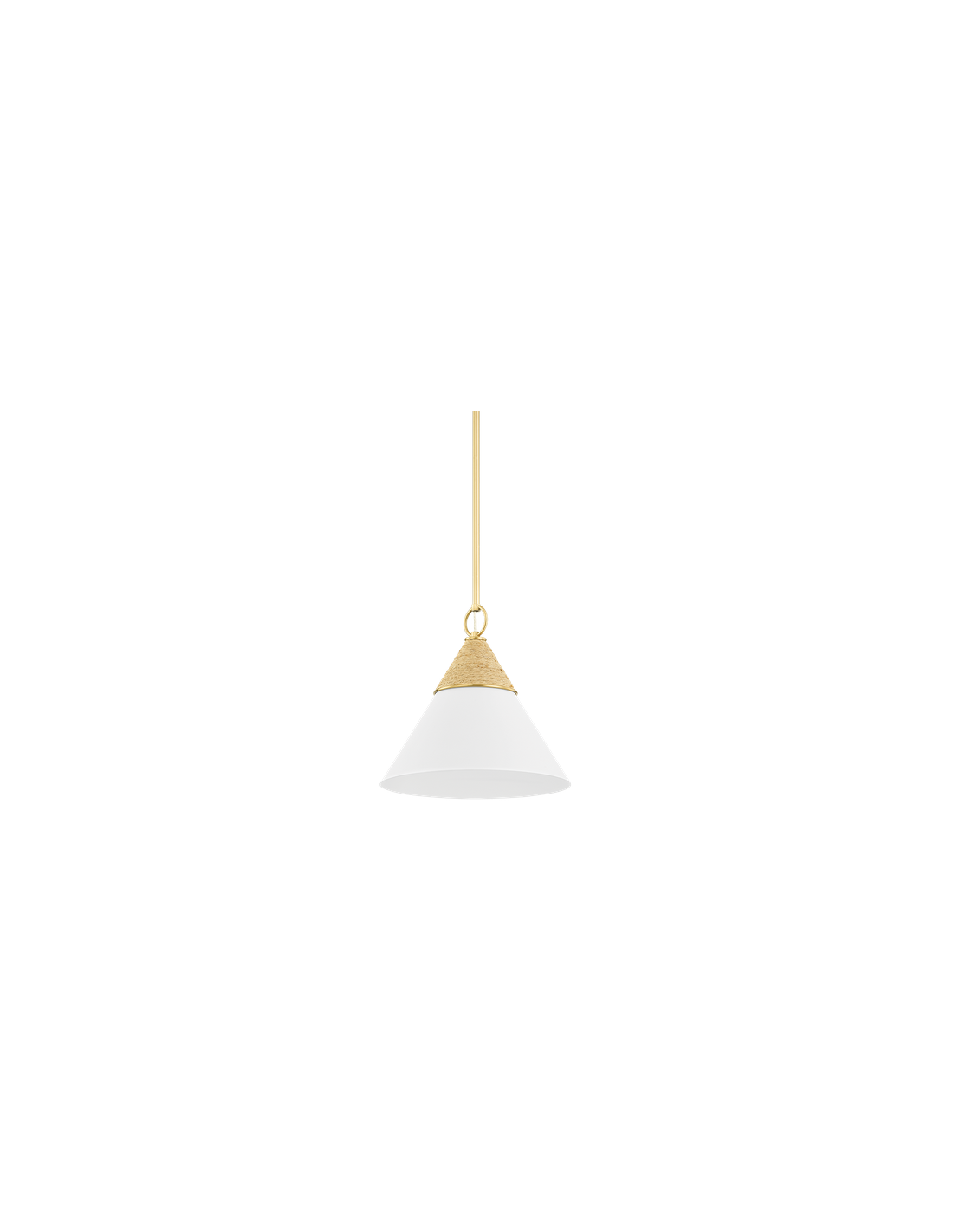 MICA Loftlampe udført i et moderne design fremstillet i hvid- og antik messinglakeret stål og naturfarvet raffia. Loftlampen måler 42 - 133,4 cm i højden og 33 cm i diameter og anvender 1 x E27 lyskilde (Ekskl.).