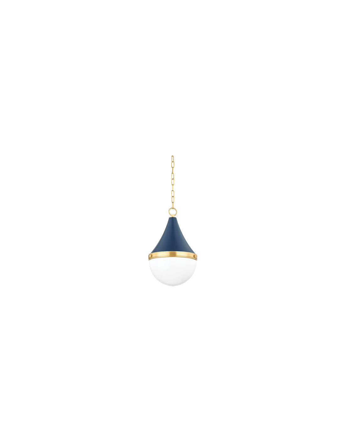 CIARA Loftlampe udført i et moderne design fremstillet i aldret messing- og soft navyblå stål med skærm i hvidt glas. Loftlampen måler 55,3 - 187,4 cm i højden og 29,85 cm i diameter og anvender 1 x E27 lyskilde (Ekskl.).