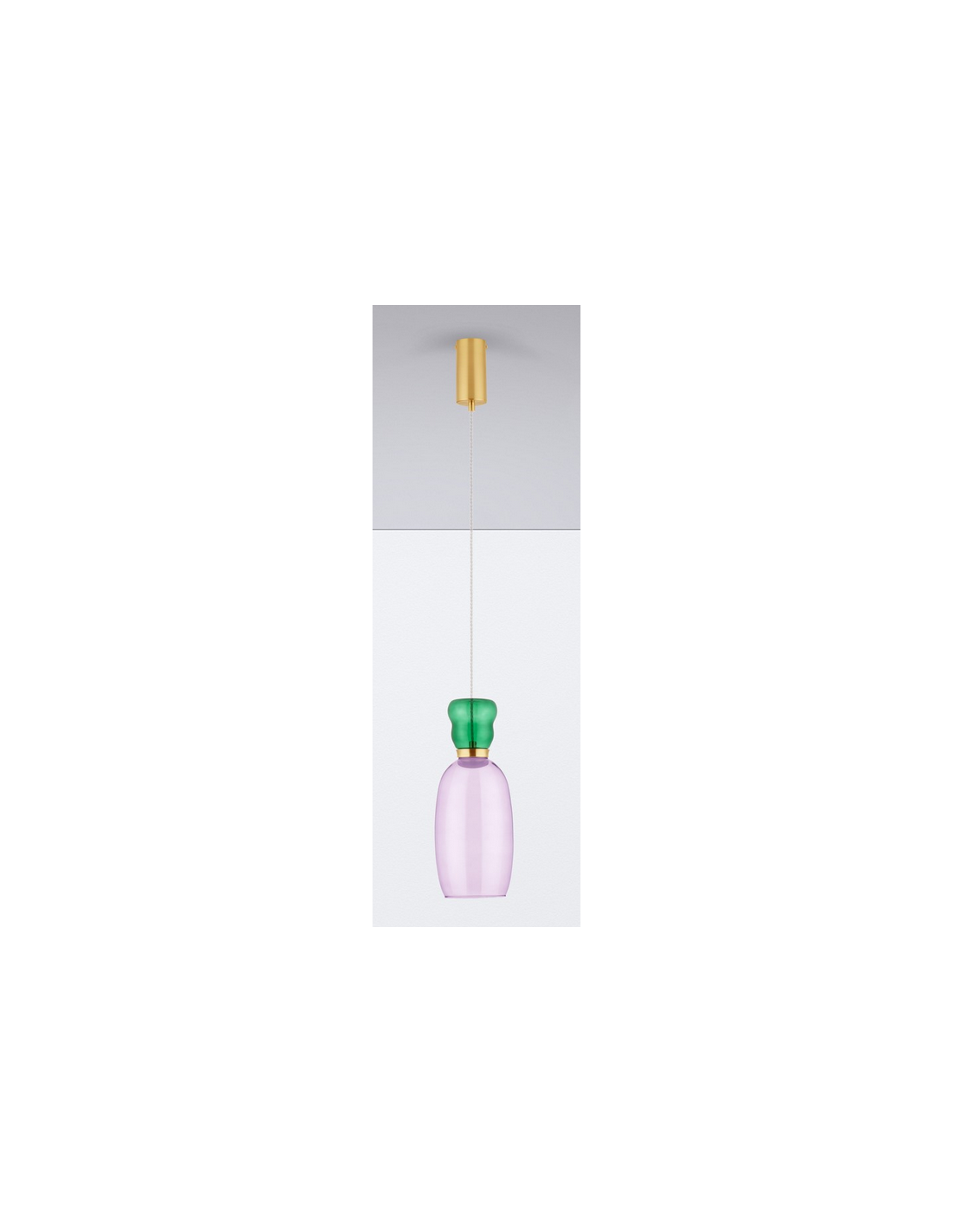 PLUME Loftlampe udført i et retropræget design fremstillet i satineret messinglakeret stål med skærm i lilla og grøn glas. Lampen måler 179 cm i højden og anvender 5W LED lyskilde (Inkl.).