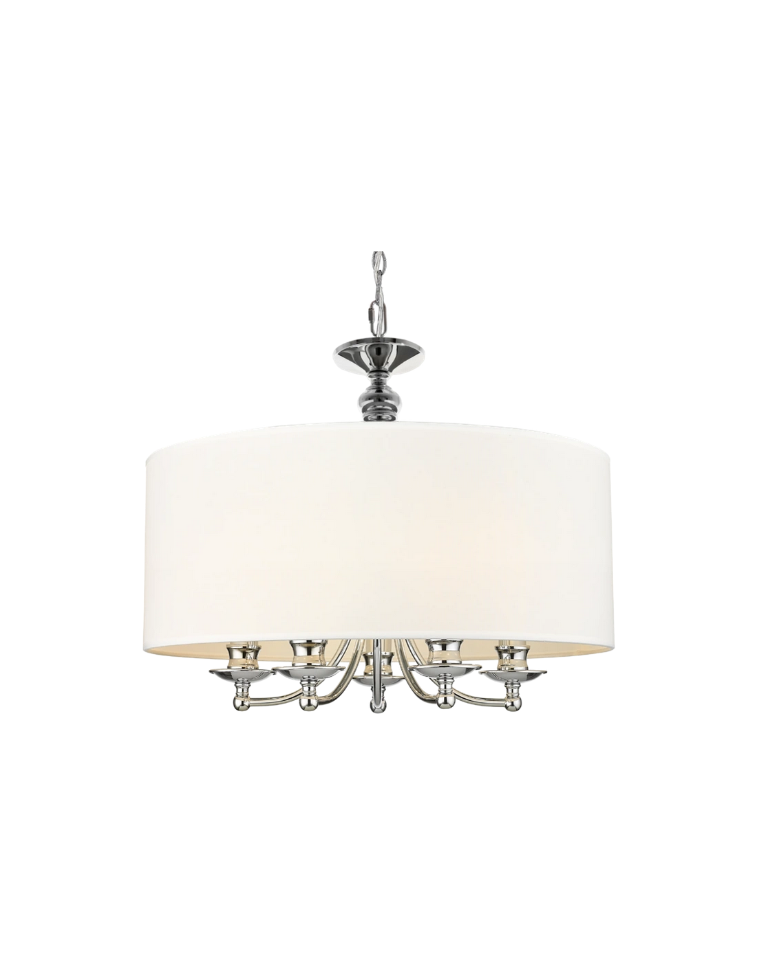 ABU DHABI Loftlampe udført i et design af kromfarvet metal og med skærm i hvid polyester. Lampen måler 45 - 152 cm i højden og 50 cm i skærmdiameter og anvender 5 x E14 lyskilder (Ekskl.).