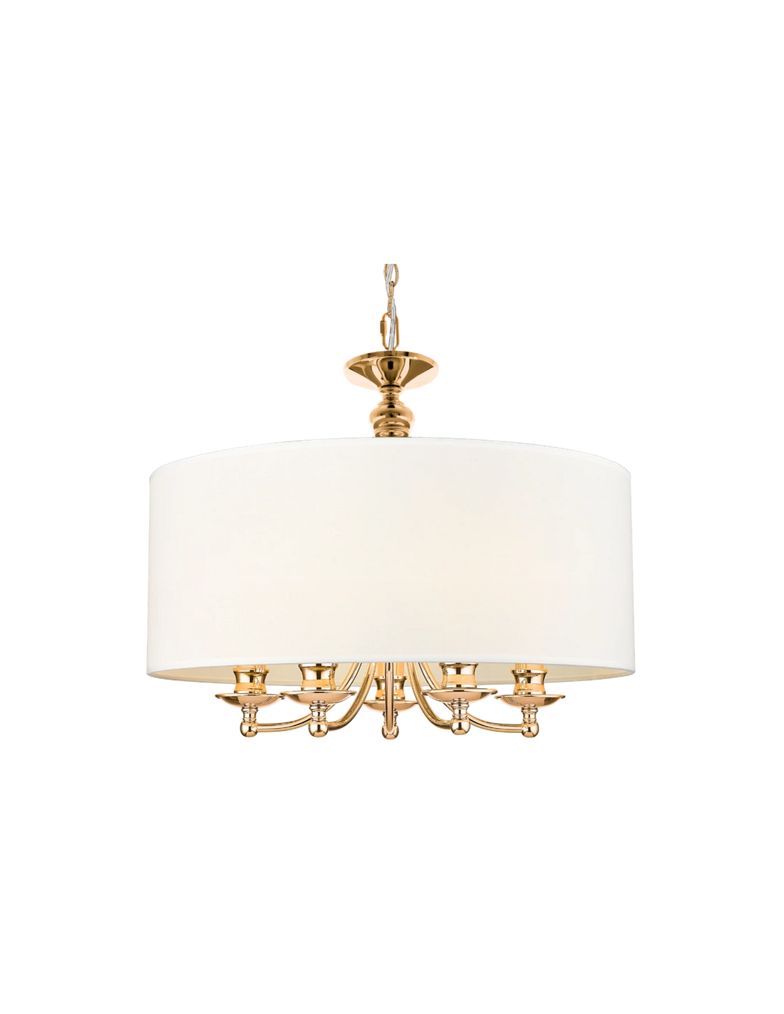 ABU DHABI Loftlampe udført i et design af poleret guldfarvet metal og med skærm i hvid polyester. Lampen måler 45 - 152 cm i højden og 50 cm i skærmdiameter og anvender 5 x E14 lyskilder (Ekskl.).
