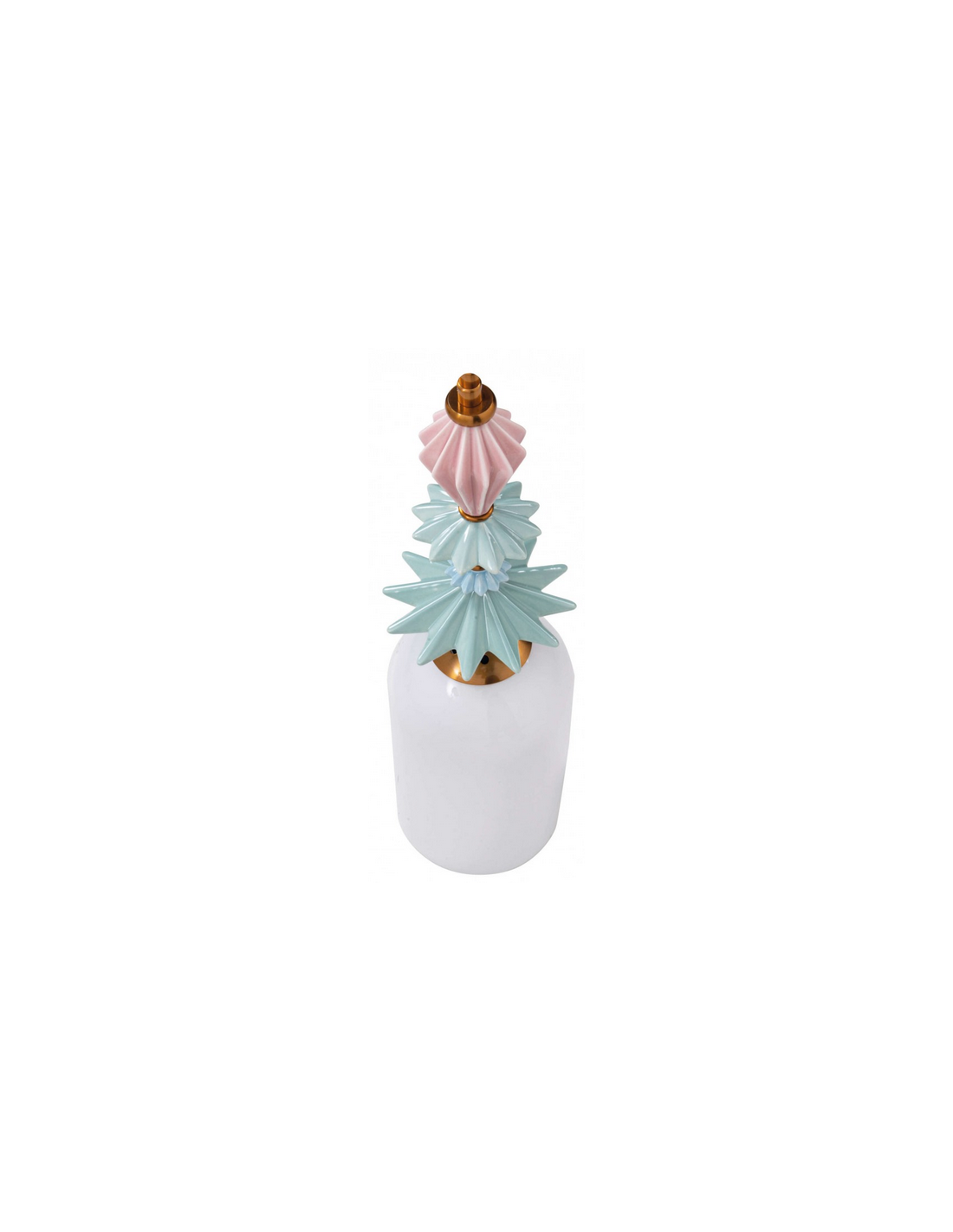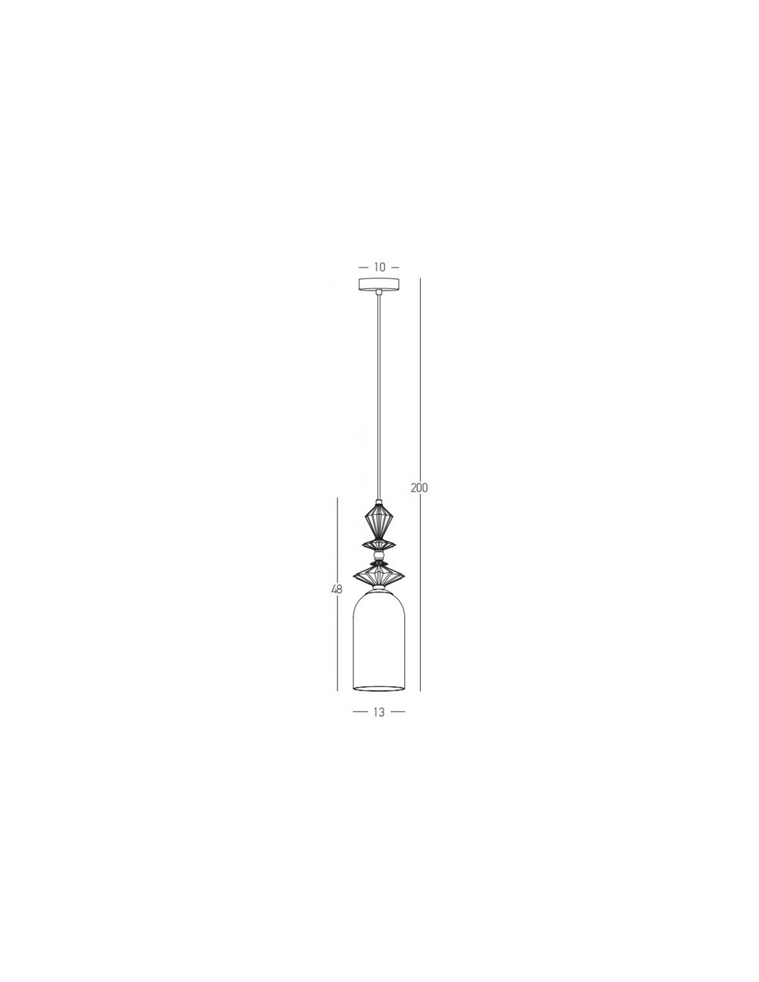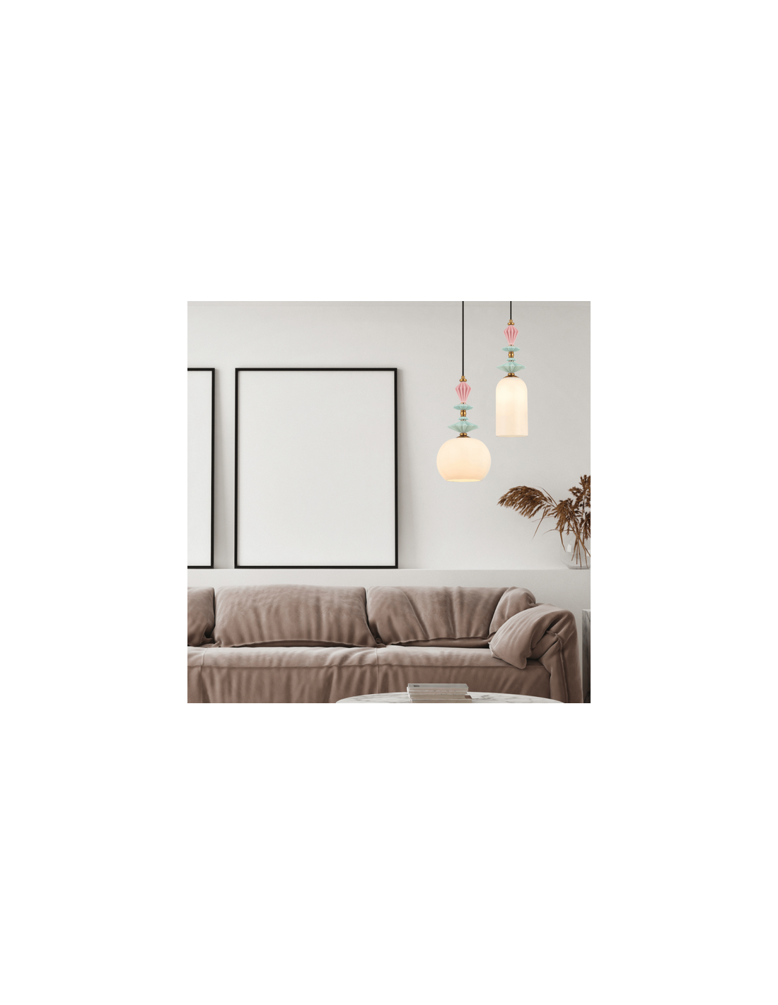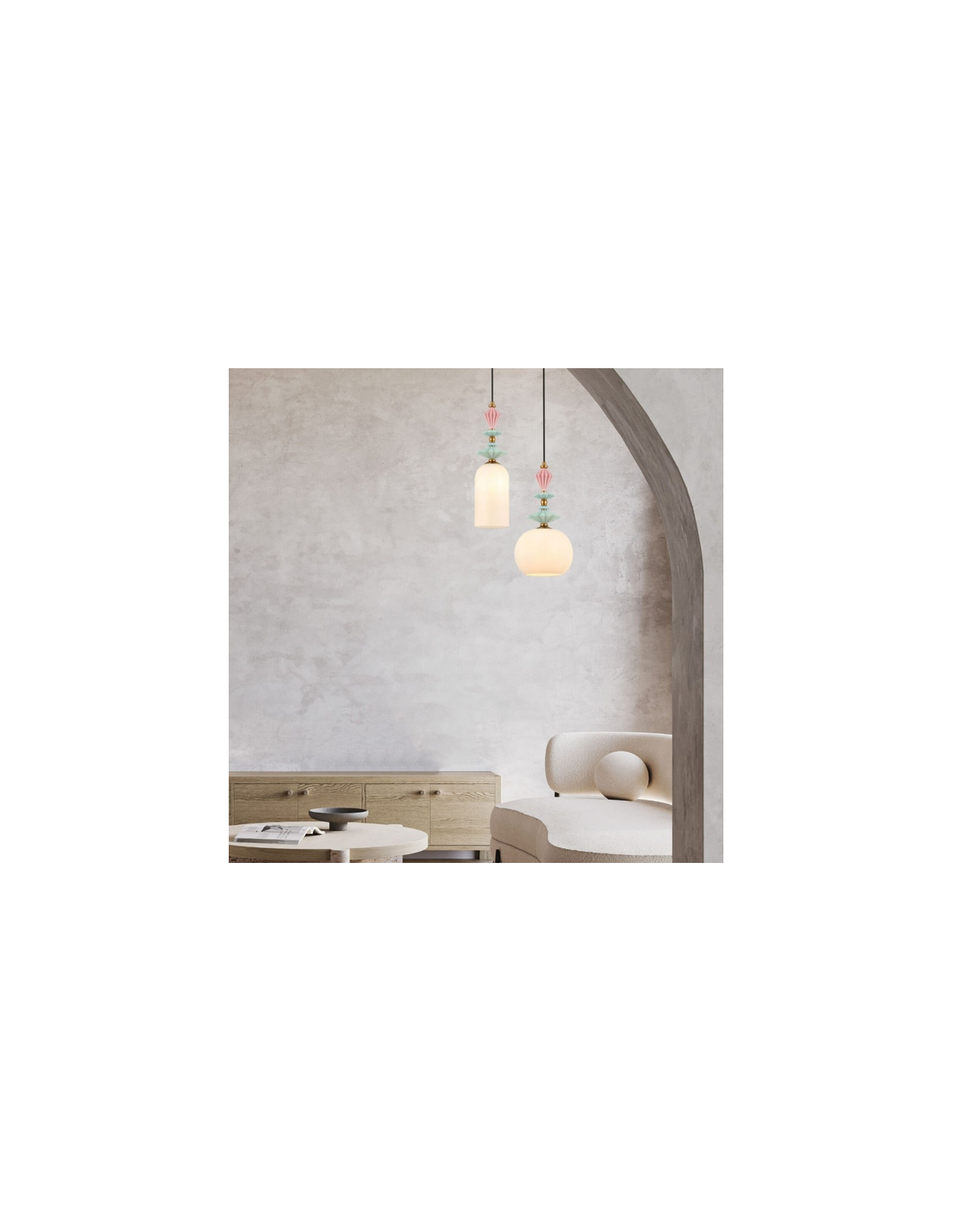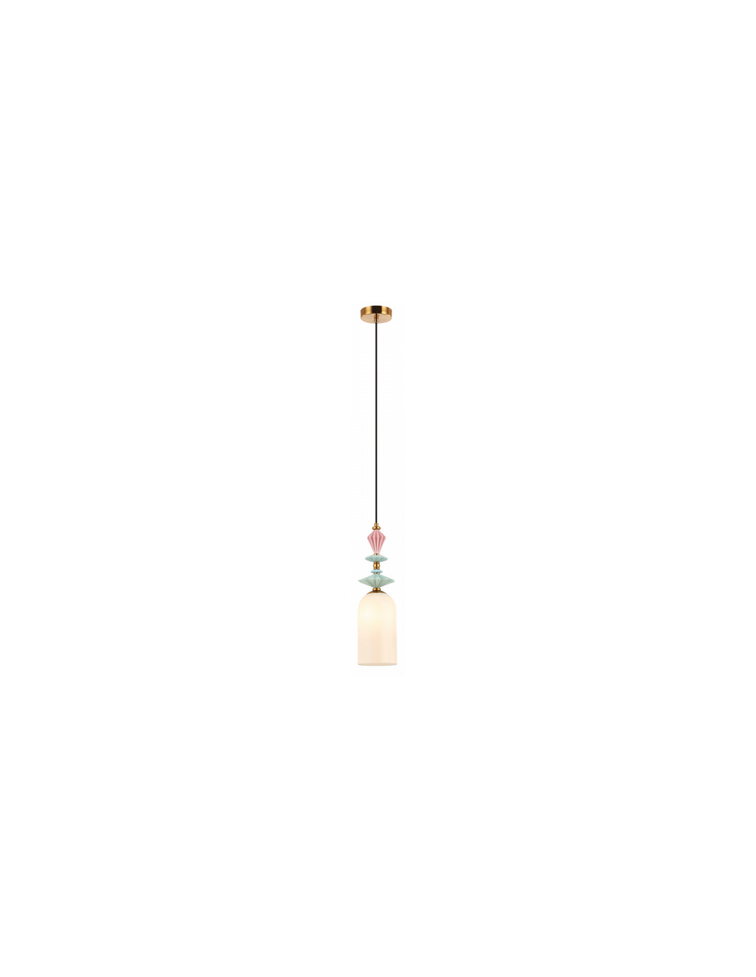 Loftlampe udført i et moderne design af antik messinglakeret metal, multifarvet keramik og hvid opalglas. Loftlampen måler 13 cm i diameter og op til 200 cm i højden. Lampen anvender 1 x E27 lyskilde (Ekskl.).