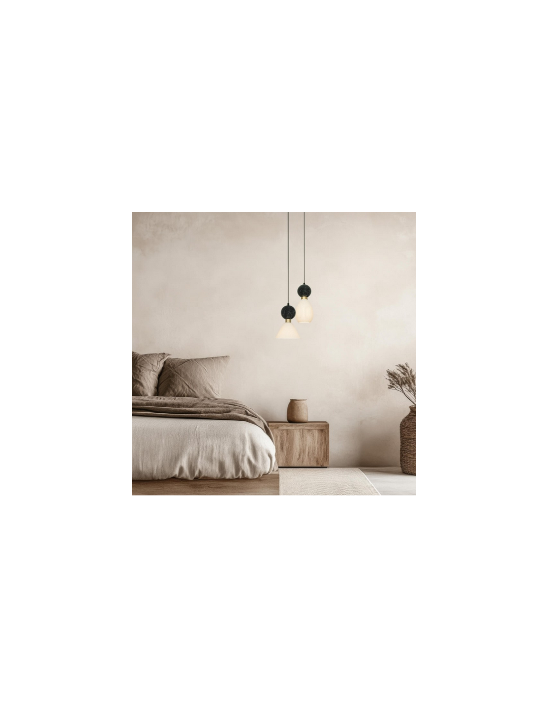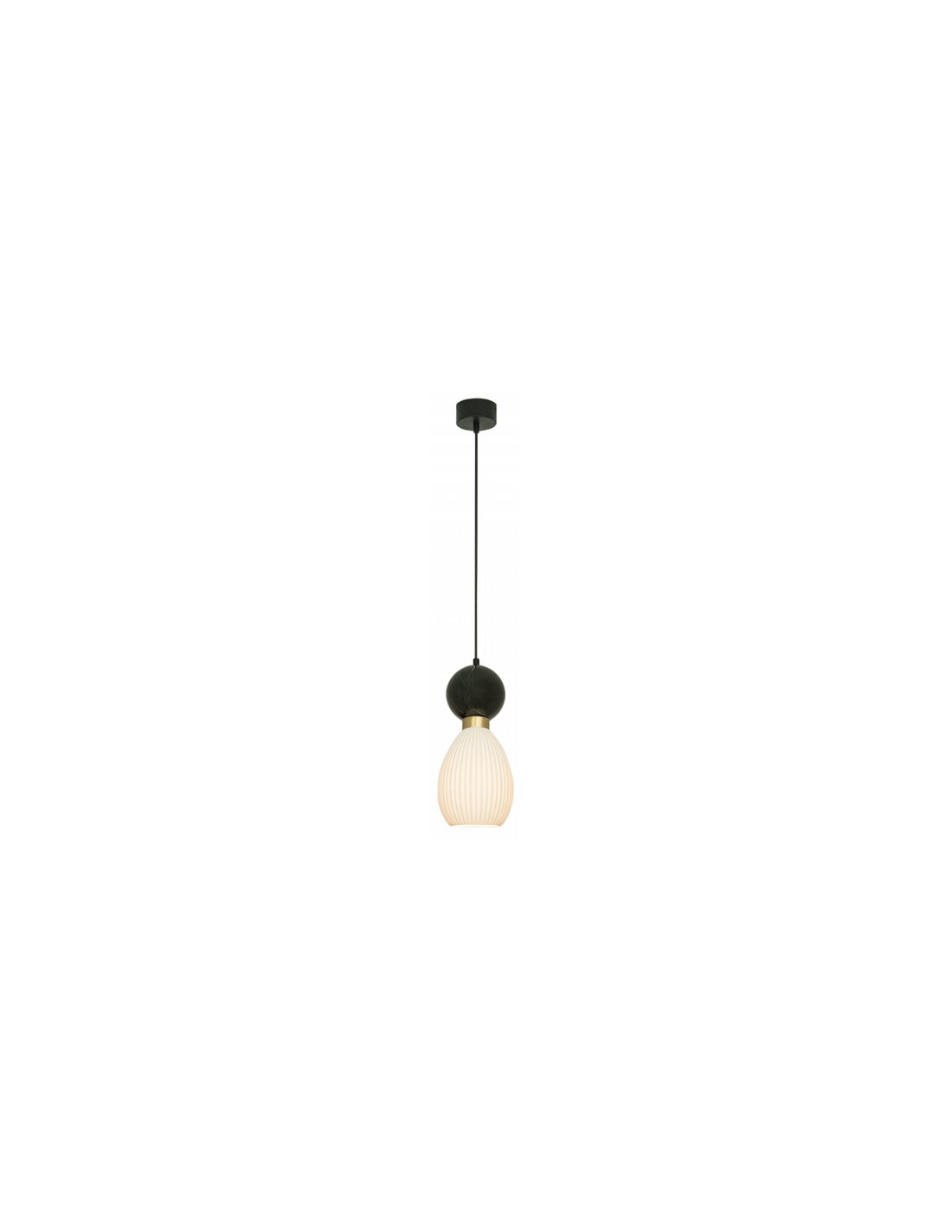Loftlampe udført i et moderne design af kvalitetsmaterialer som sort marmor med detaljer i messing, hertil skærm udført i hvid gypsum mineral. Loftlampen måler 14 cm i diameter og op til 233 cm i højden. Lampen anvender 1 x E14 lyskilde (Ekskl.).