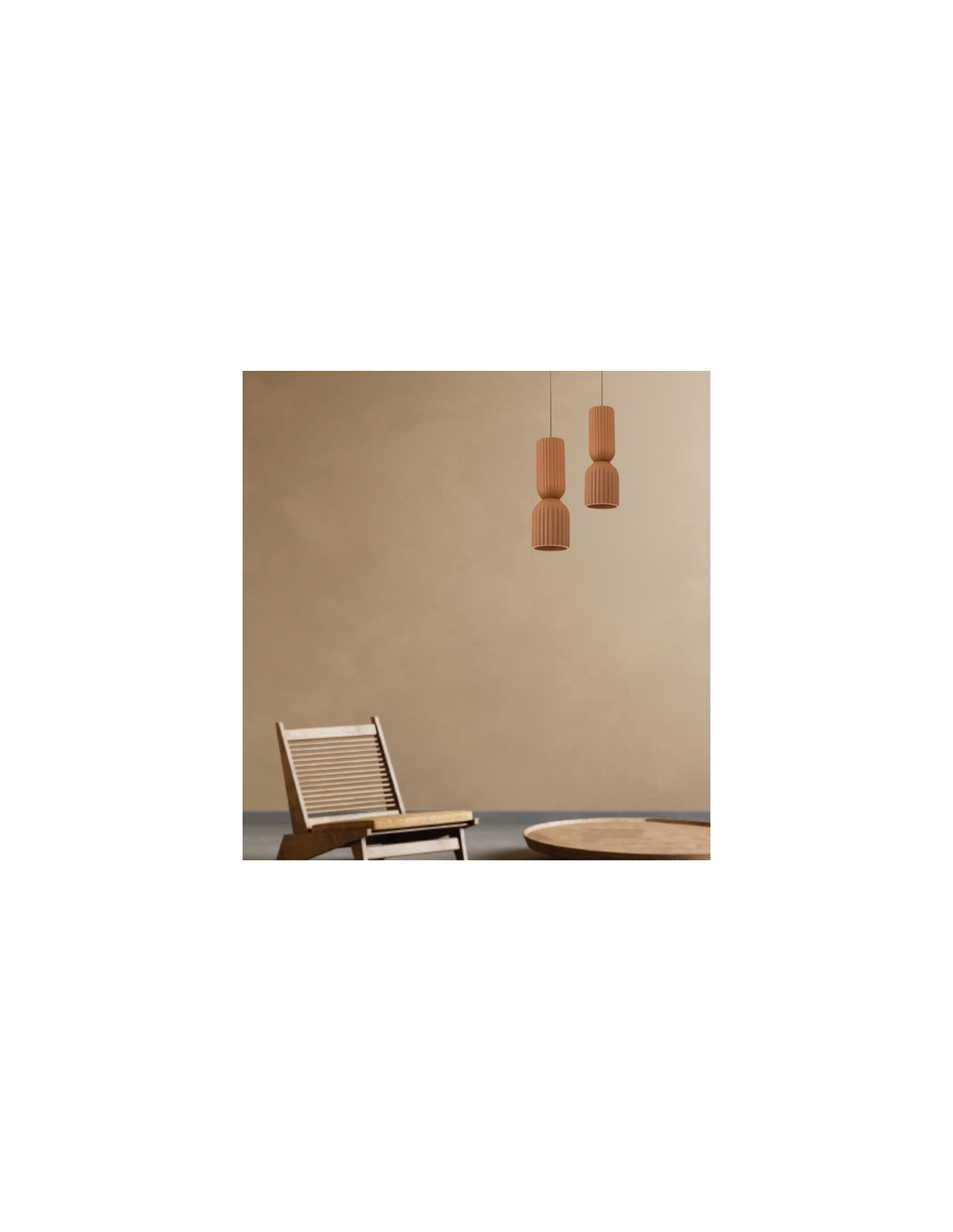 Loftlampe udført i et moderne design af mat sortlakeret aluminium og terracotta farvet ler. Loftlampen måler 15 cm i diameter og op til 223,5 cm i højden. Lampen anvender 1 x E27 lyskilde (Ekskl.).
