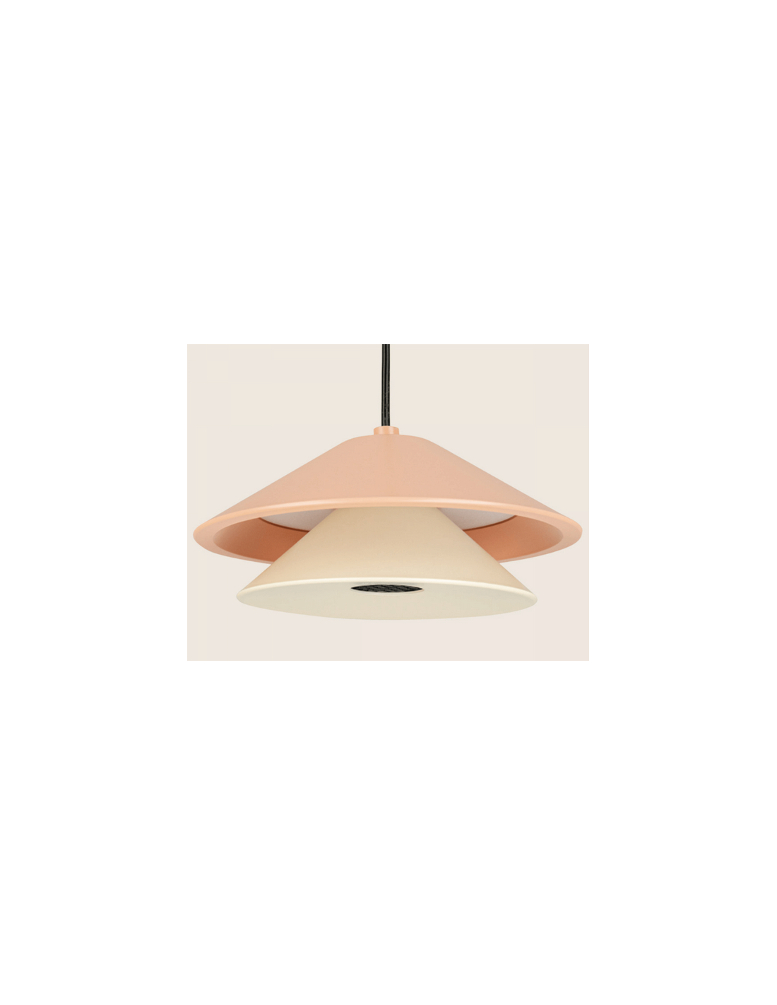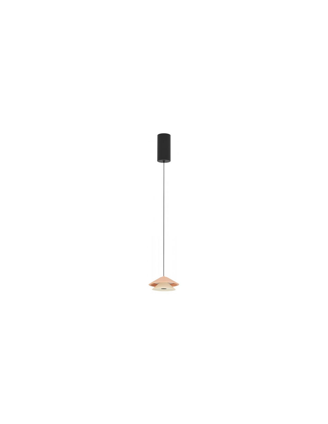 Loftlampe udført i et moderne design af satineret sortlakeret, beige og lakserød aluminium. Loftlampen måler 13 cm i diameter og op til 218,5 cm i højden. Lampen anvender 9W indbygget LED lyskilde.
