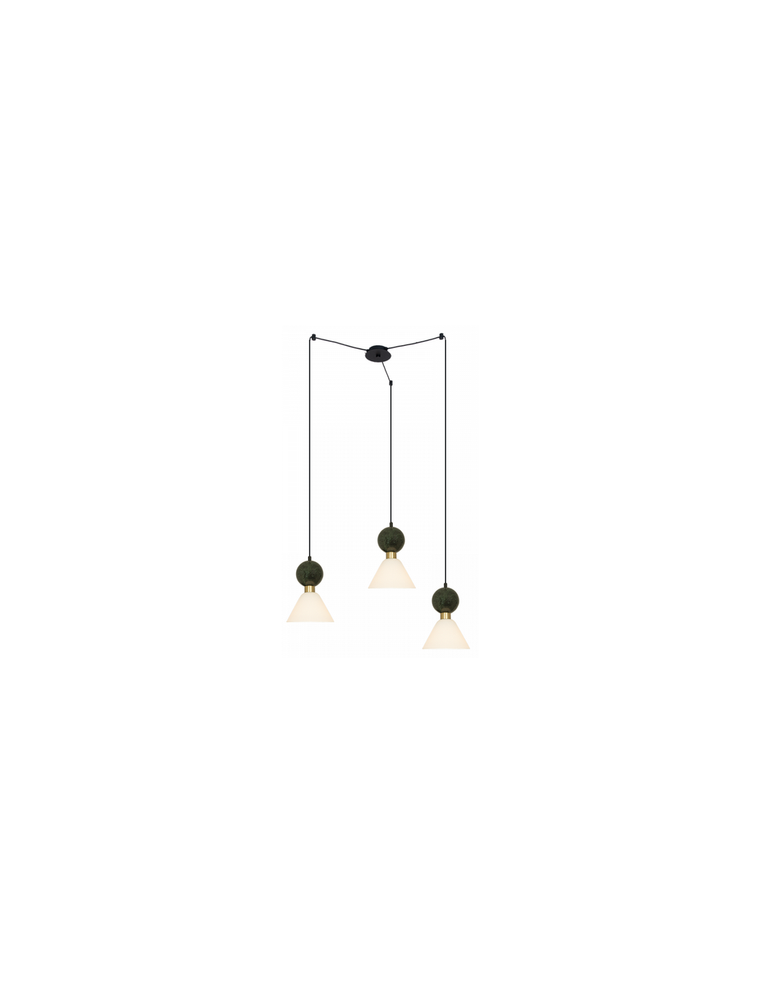 Klyngependel udført i et moderne design af kvalitetsmaterialer som grøn marmor med detaljer i messing, hertil skærme udført i hvid gypsum mineral. Loftlampen måler 80 cm i diameter og op til 140 cm i højden. Lampen anvender 3 x E14 lyskilder (Ekskl.).