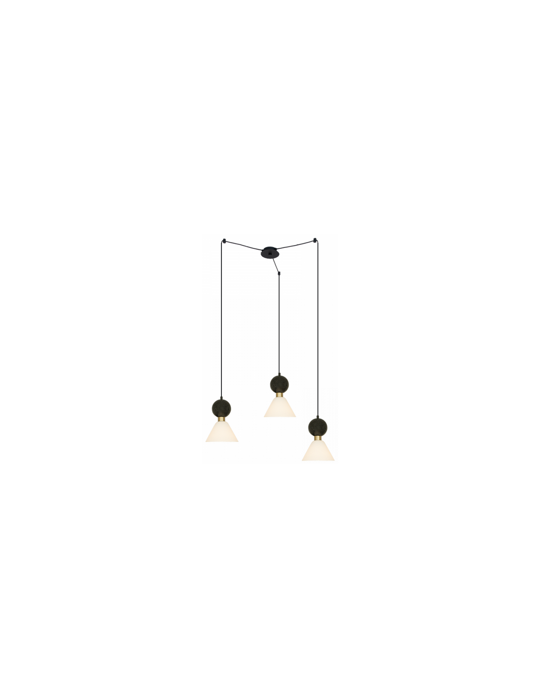Klyngependel udført i et moderne design af kvalitetsmaterialer som sort marmor med detaljer i messing, hertil skærme udført i hvid gypsum mineral. Loftlampen måler 80 cm i diameter og op til 140 cm i højden. Lampen anvender 3 x E14 lyskilder (Ekskl.).