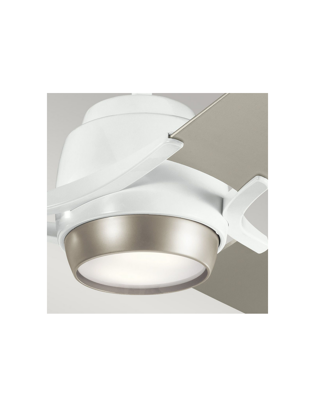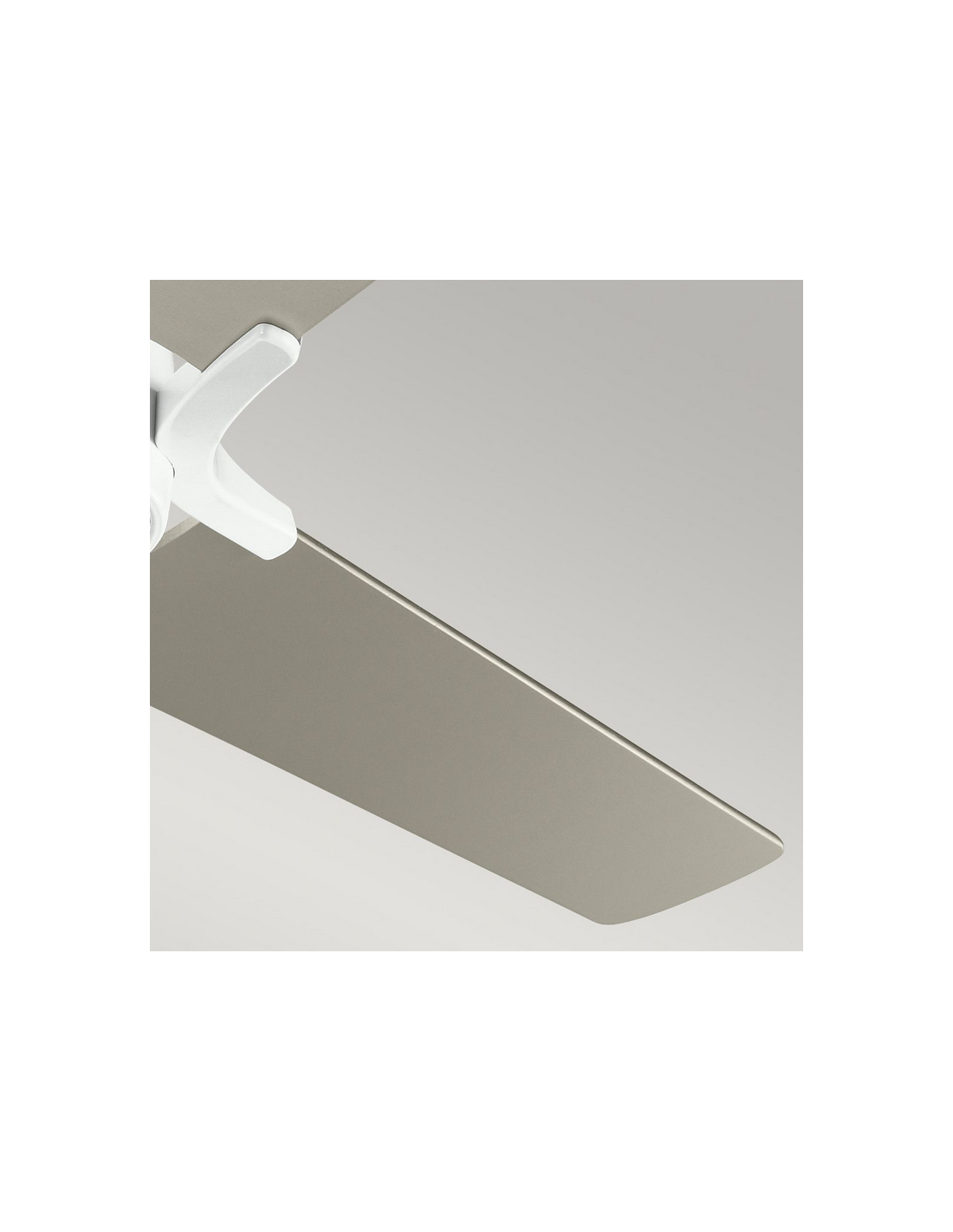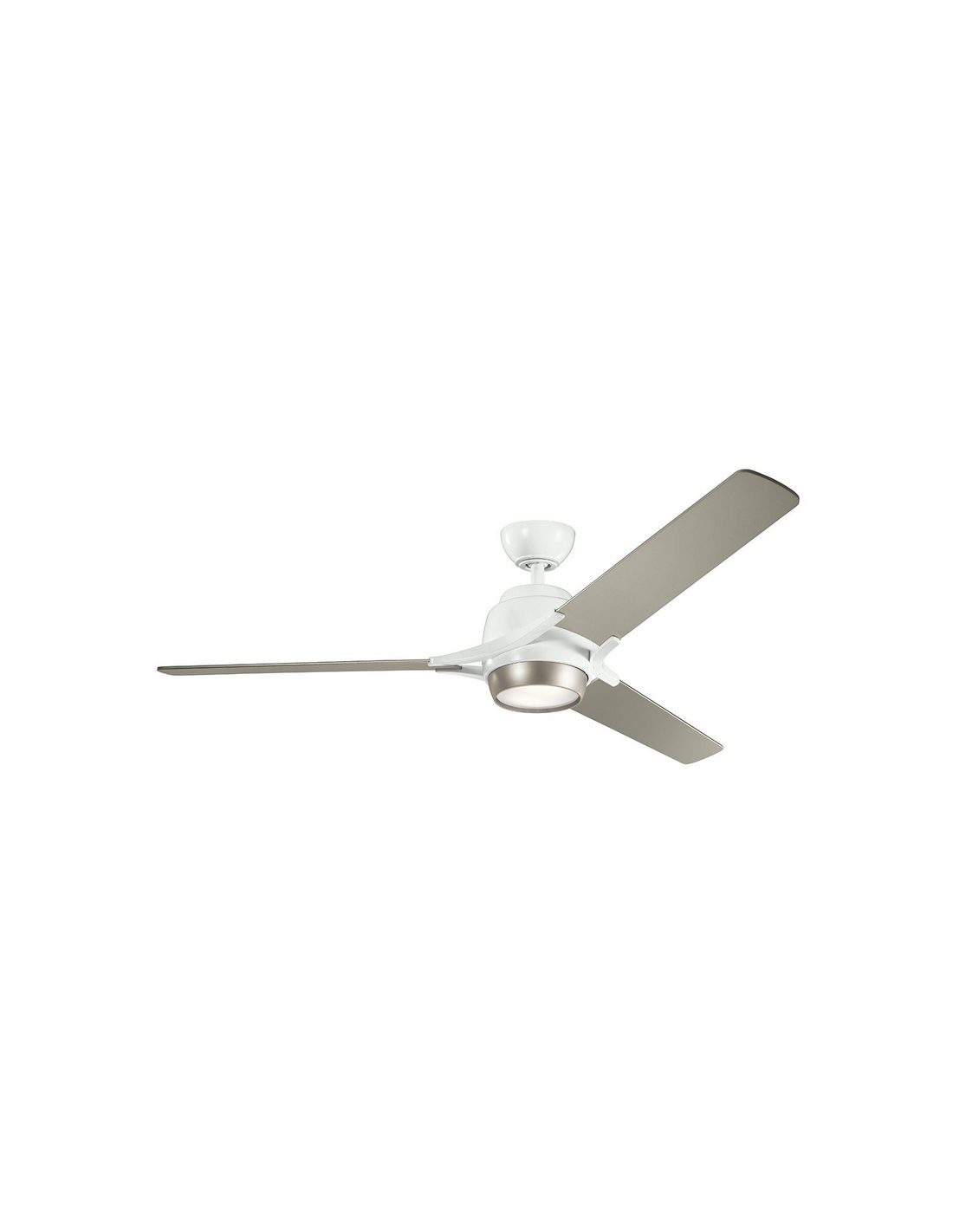 ZEUS Loftventilator udført i et moderne design, fremstillet i hvidlakeret stål og med vinger i børstet nikkelfarvet polycarbonat. Loftventilatorer kan monteres på vandrette og skrå lofter (i kip). Ventilatoren måler 152 cm i diameter og 29 - 46 cm i højde/fremspring. Den kommer med 3 hastigheder frem og 1 i retur, og styres via fjernbetjening. Denne ventilator er med indbygget 10W LED lampe. Loftventilatorer er ideel til rum på op til 20 m2. Ventilatoren har et støjniveau på op til 39,3 DB.