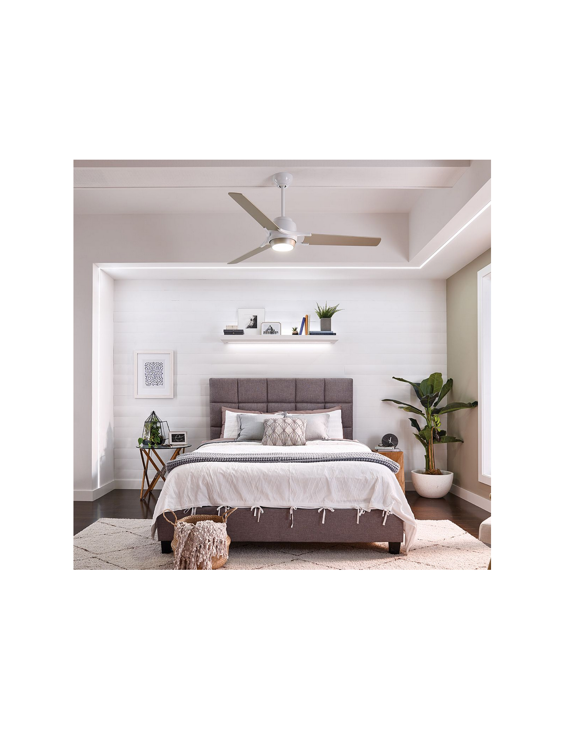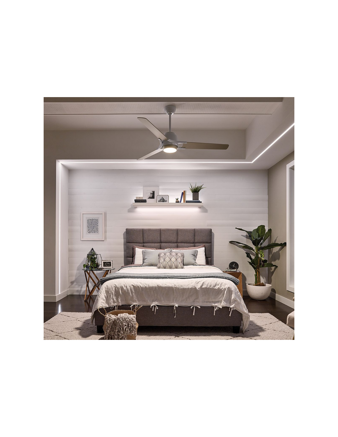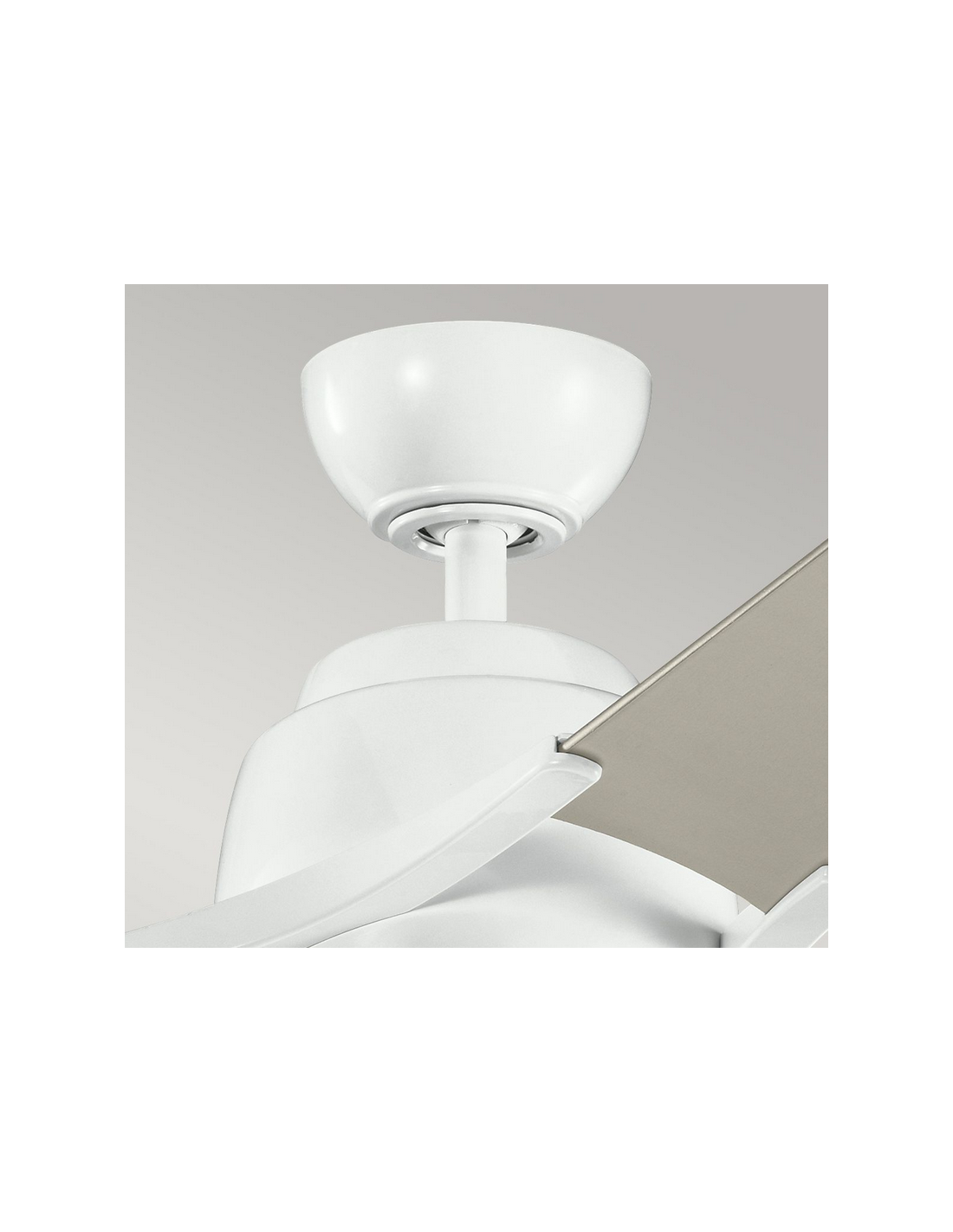 ZEUS Loftventilator udført i et moderne design, fremstillet i hvidlakeret stål og med vinger i børstet nikkelfarvet polycarbonat. Loftventilatorer kan monteres på vandrette og skrå lofter (i kip). Ventilatoren måler 152 cm i diameter og 29 - 46 cm i højde/fremspring. Den kommer med 3 hastigheder frem og 1 i retur, og styres via fjernbetjening. Denne ventilator er med indbygget 10W LED lampe. Loftventilatorer er ideel til rum på op til 20 m2. Ventilatoren har et støjniveau på op til 39,3 DB.
