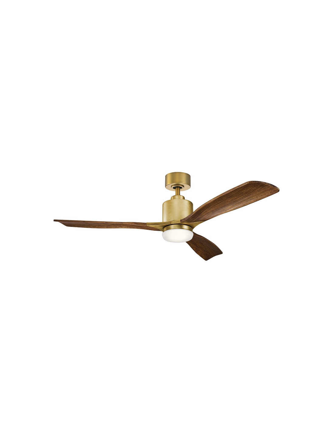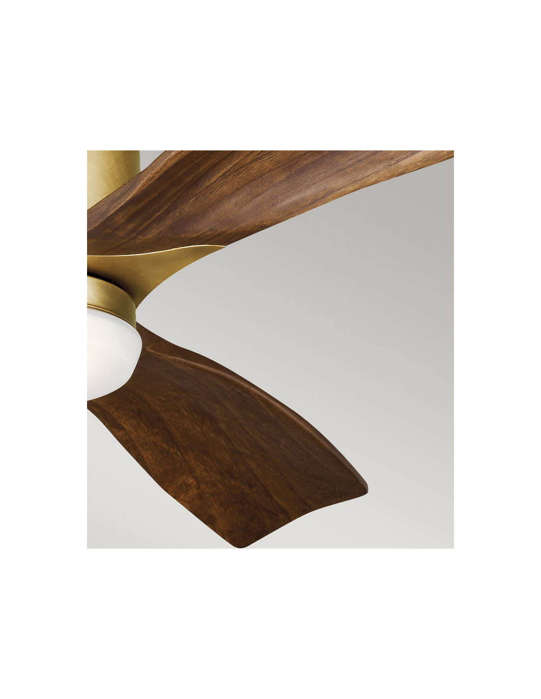RIDLEY Loftventilator udført i et moderne design, fremstillet i messinglakeret stål og med vinger i brunlakeret kirsebærtræ. Loftventilatoren kan monteres på vandrette og skrå lofter (i kip). Ventilatoren måler 132 cm i diameter og 34 - 41 cm i højde/fremspring. Den kommer med 3 hastigheder frem og 1 i retur, og styres via fjernbetjening. Denne ventilator er med indbygget 14W LED lampe. Loftventilatorer er ideel til rum på op til 20 m2. Ventilatoren har et støjniveau på op til 40,5 DB.