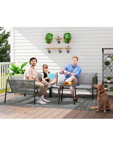 Loungesofa sæt der kan sættes op efter ønske (se mål på billede nummer 2). Til sofaen er også et havebord. Sofaen er fremstillet i mørkegrå lakeret stål og grå polyester med skumfyld der er vandafvisende og UV-resistent. Havebordet er fremstillet i mørkegrå lakeret stål. Betrækket på hynderne er aftageligt og vaskbart.