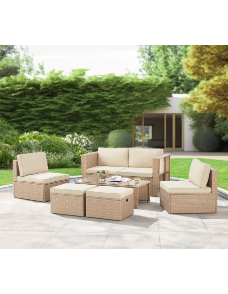 SALOU Loungesæt til haven, udført i et design af naturfarvet polyrattan med et indre af aluminium og med cremefarvet vandafvisende hynder i polyester med skumfyld. Sættet består af 1 sofa, 2 stole, 2 puffer samt et bord, hvor bordpladen er med glasplade. Materialerne er UV-beskyttede og tåler det danske klima. Betrækket på hynderne er aftageligt og vaskbart.