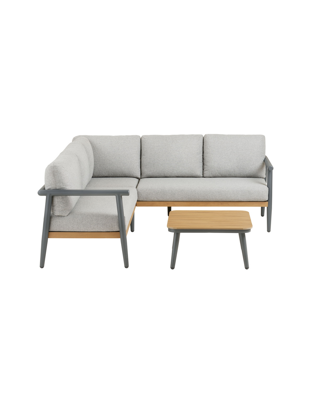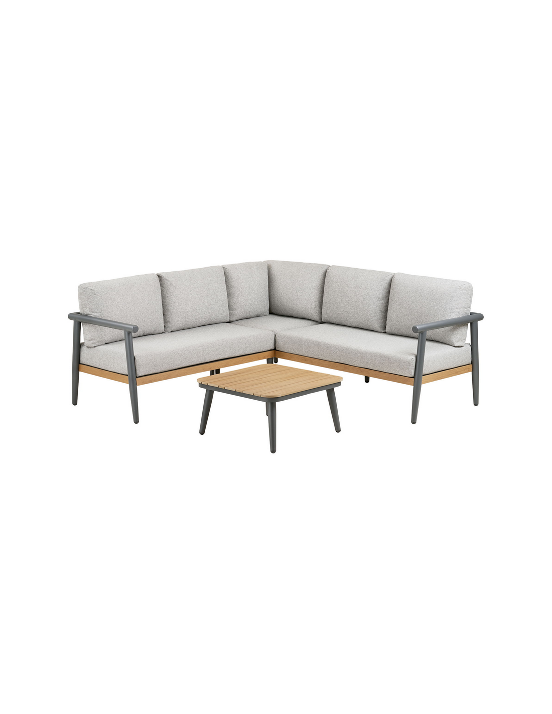 Lounge hjørnesofa med 1 loungesofa og 1 x havebord udført i et design af antracitlakeret aluminium, teaktræsfarvet nonwood og grå polyester med skumfyld. Hynderne er ikke vandafvisende eller vandtætte, og bør opbevares indendørs når de ikke er i brug.