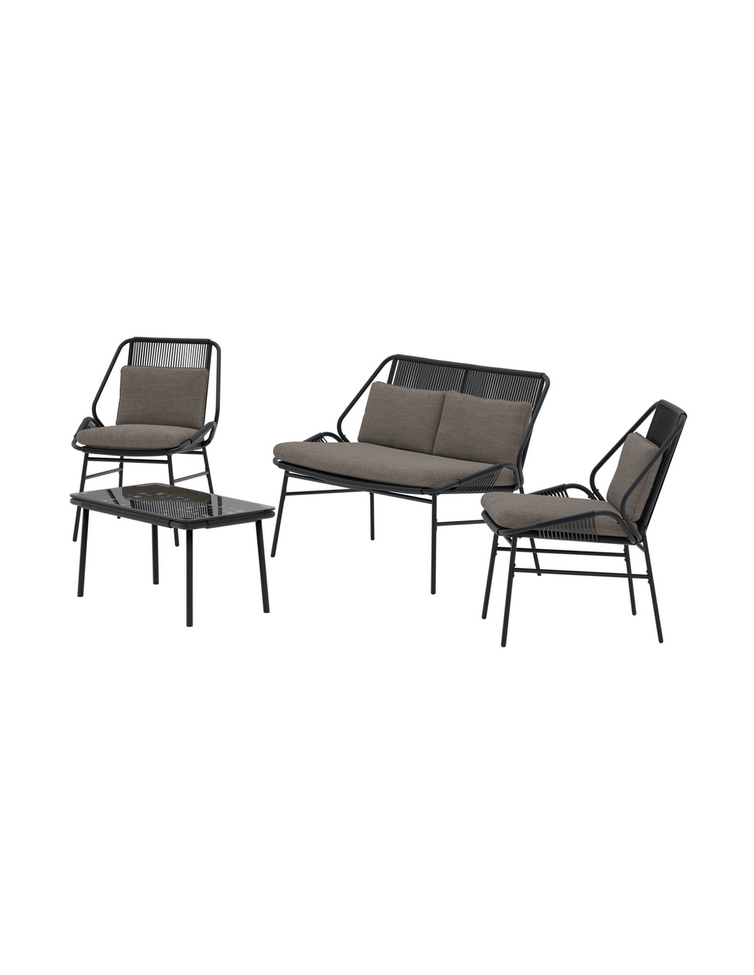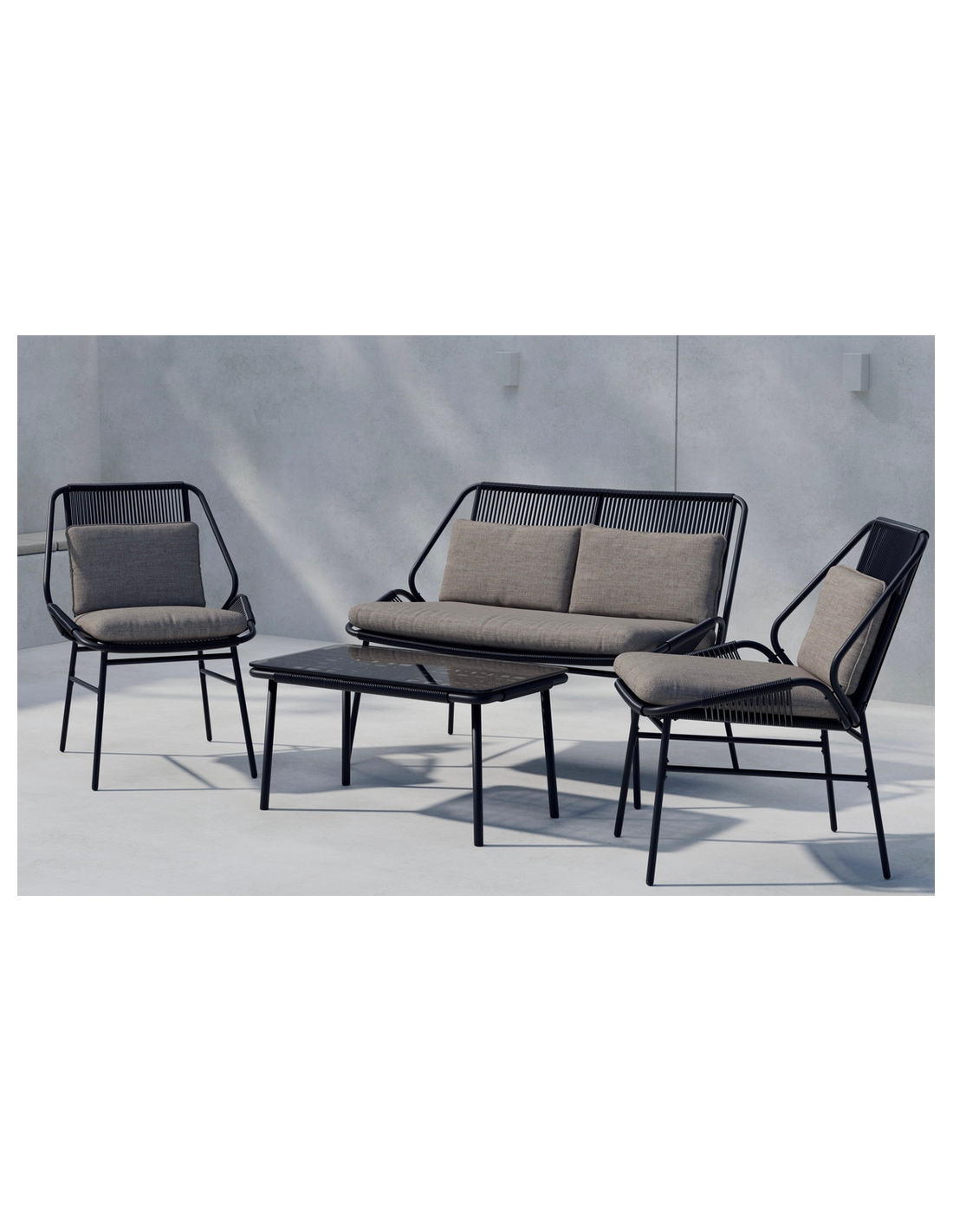 ZAKYN Loungesæt udført i et design af sortlakeret stål og polyestersnor, med hynder antracit polyester. Bordpladen er i hærdet glas. Sættet består af 1 sofa, 2 stole og 1 bord. Sættet tåler at stå ude i regnvejr, men hynder og puder bør opbevares indendørs, når sættet ikke er i brug.