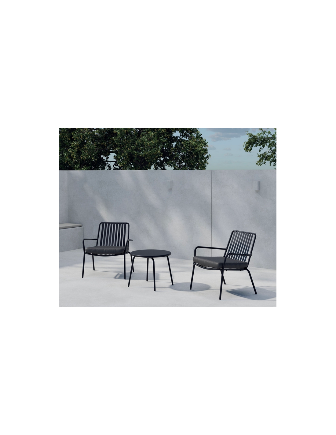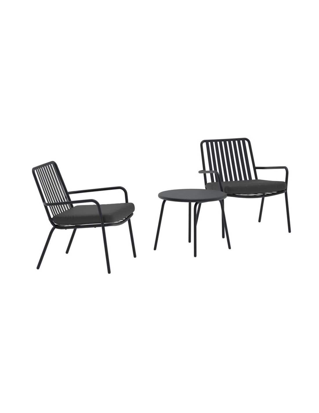 KONOS Loungesæt udført i et design af sortlakeret stål og med siddehynder sort polyester. Sættet består af 2 stole og 1 bord. Sættet tåler at stå ude i regnvejr, men hynder og puder bør opbevares indendørs, når sættet ikke er i brug.