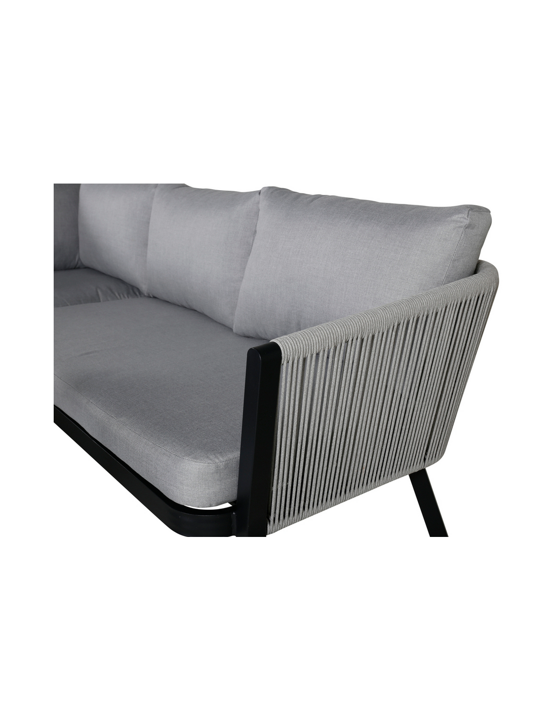 RYA Loungesofa med bord udført i et design af sortlakeret aluminium og grå polyesterreb med hynder i grå polyester med skumfyld. Sættet består af 1 hjørnesofa og 1 bord. Sættet tåler at stå ude i regnvejr, men vi anbefaler dog at hynder og puder opbevares indendørs, når sættet ikke er i brug.