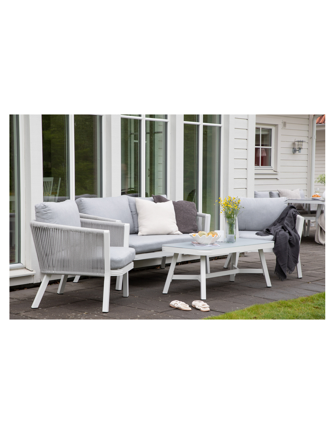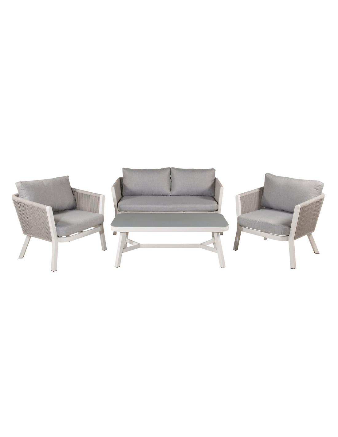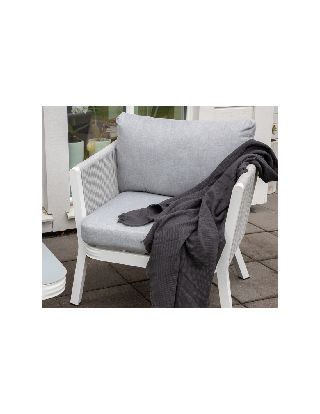 RYA Loungesæt udført i et design af hvidlakeret aluminium og grå polyesterreb med hynder i grå polyester med skumfyld. Sættet består af 1 sofa, 2 stole og 1 bord. Sættet tåler at stå ude i regnvejr, men vi anbefaler dog at hynder og puder opbevares indendørs, når sættet ikke er i brug.