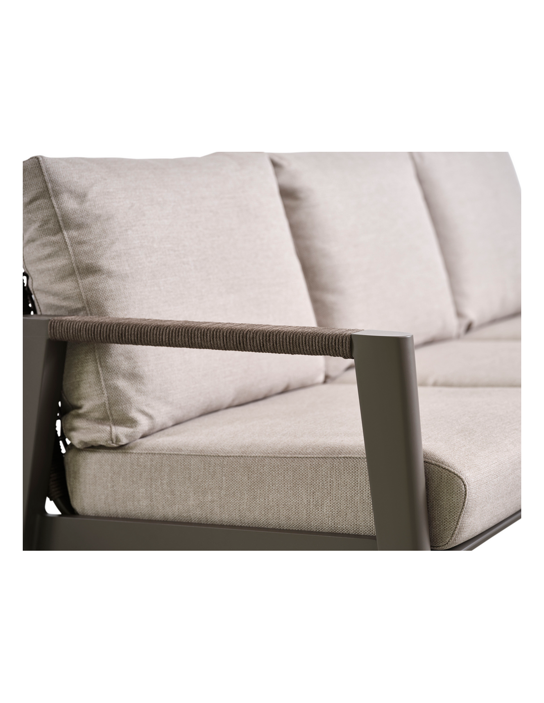 HAITI Loungesæt med 1 x havesofa, 2 x havestole og 1 x havebord, udført i et design af brunlakeret aluminium og champagne farvet polyestereb og hynder i matchende polyester med skumfyld. Et luksuriøst loungesæt til haven eller terrassen.