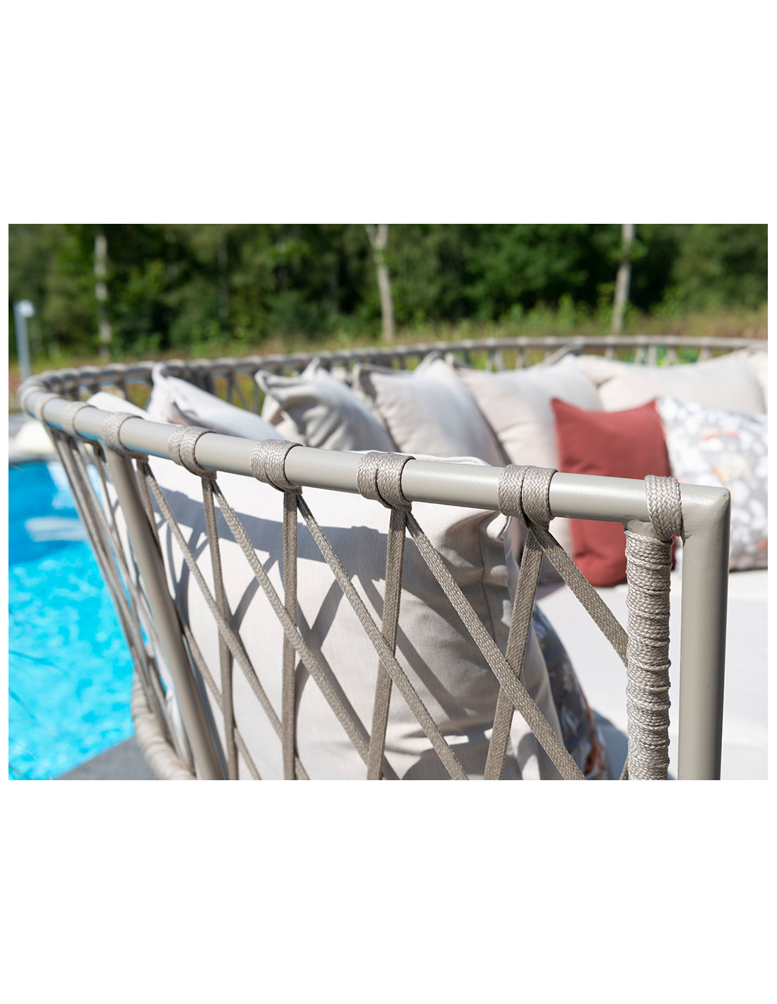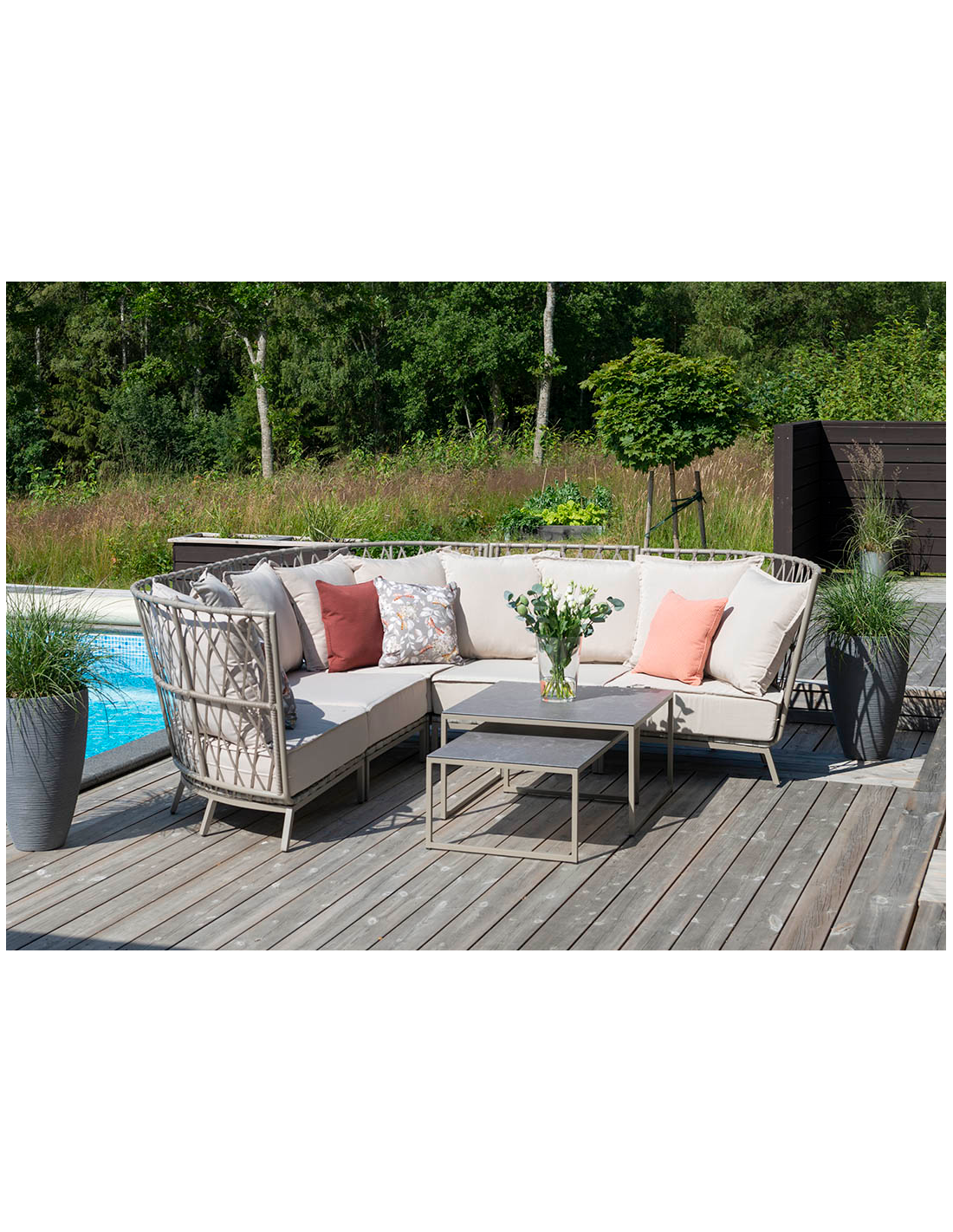 Moderne loungesofa til haven fra Svenske Hillerstorp, udført i et stilrent design af gråbeige lakeret aluminium og grå olefin, der er UV-resistent og vandafvisende. Sofaen måler 272 x 272 cm i bredde og dybde.