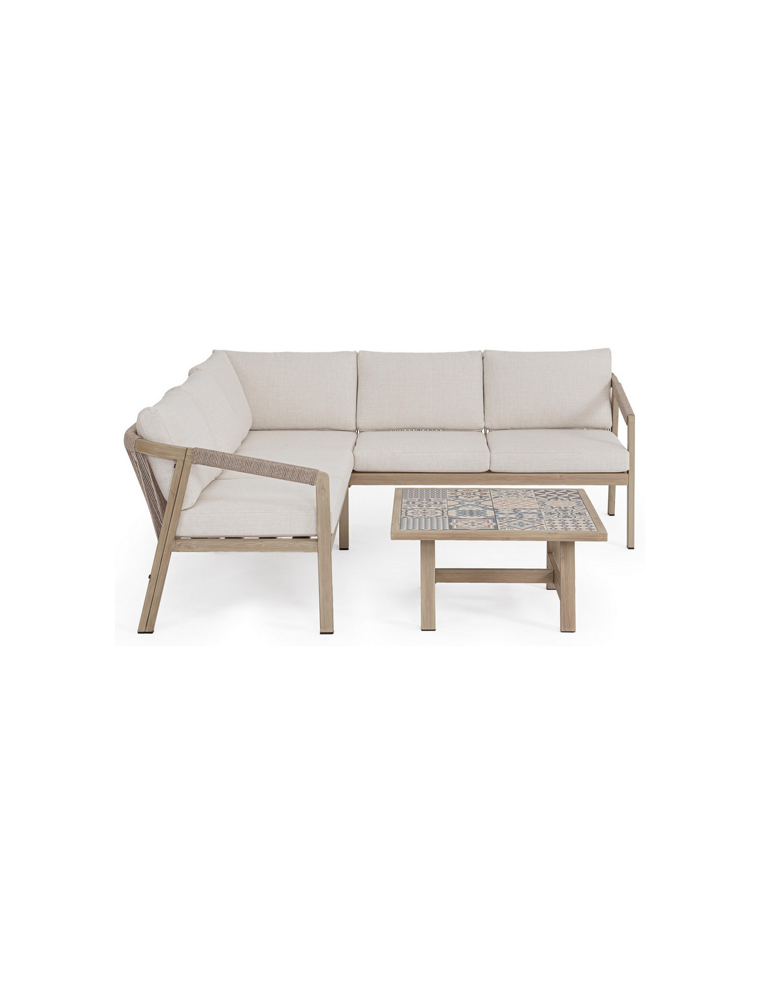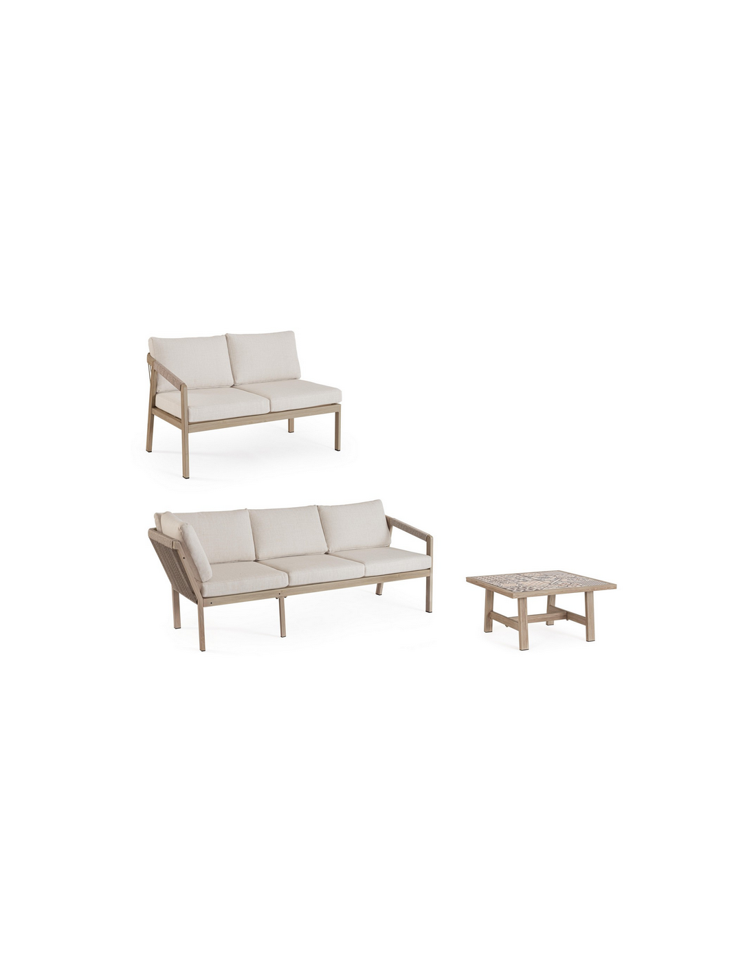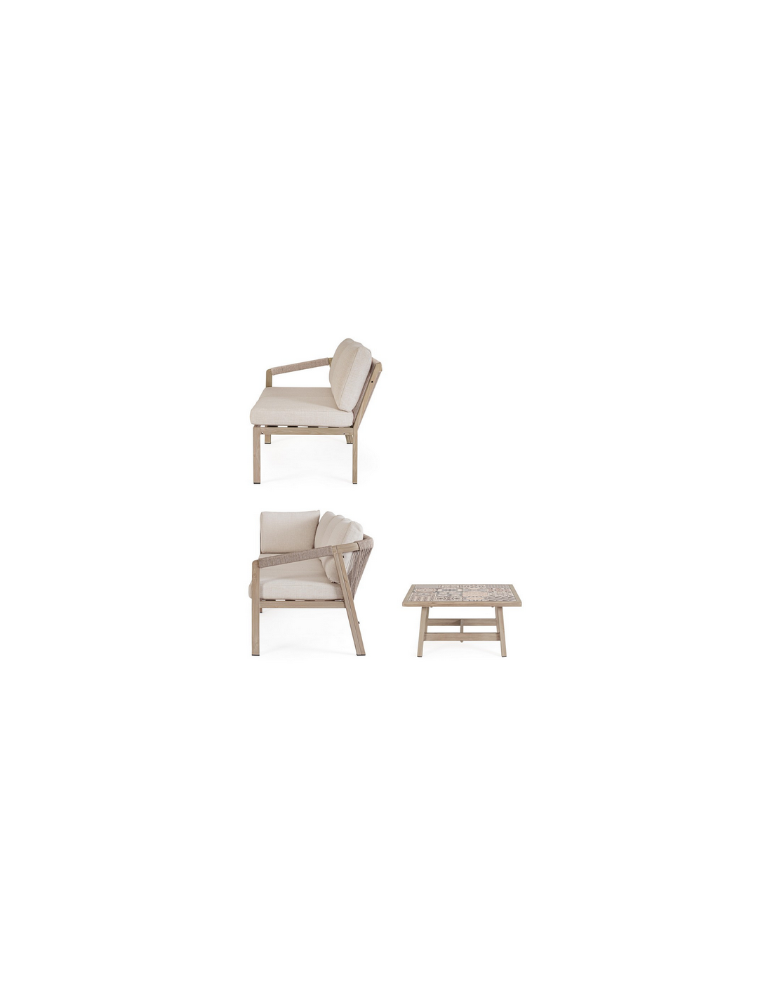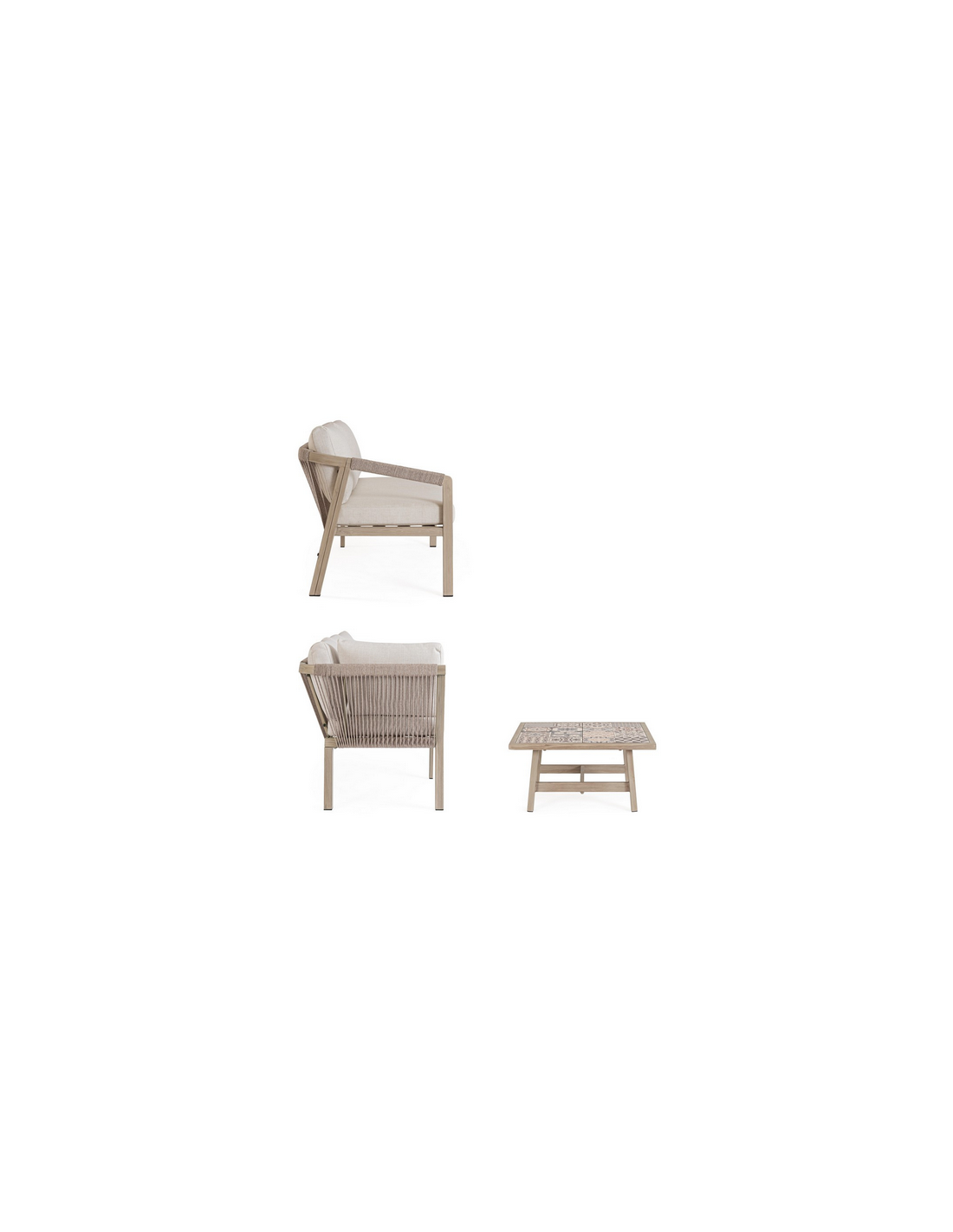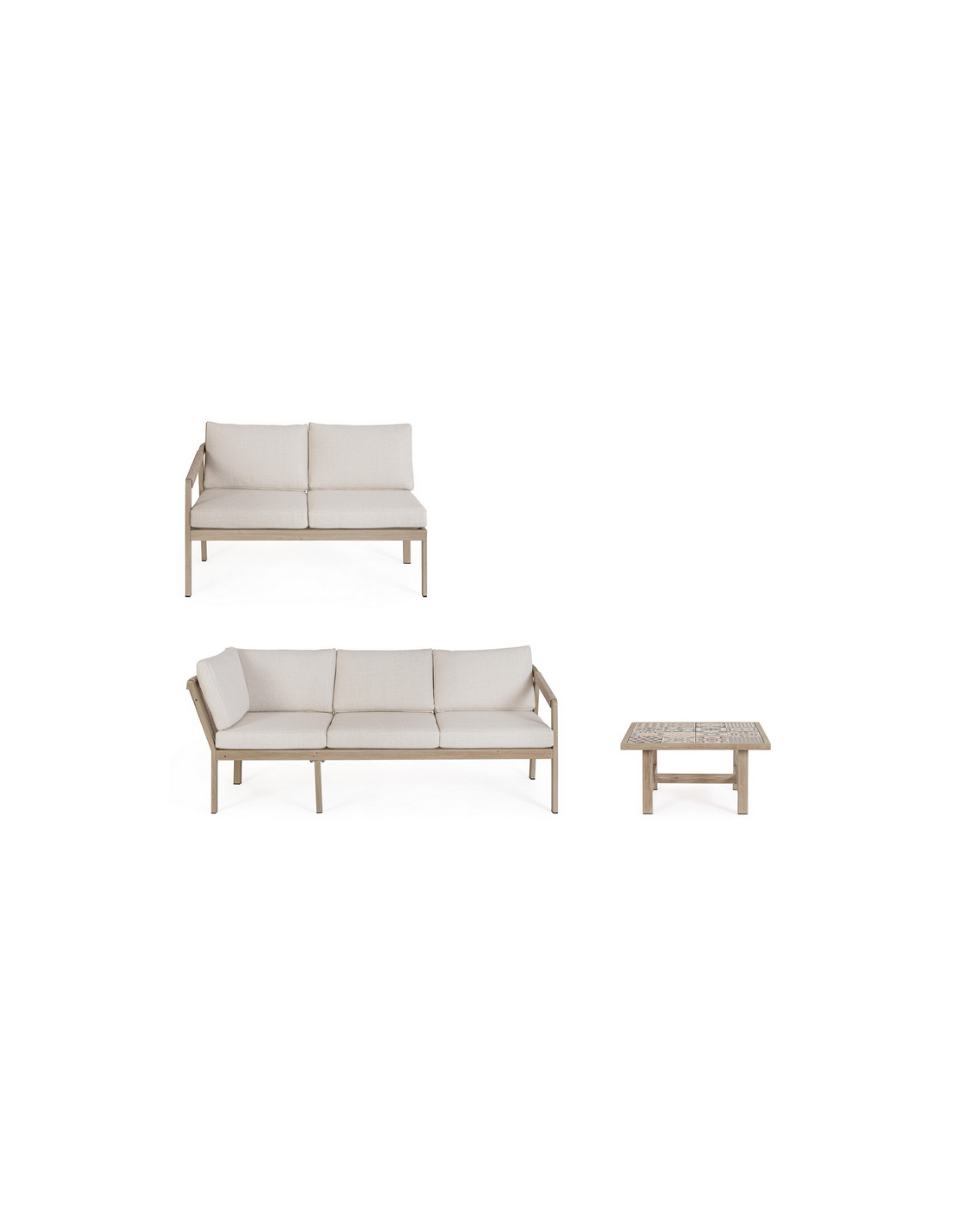KALI Loungesæt udført i et moderne design af aluminium med gråt trælook og sæde i beige UV-resistent og vandafvisende olefin med hurtigtørrende skumfyld.