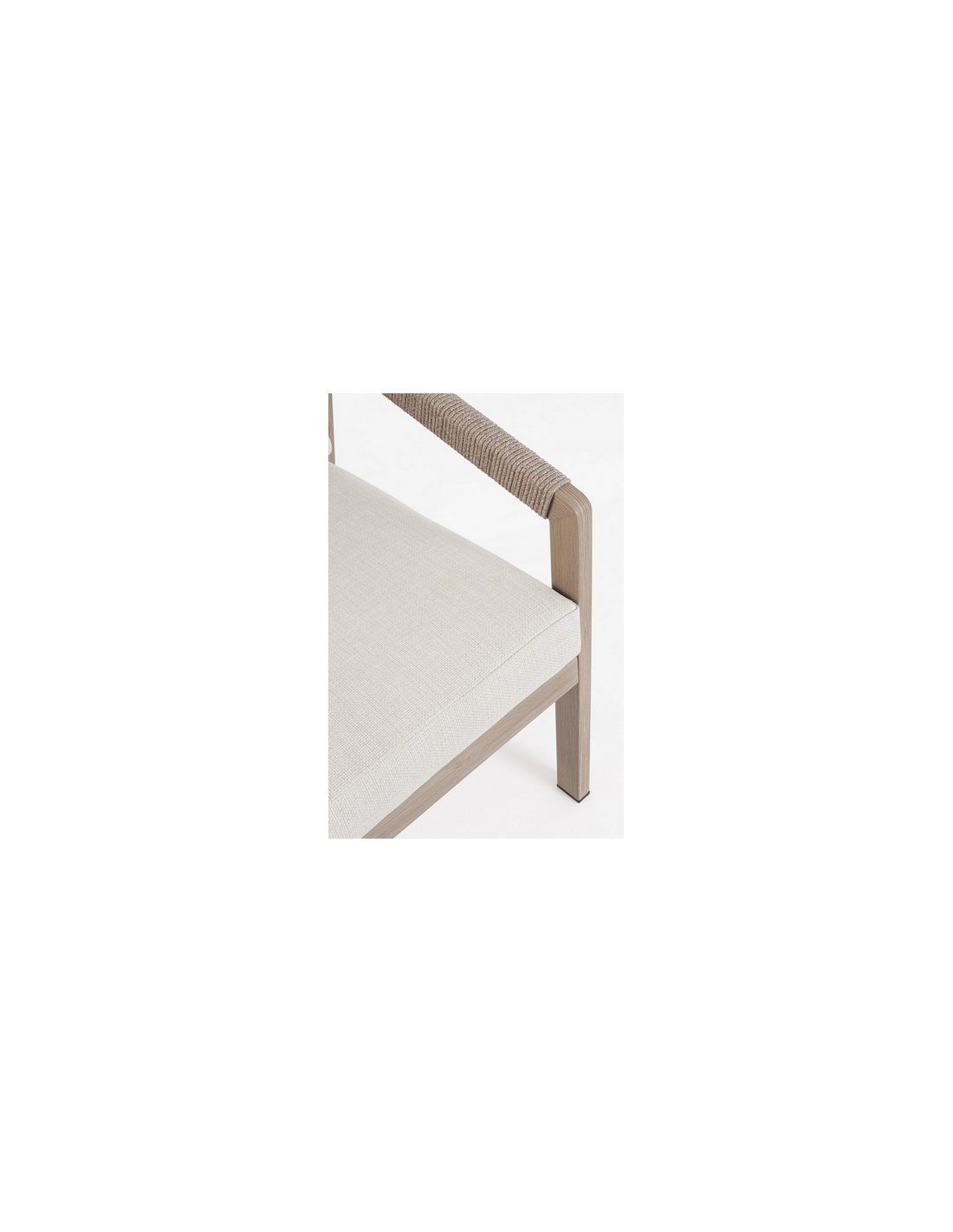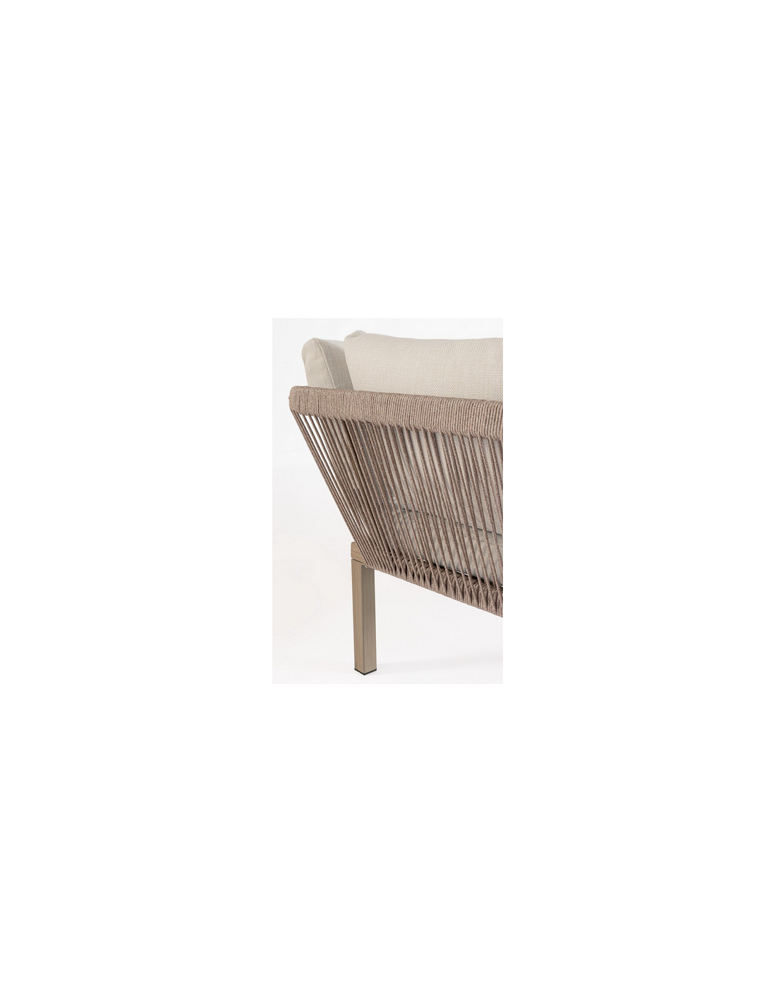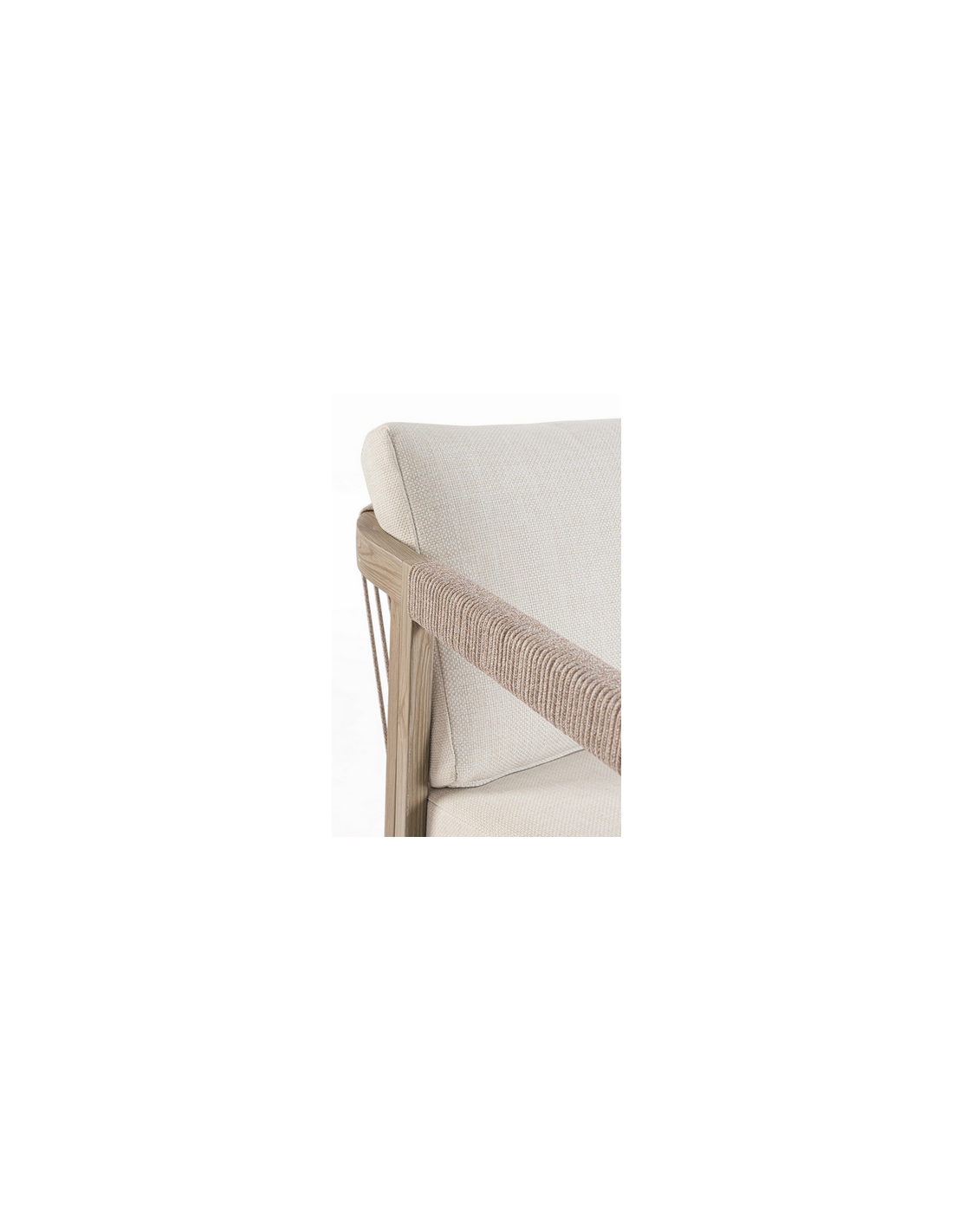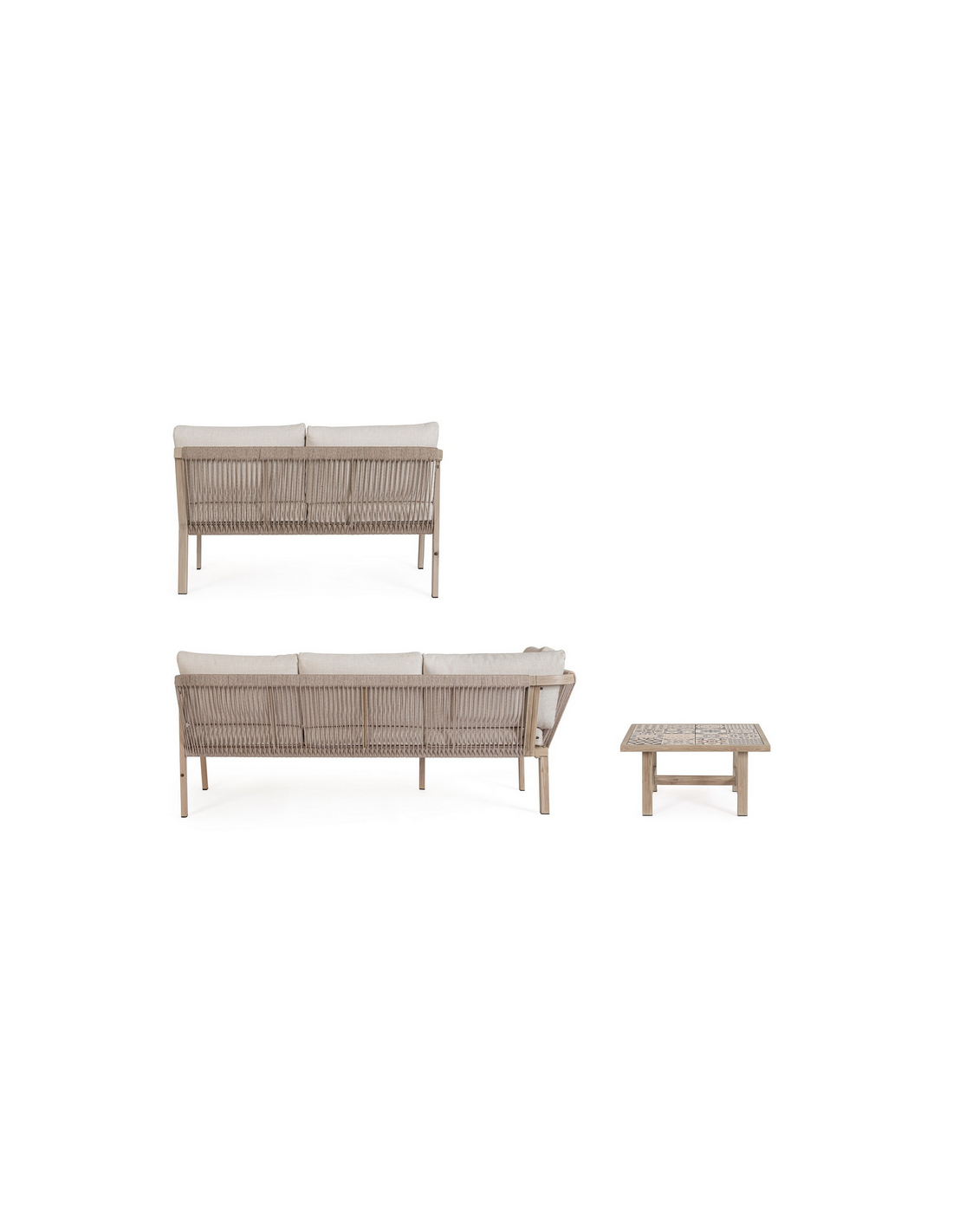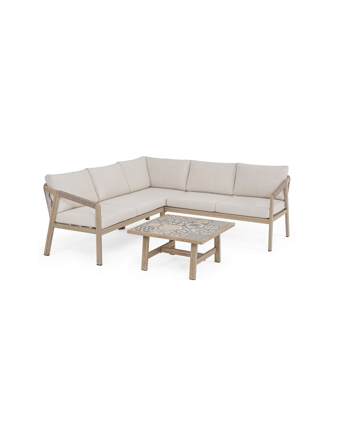 KALI Loungesæt udført i et moderne design af aluminium med gråt trælook og sæde i beige UV-resistent og vandafvisende olefin med hurtigtørrende skumfyld.