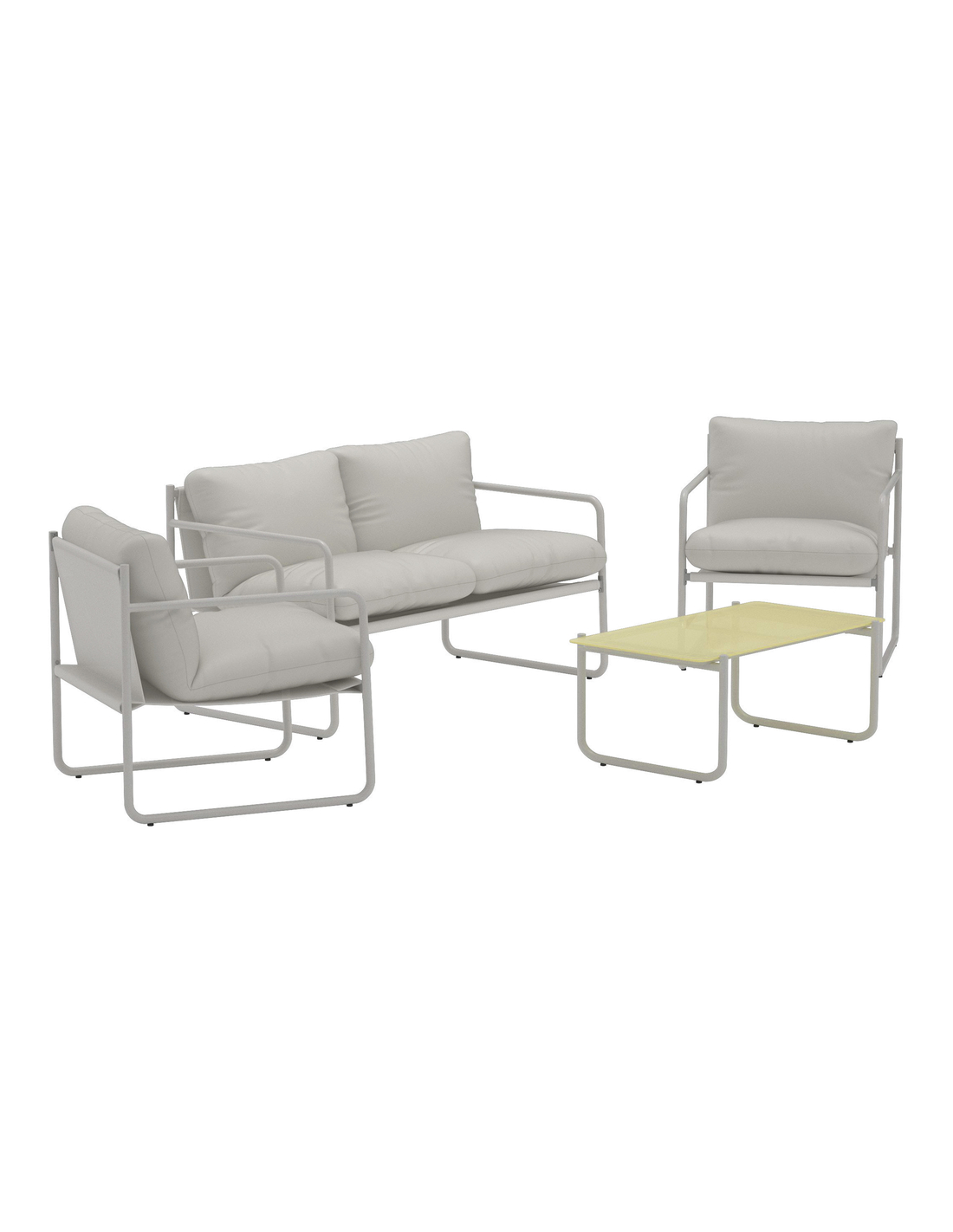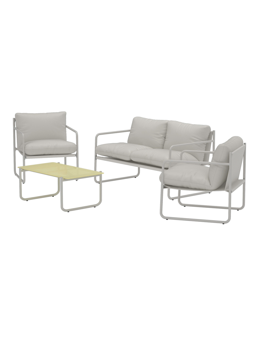 THASSOS Loungesæt udført i et design af grålakeret stål og polyester, med hynder grå polyester. Bordpladen er i hærdet glas. Sættet består af 1 sofa, 2 stole og 1 bord. Sættet tåler at stå ude i regnvejr, men hynder og puder bør opbevares indendørs, når sættet ikke er i brug.