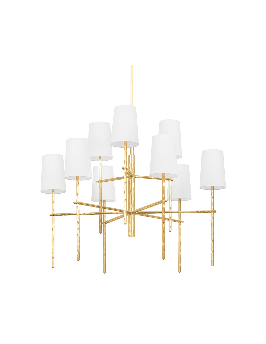 RIVER Lysekrone udført i et moderne design fremstillet i aldret hamret messinglakeret stål med skærme i hvidt linned. Lysekronen måler 88 - 194,4 cm i højden og 92 cm i diameter og anvender 9 x E14 lyskilder (Ekskl.).