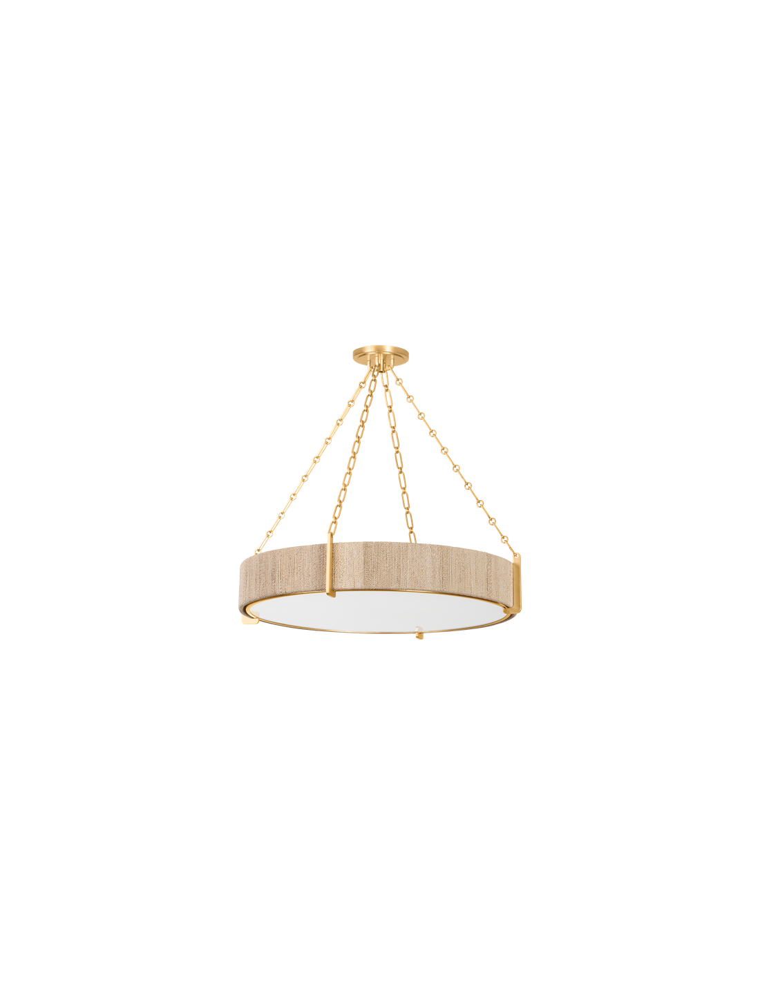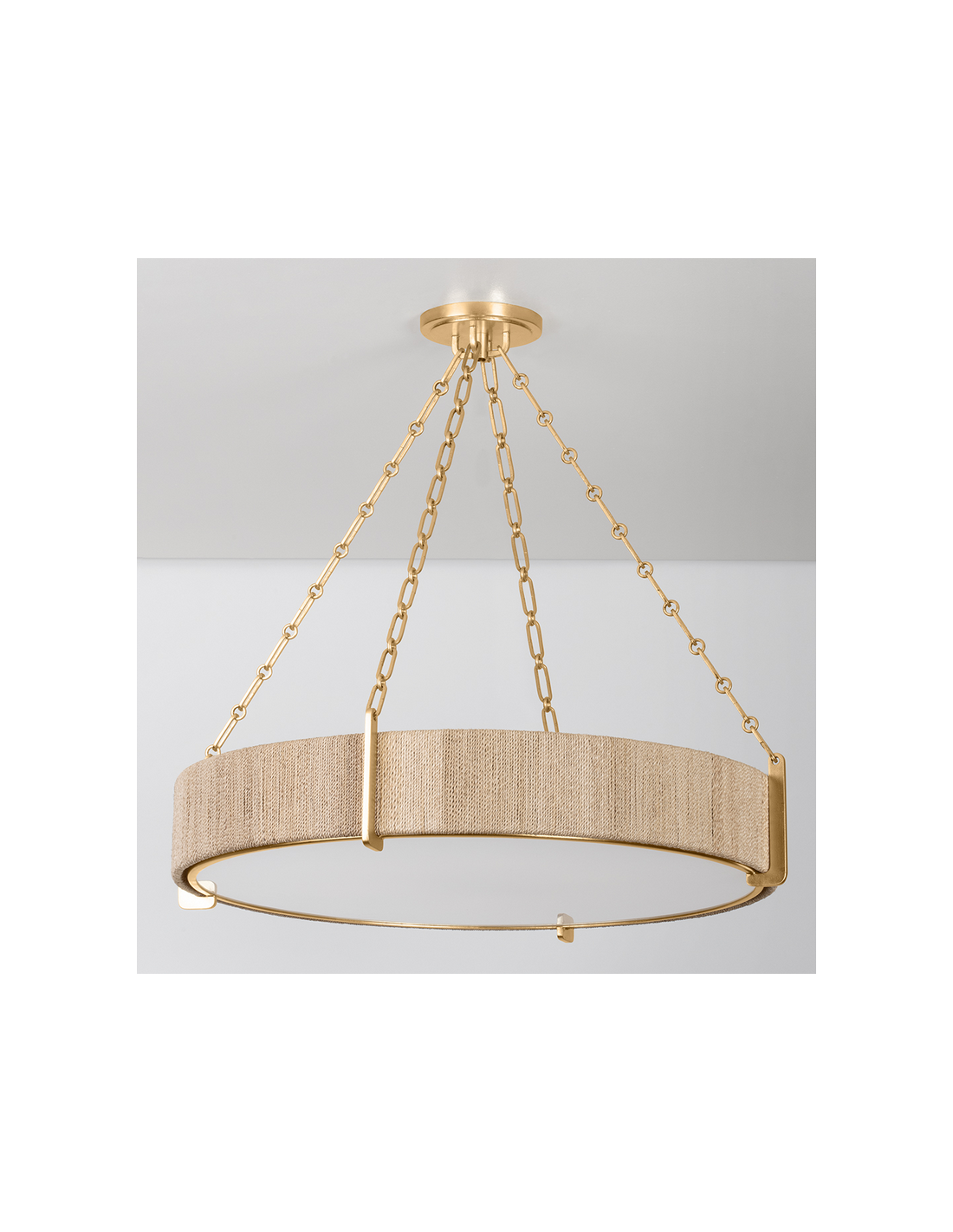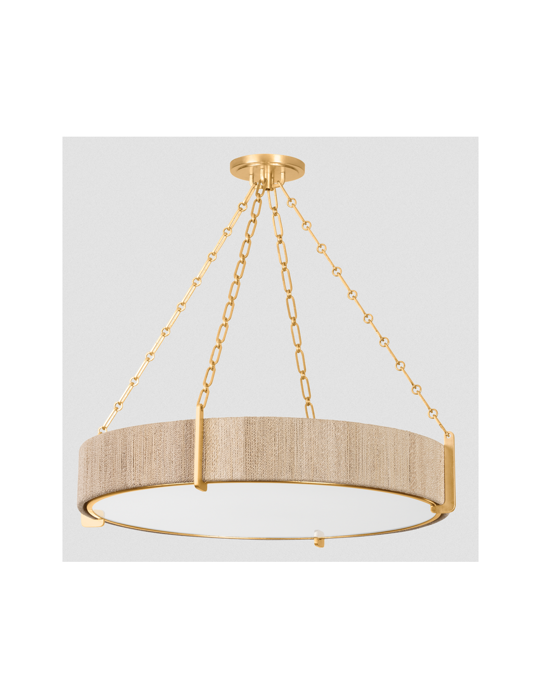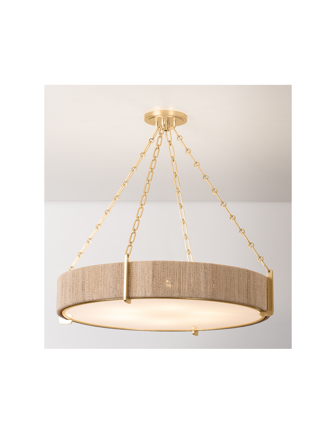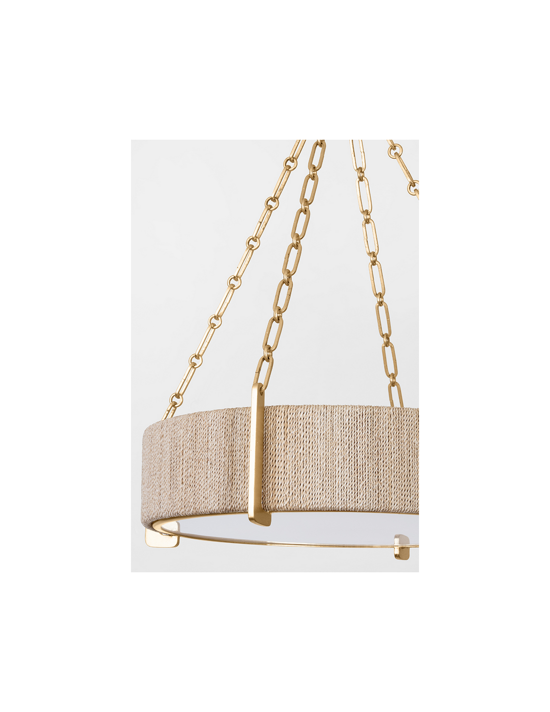 QUEBEC Lysekrone udført i et moderne design fremstillet i antik bladguld farvet stål med delvis beklædning af naturfarvet fiberreb. Hertil bundskærm i hvidt glas. Lysekronen måler 73,6 - 151,7 cm i højden og 77,8 cm i diameter og anvender 6 x E14 lyskilder (Ekskl.).