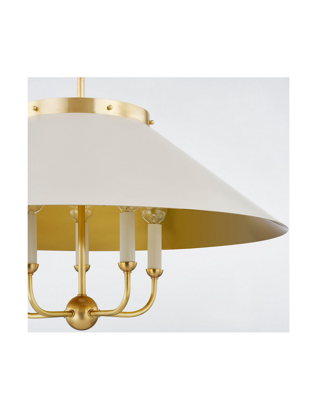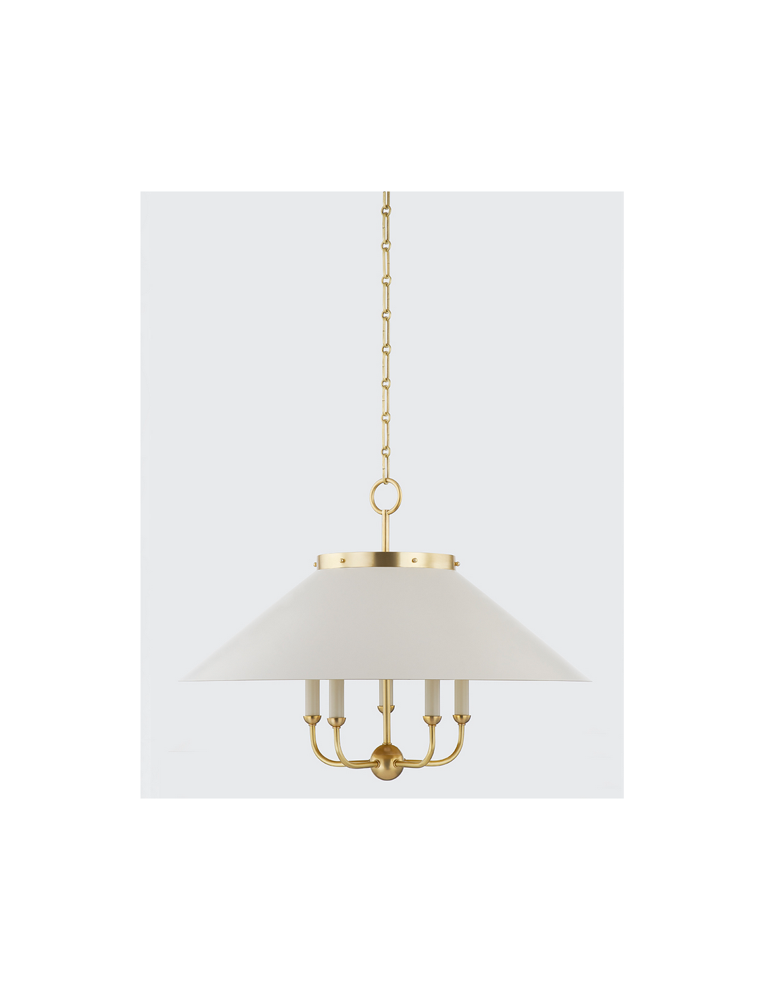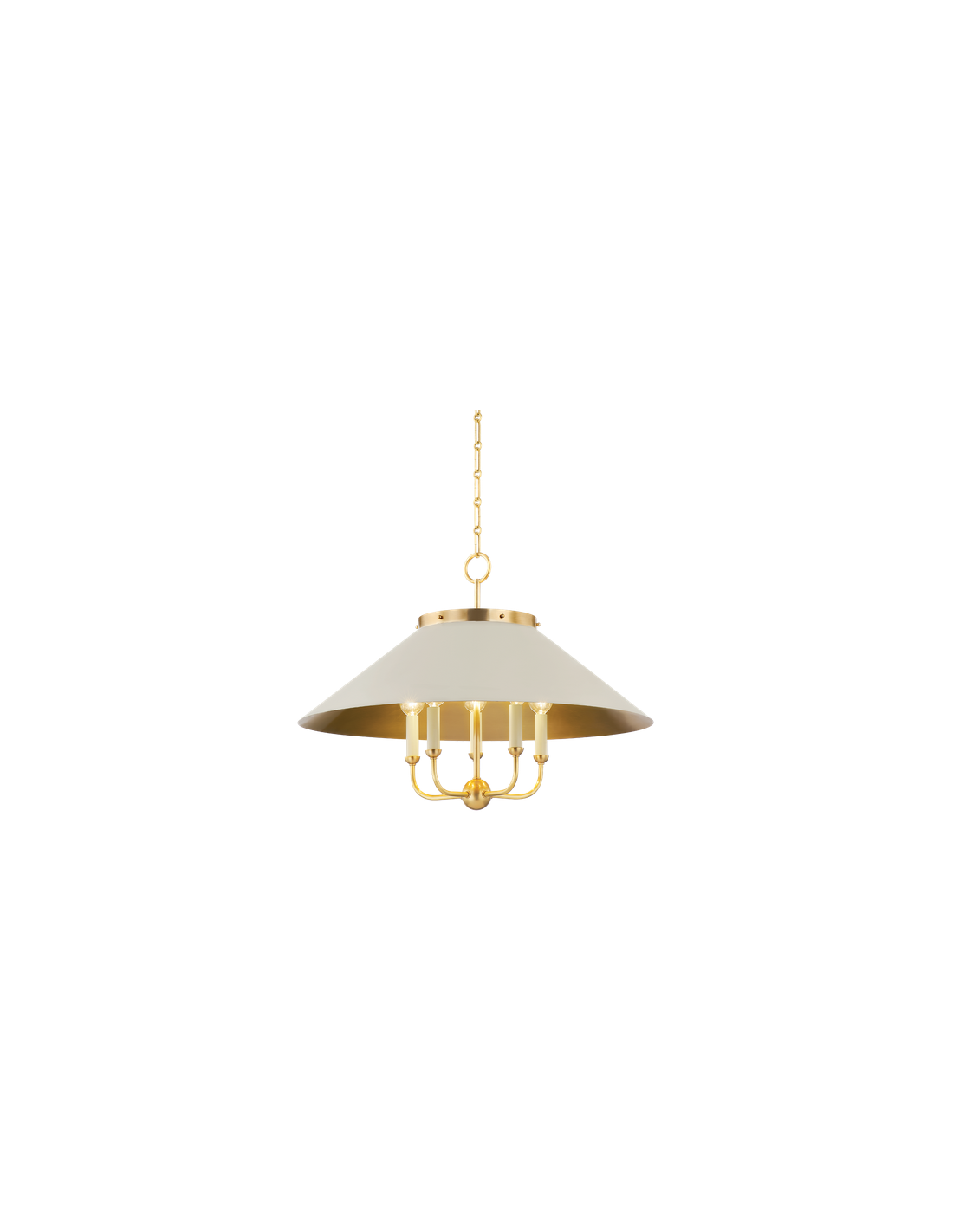 CLIVEDON Lysekrone udført i et moderne design fremstillet i aldret messing- og off-white lakeret stål. Lysekronen måler 62,9 - 192,5 cm i højden og 69,85 cm i diameter og anvender 5 x E27 lyskilder (Ekskl.).