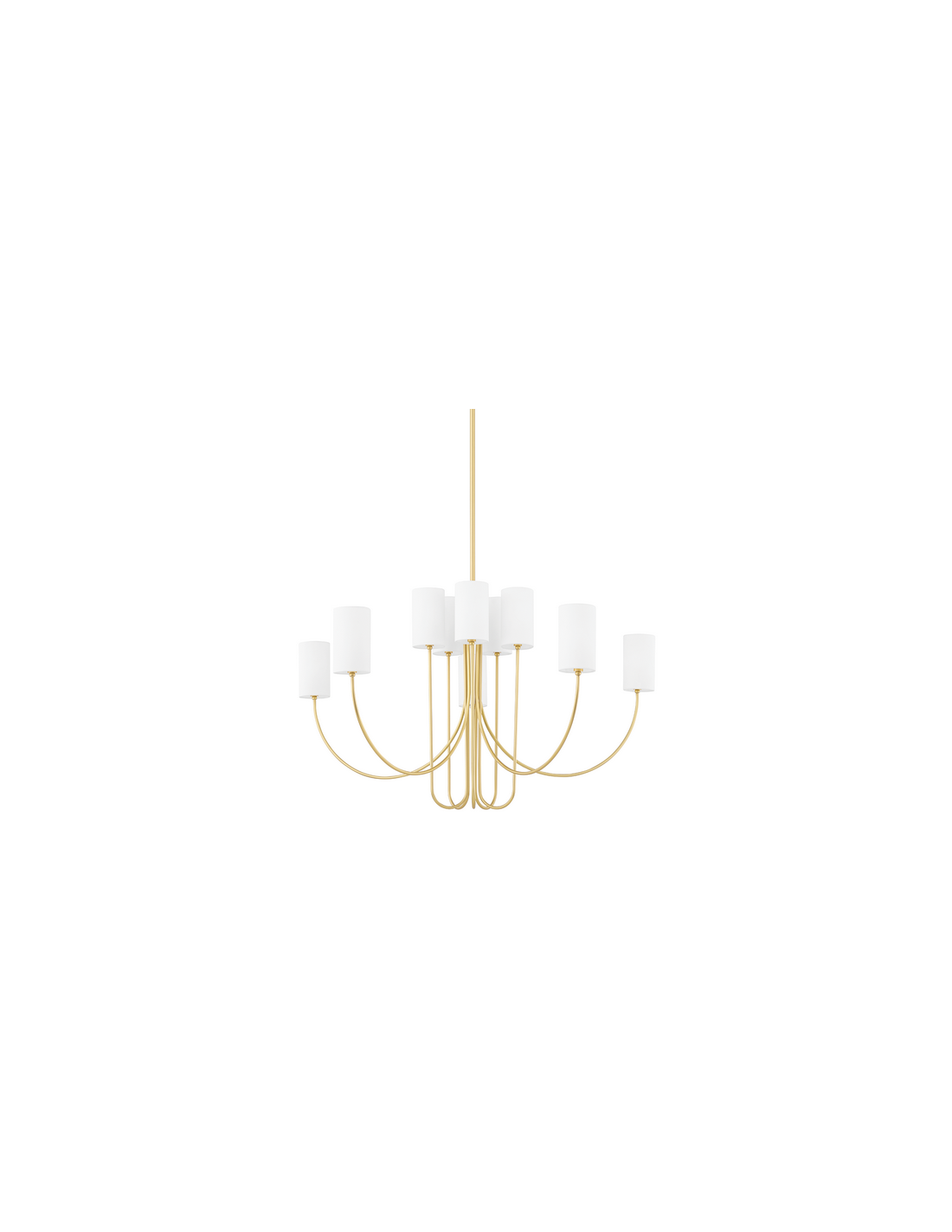 Lysekrone udført i et moderne design fremstillet i aldret messinglakeret stål med skærme i hvidt linned. Lysekronen måler 87,7 - 224,8 cm i højden og 122,56 cm i diameter og anvender 10 x E14 lyskilder (Ekskl.).