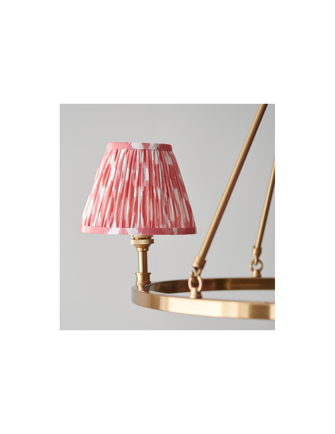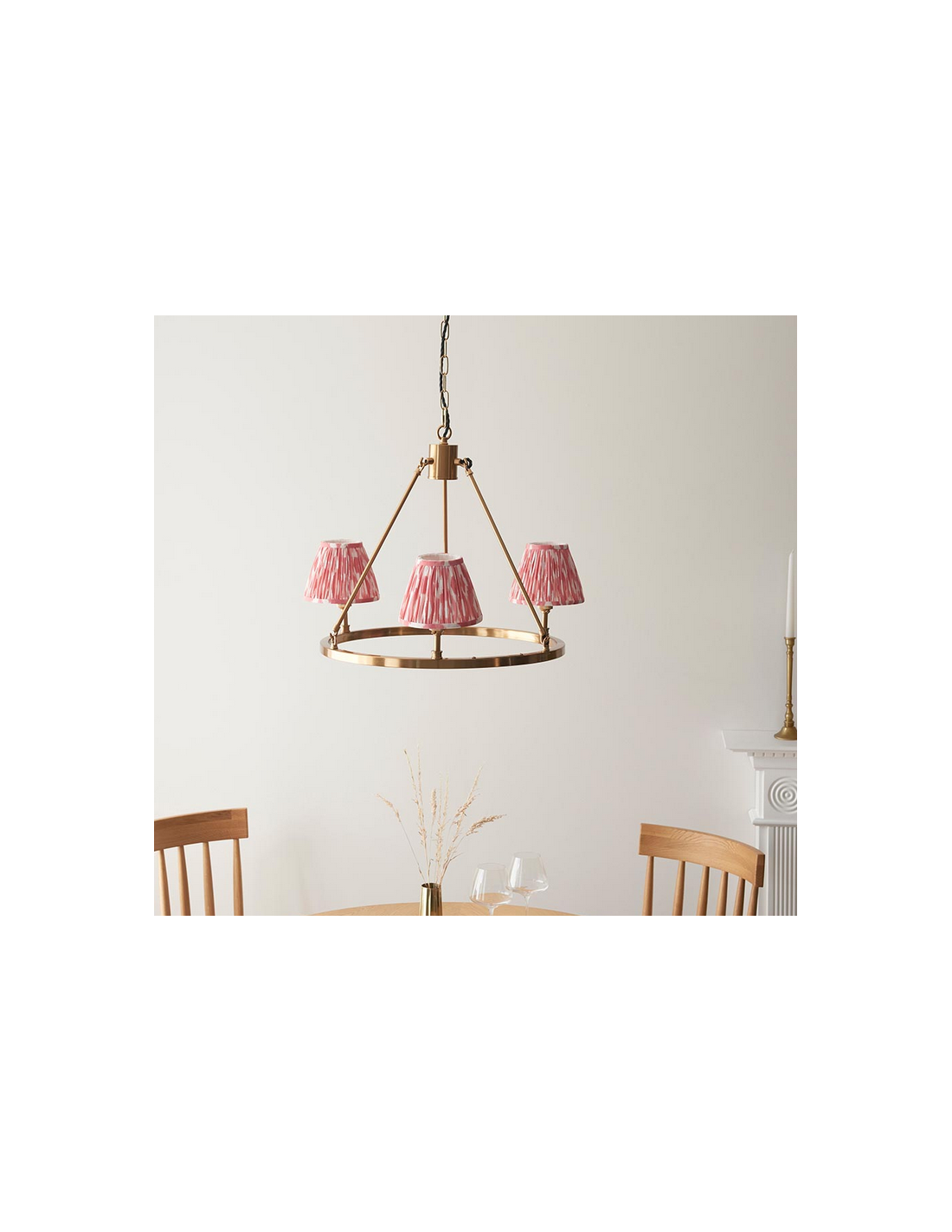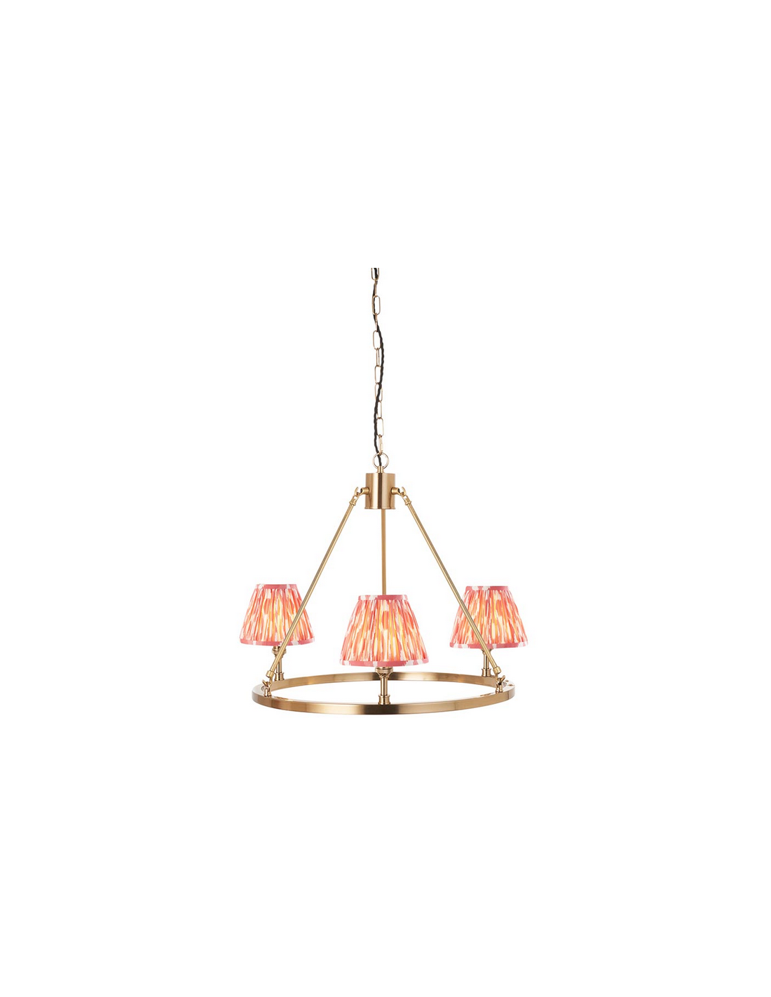 CHESTER Lysekrone udført i et luksuriøst design af antik messinglakeret stål og med skærme i koralrød faux silke. Lysekronen måler 66 cm i diameter og anvender 3 x B22 lyskilder (ekskl.).