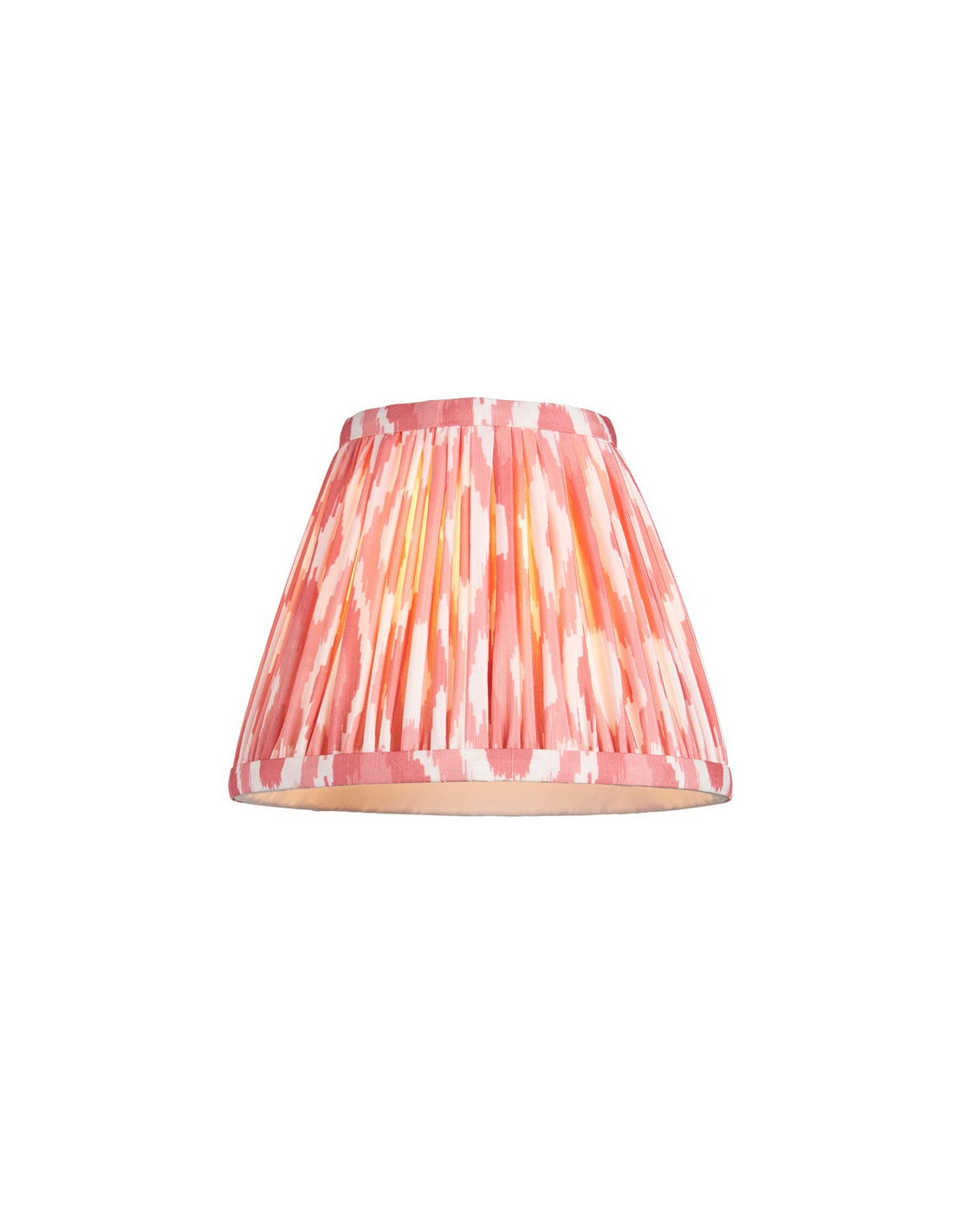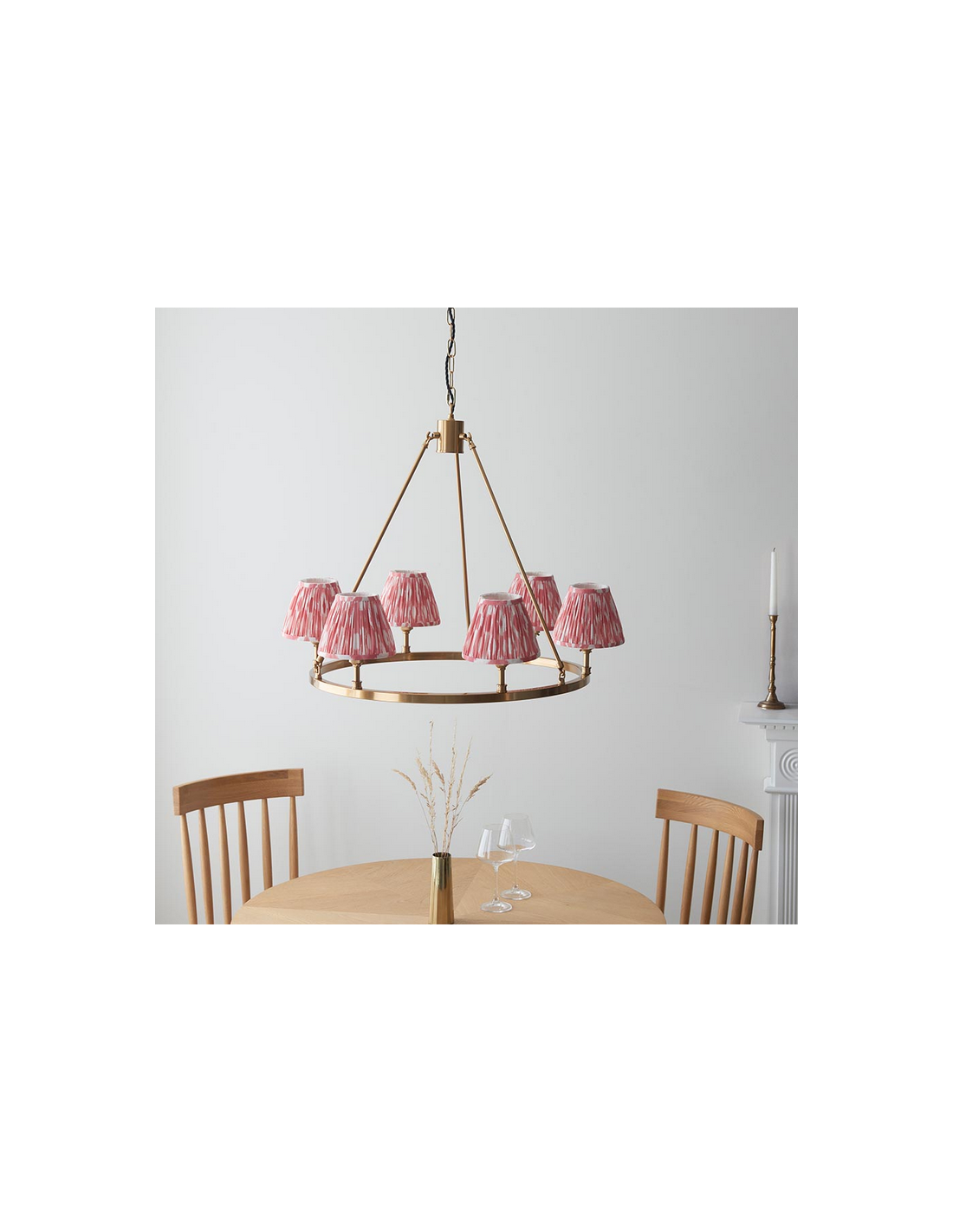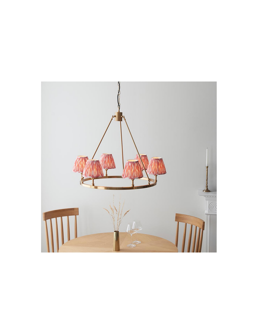 CHESTER Lysekrone udført i et luksuriøst design af antik messinglakeret stål og med skærme i koralrød faux silke. Lysekronen måler 78 cm i diameter og anvender 6 x B22 lyskilder (ekskl.).