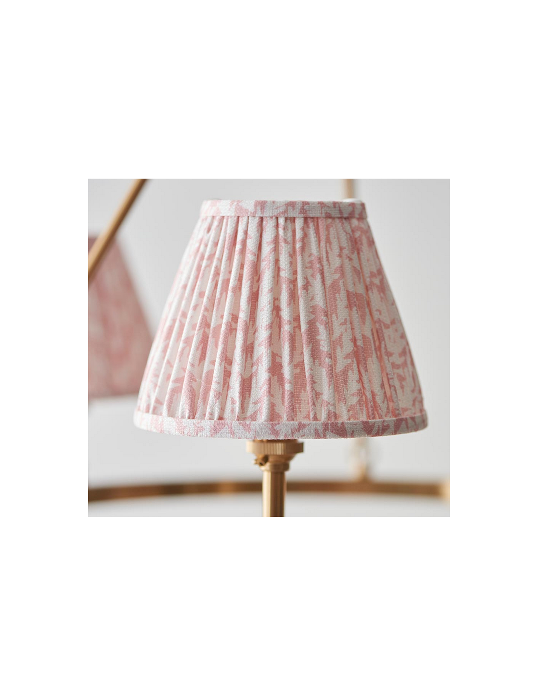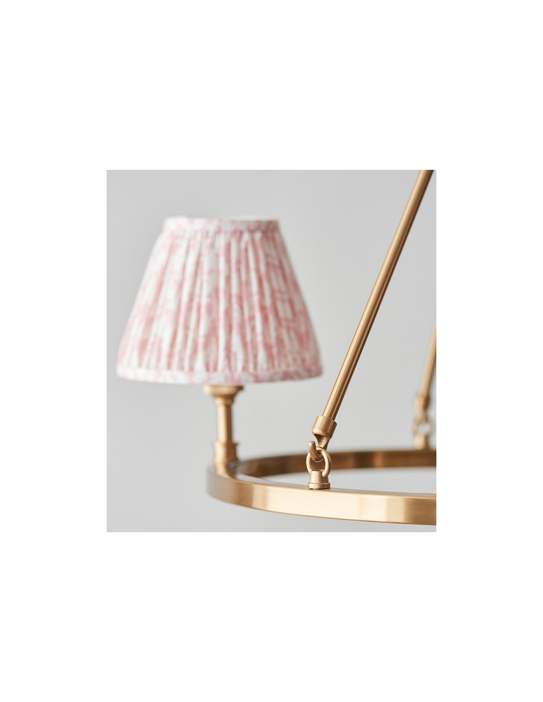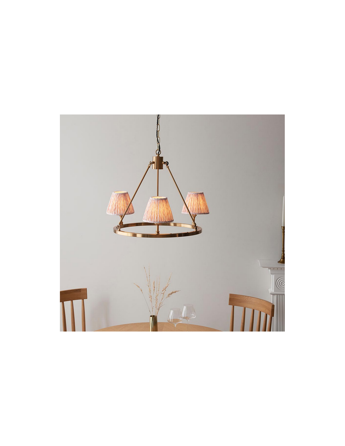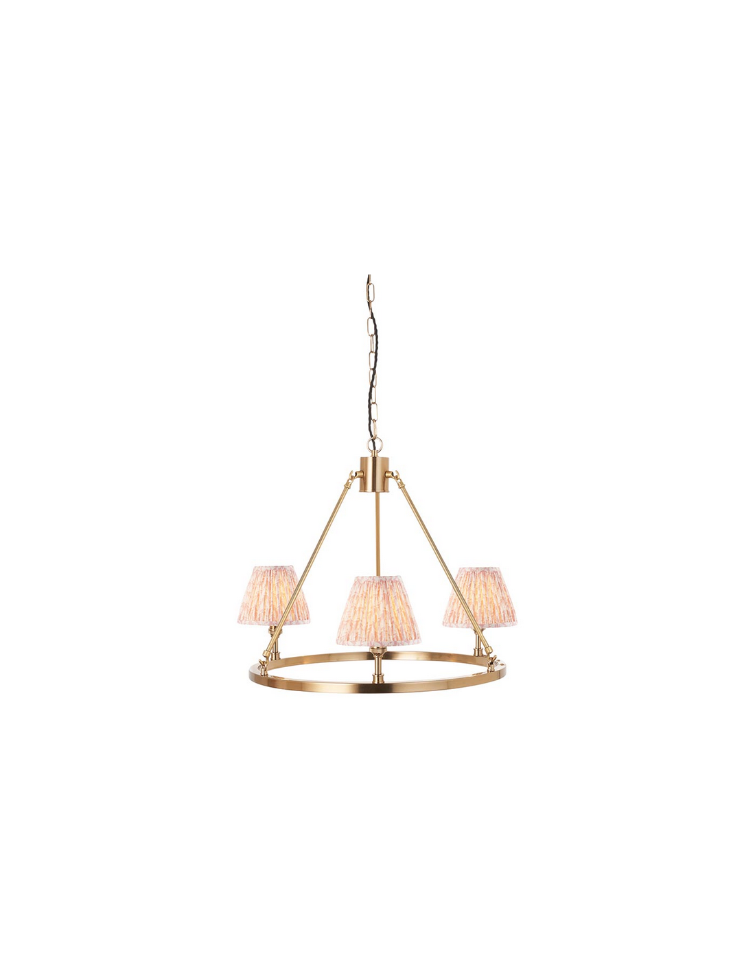 CHESTER Lysekrone udført i et luksuriøst design af antik messinglakeret stål og med skærme i ferskenfarvet faux silke. Lysekronen måler 66 cm i diameter og anvender 3 x B22 lyskilder (ekskl.).