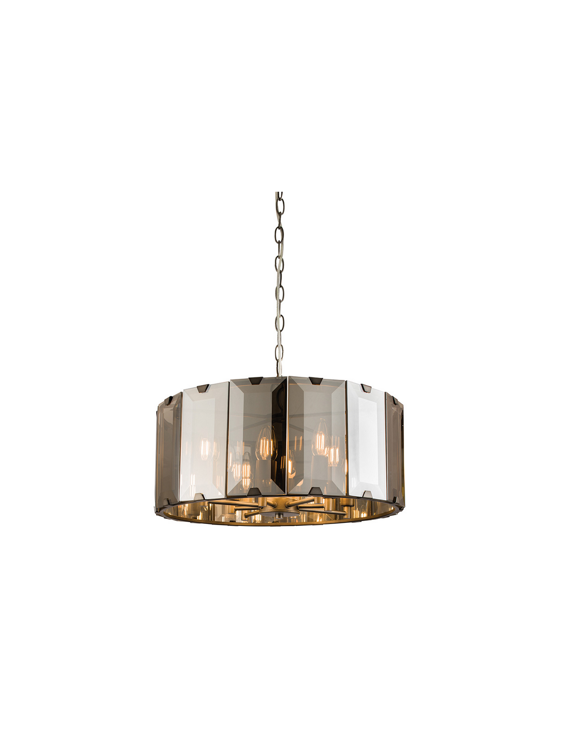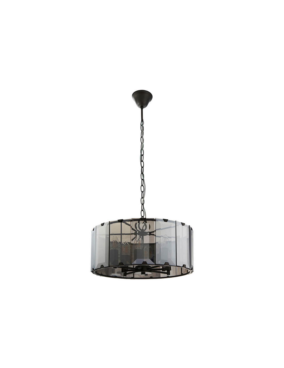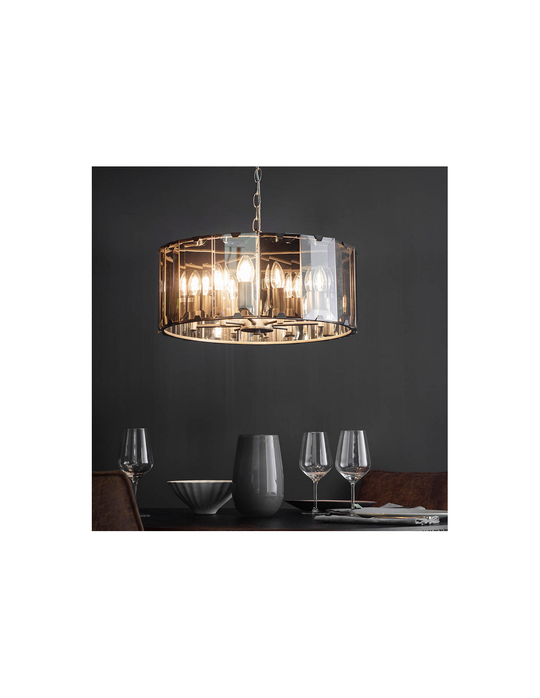 CLOONEY Lysekrone udført i et luksuriøst design af antik gråsortlakeret stål og med skærm i røget glas. Lysekronen måler 50 cm i diameter og anvender 8 x E14 lyskilder (ekskl.).