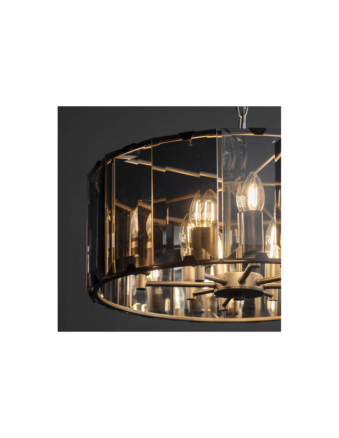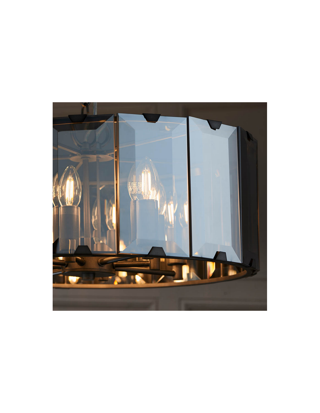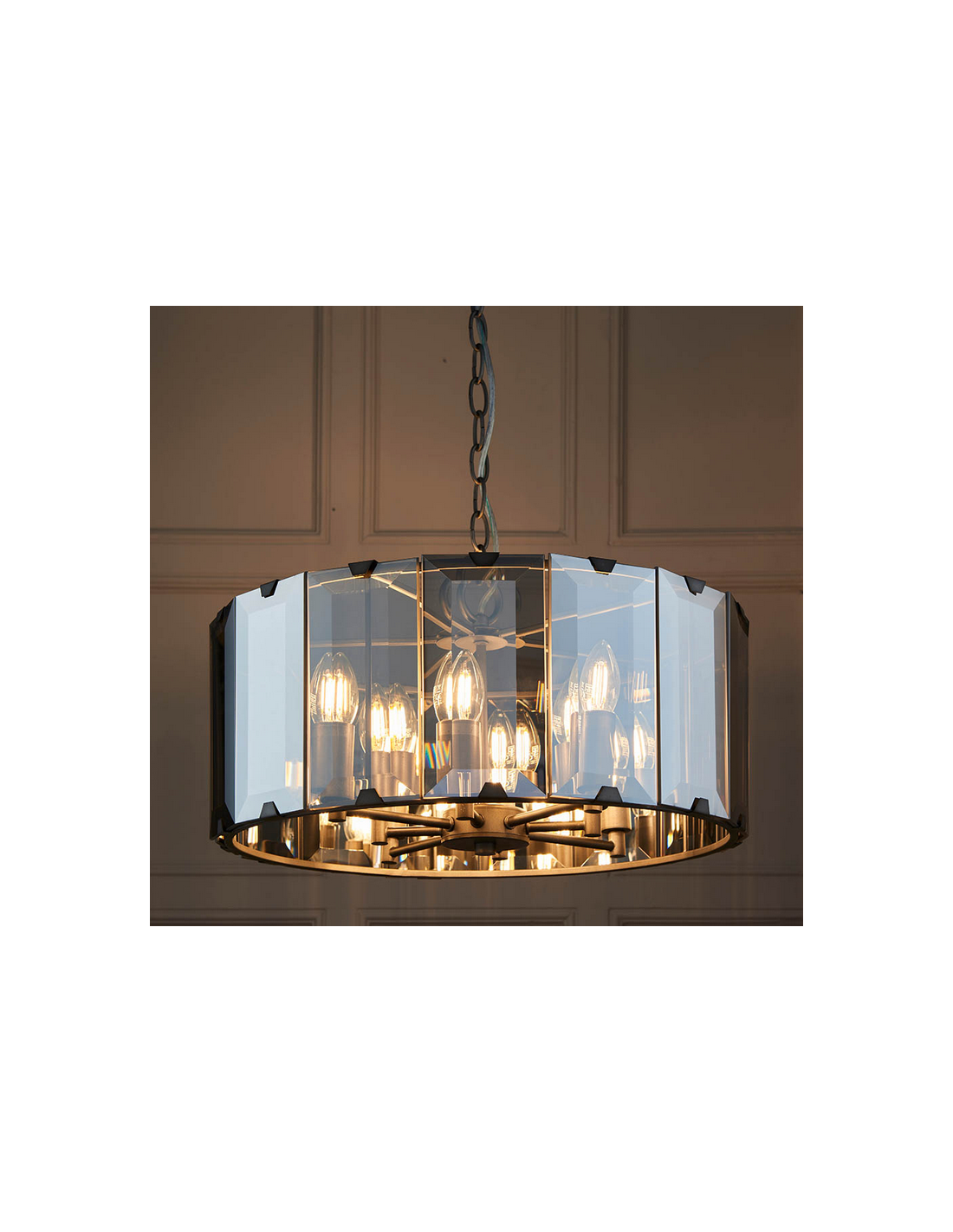 CLOONEY Lysekrone udført i et luksuriøst design af antik gråsortlakeret stål og med skærm i røget glas. Lysekronen måler 50 cm i diameter og anvender 8 x E14 lyskilder (ekskl.).