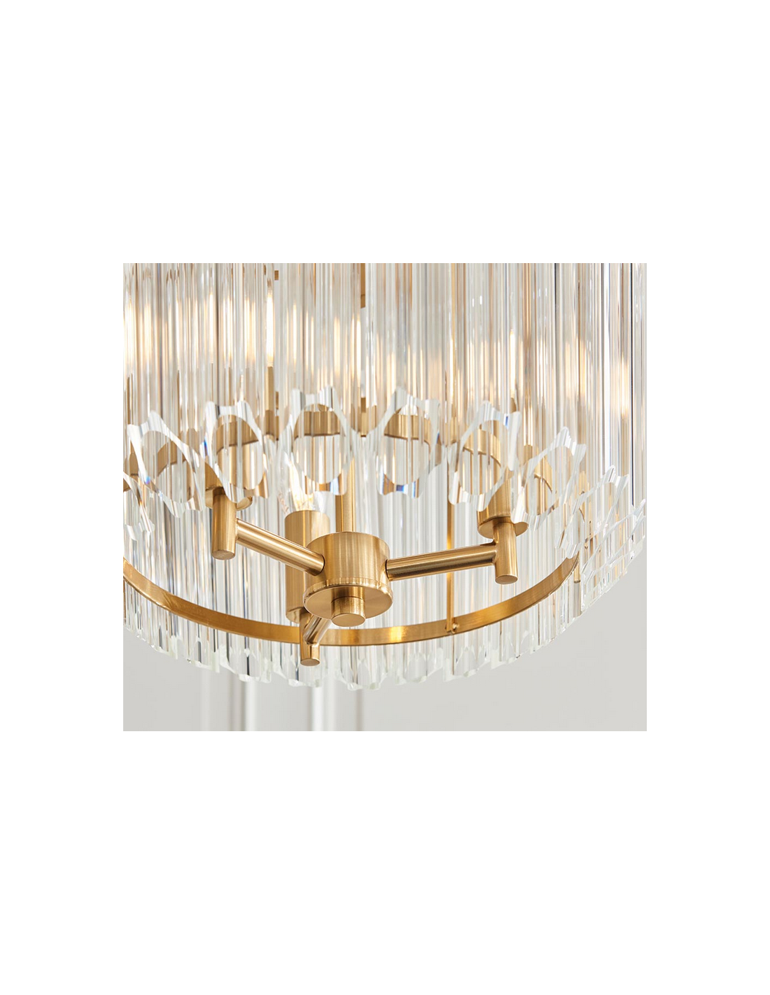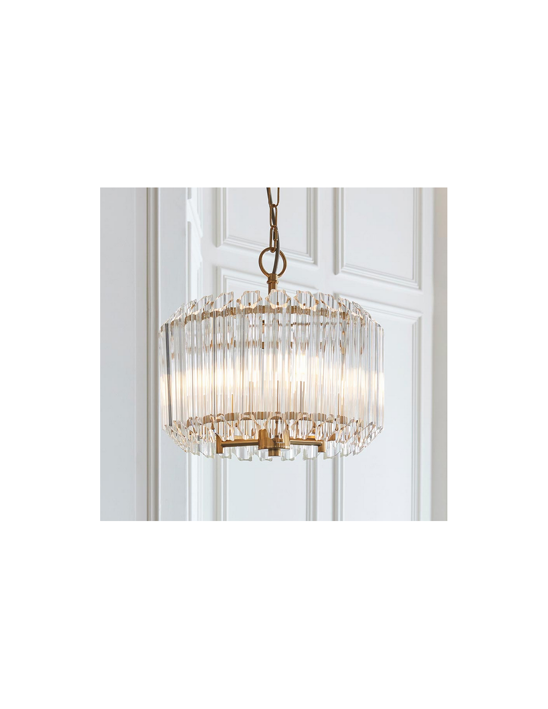VALENTINA Lysekrone udført i et luksuriøst design af børstet messinglakeret stål og med skærm i klart glas. Lysekronen måler 36 cm i diameter og anvender 3 x E14 lyskilder (ekskl.).