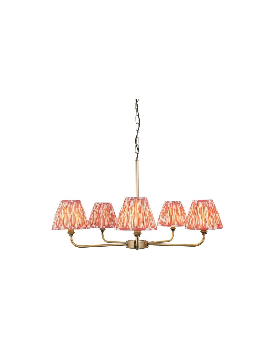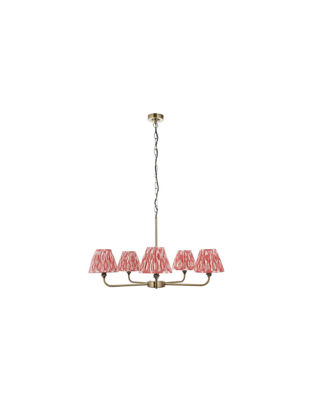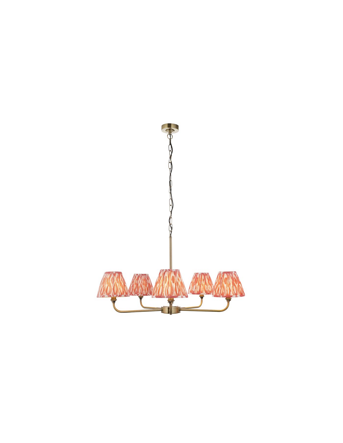 Lysekrone udført i et luksuriøst design af antik messinglakeret stål og med skærme i koralrød faux silke. Lysekronen måler 79 cm i diameter og anvender 5 x B22 lyskilder (ekskl.).