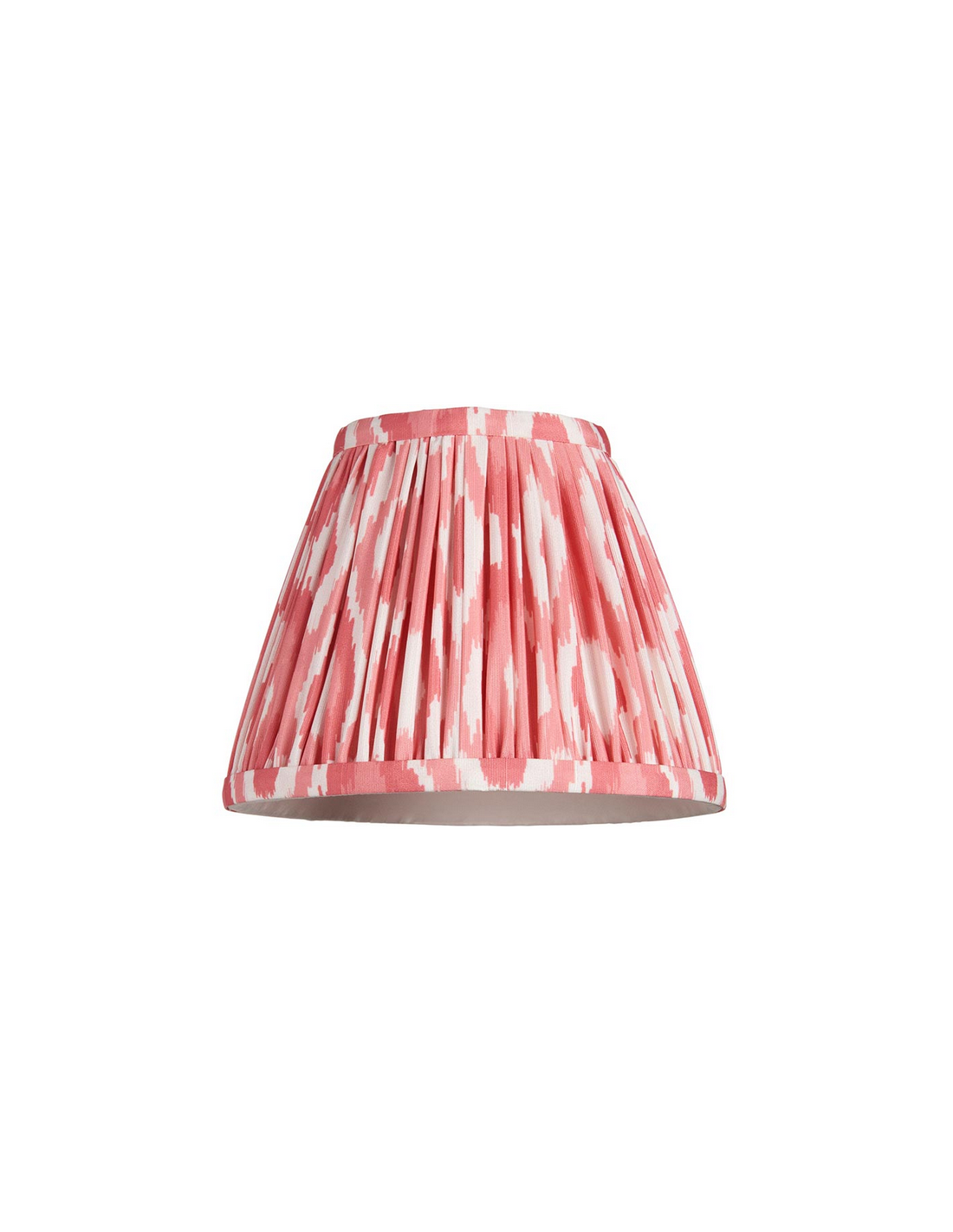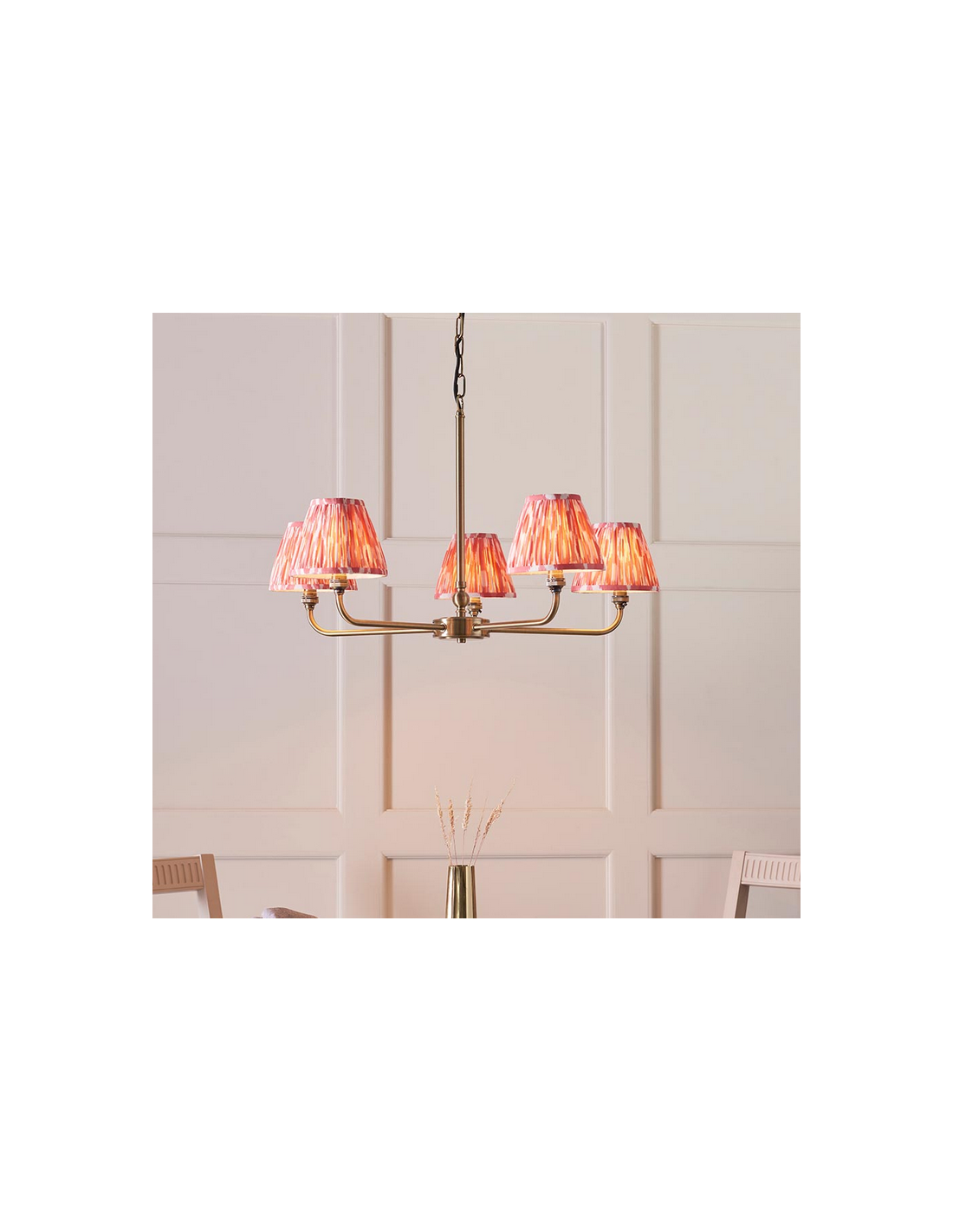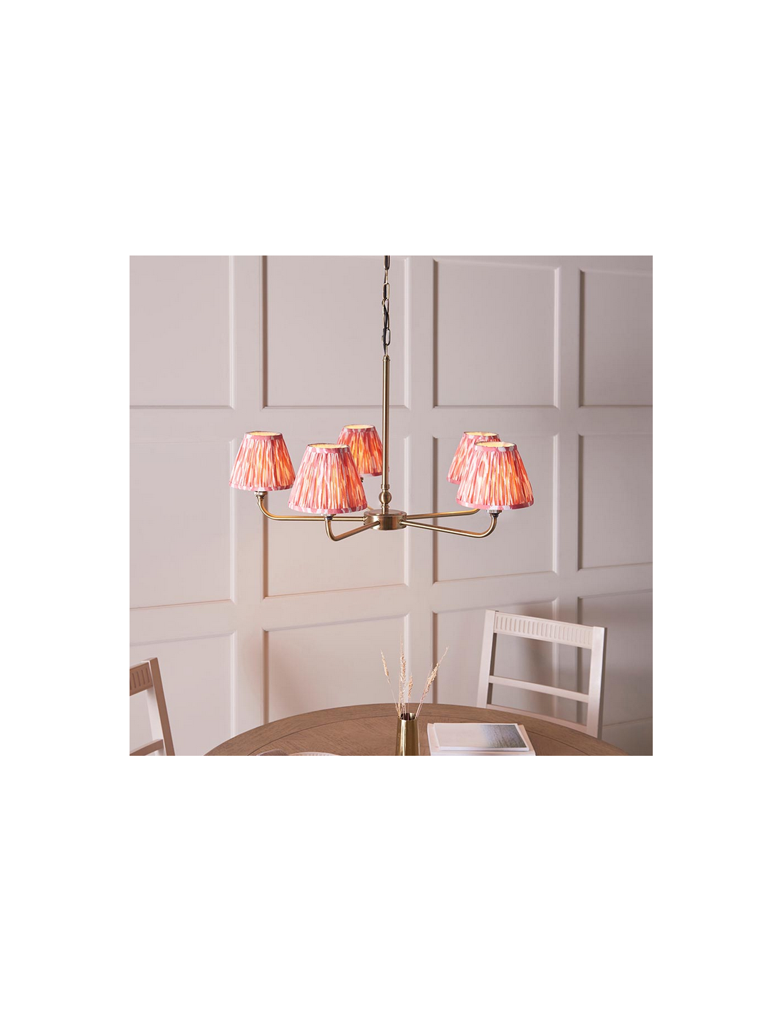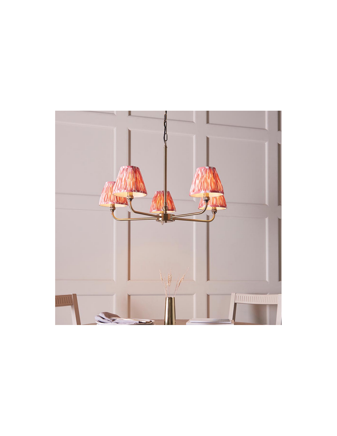 Lysekrone udført i et luksuriøst design af antik messinglakeret stål og med skærme i koralrød faux silke. Lysekronen måler 79 cm i diameter og anvender 5 x B22 lyskilder (ekskl.).