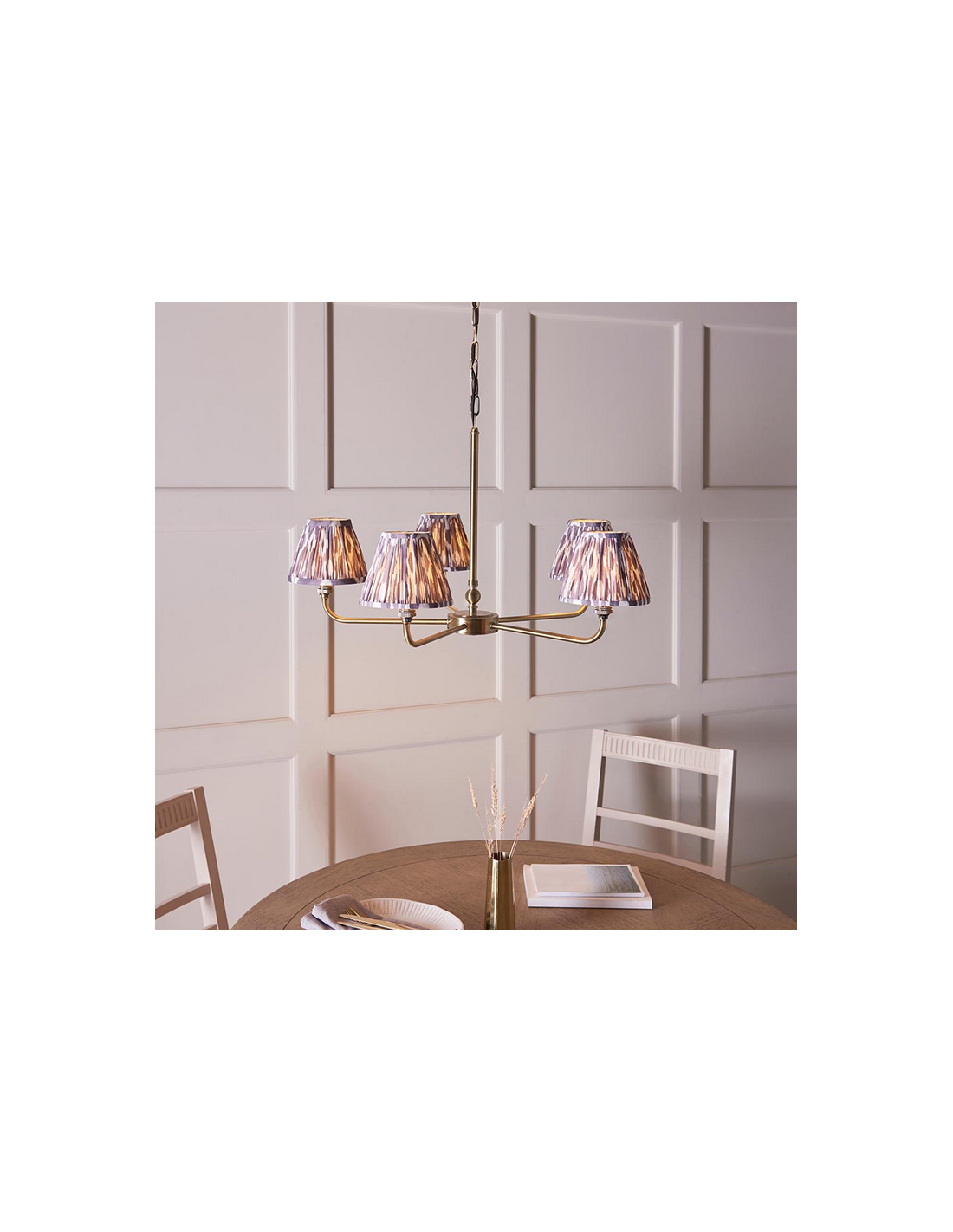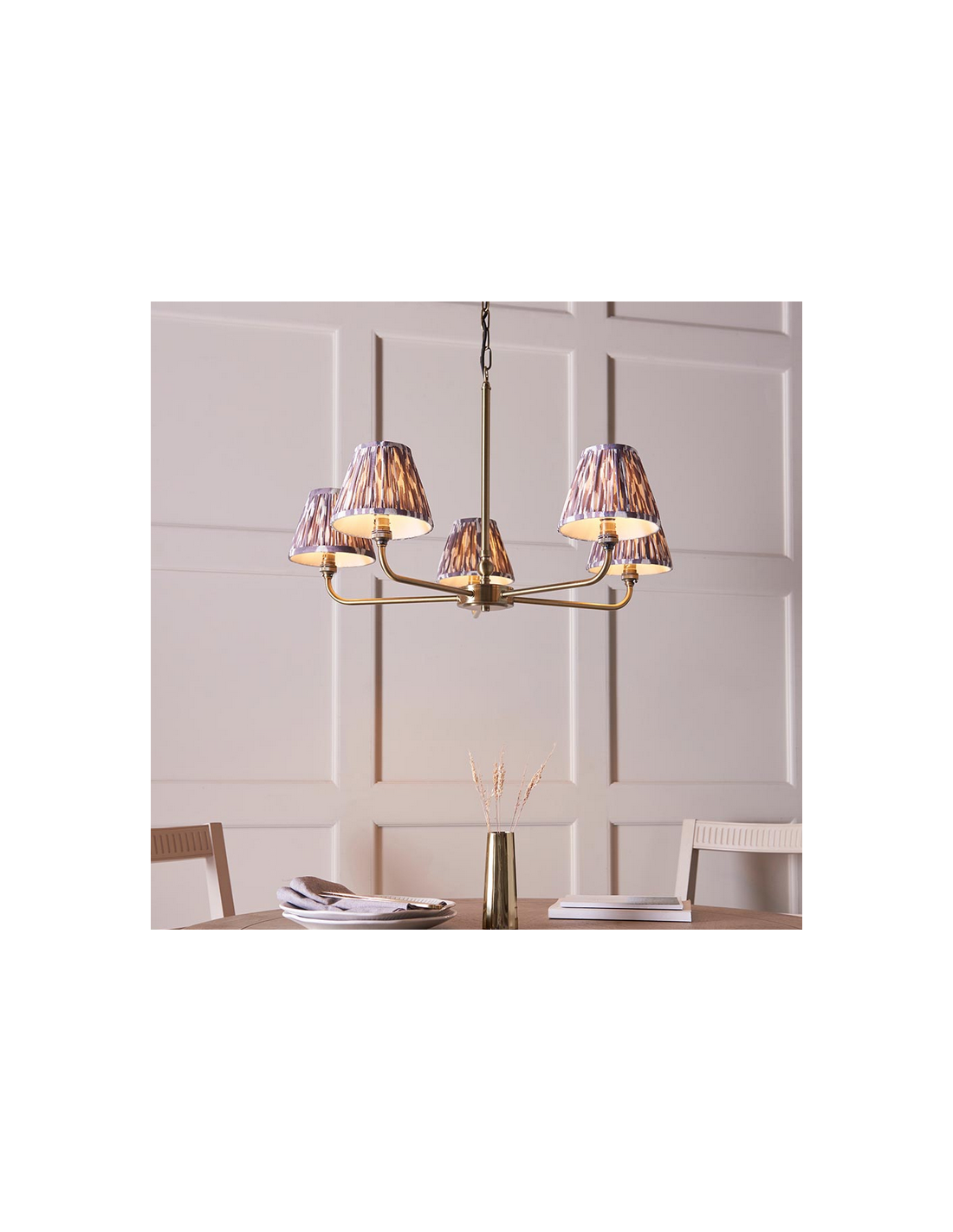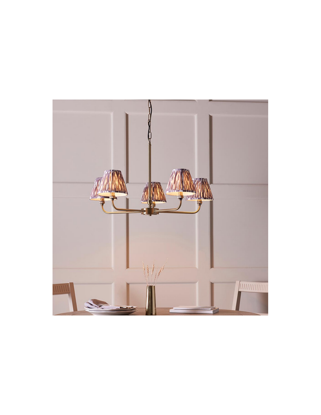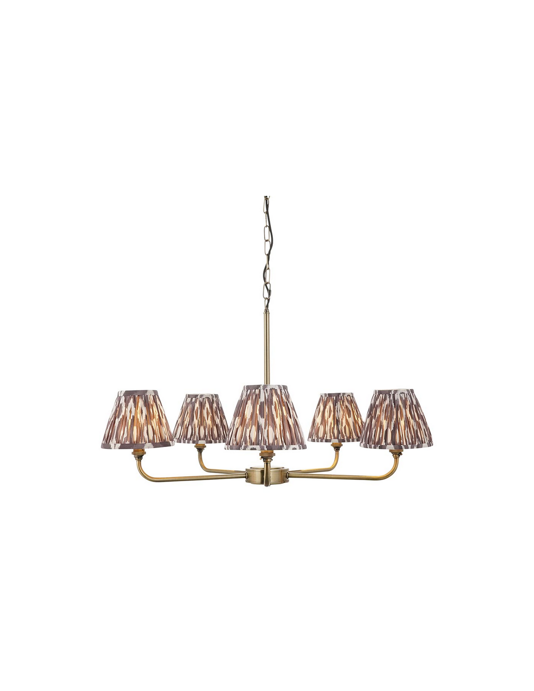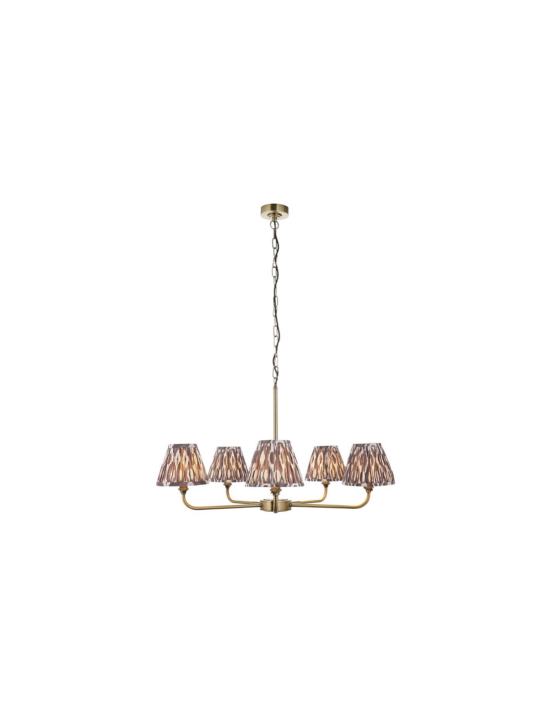 Lysekrone udført i et luksuriøst design af antik messinglakeret stål og med skærme i grå faux silke. Lysekronen måler 79 cm i diameter og anvender 5 x B22 lyskilder (ekskl.).