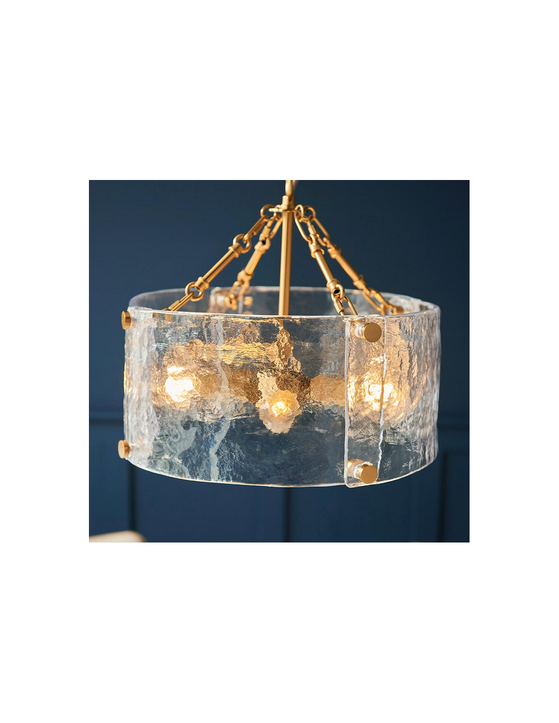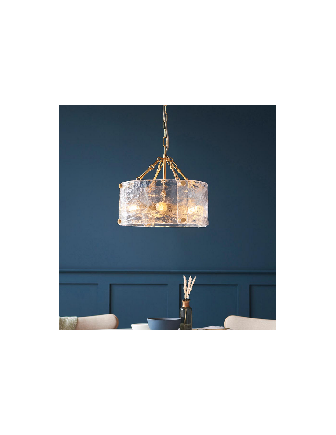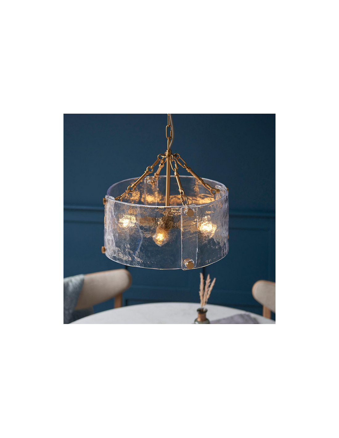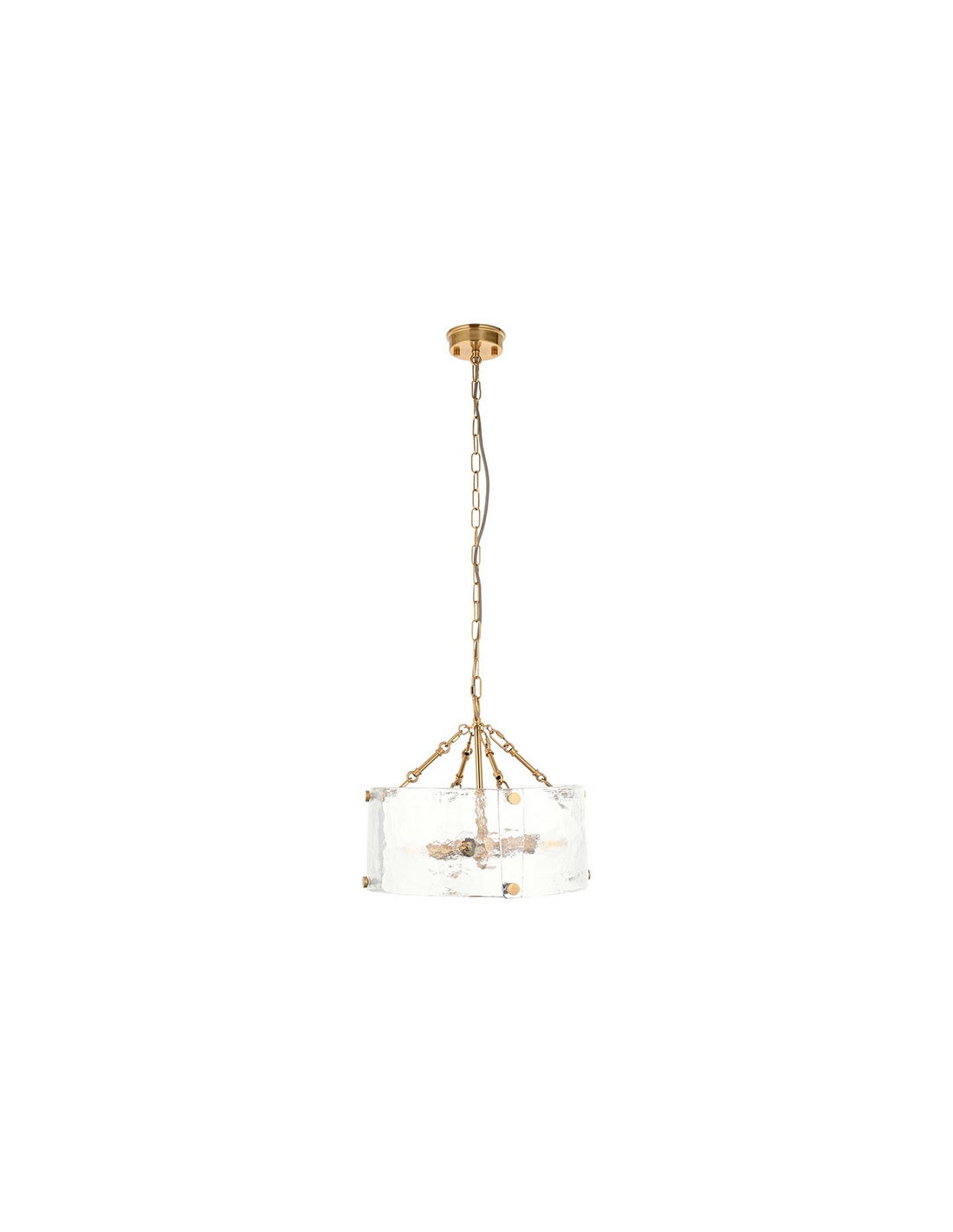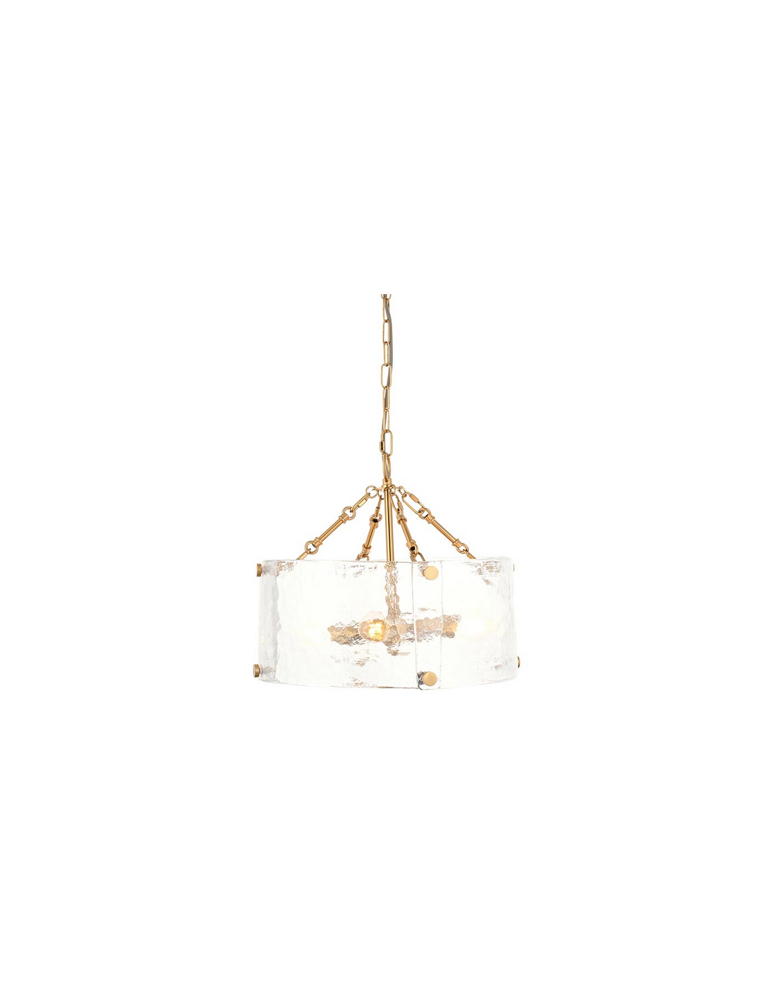 KELLER Lysekrone udført i et luksuriøst design af børstet messinglakeret stål og med skærm i klart tekstureret glas. Lysekronen måler 40 cm i diameter og anvender 4 x E14 lyskilder (ekskl.).