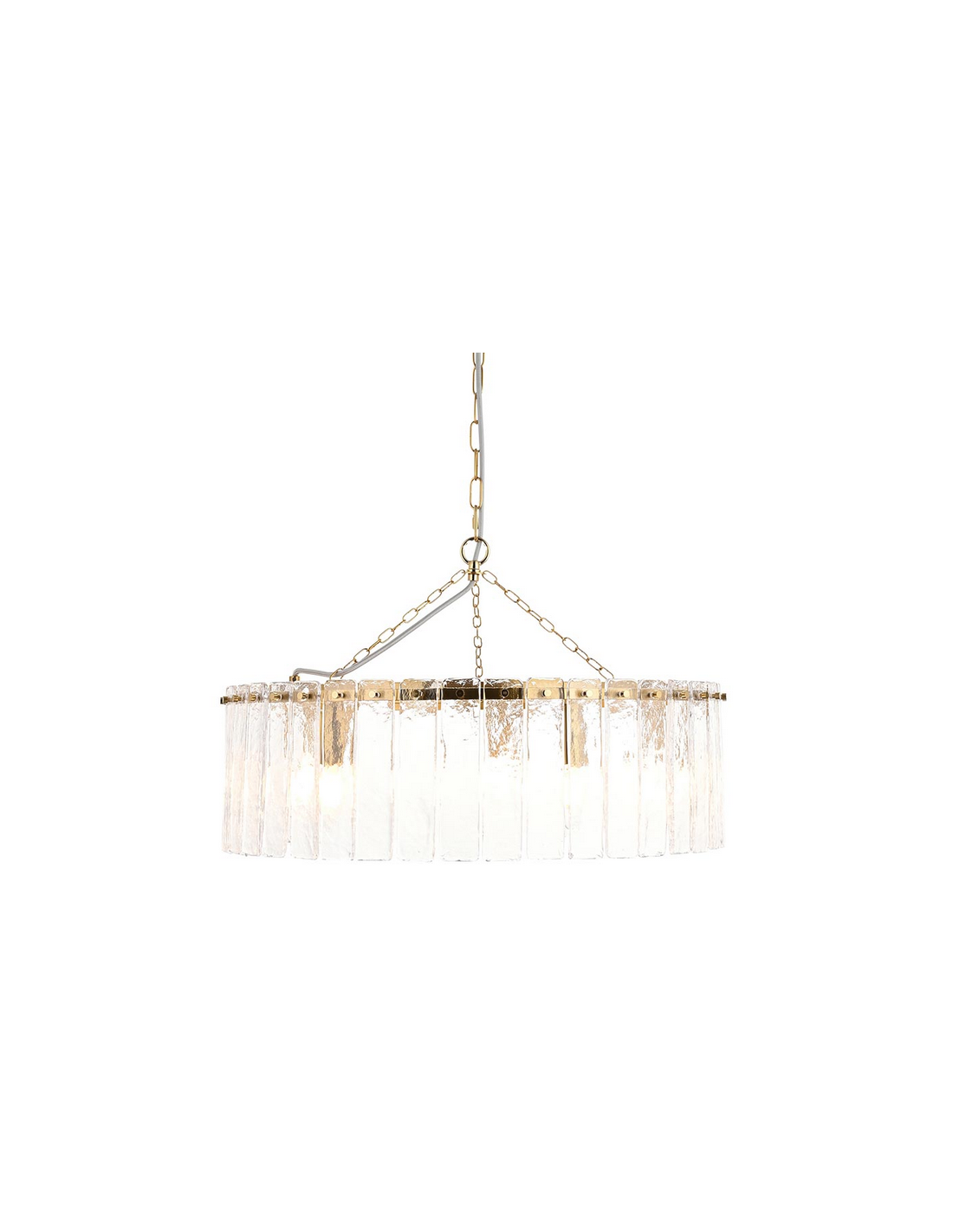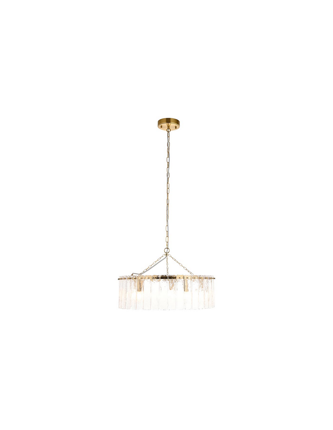 KARINE Lysekrone udført i et luksuriøst design af børstet messinglakeret stål og med skærm i klart tekstureret glas. Lysekronen måler 55 cm i diameter og anvender 5 x E14 lyskilder (ekskl.).