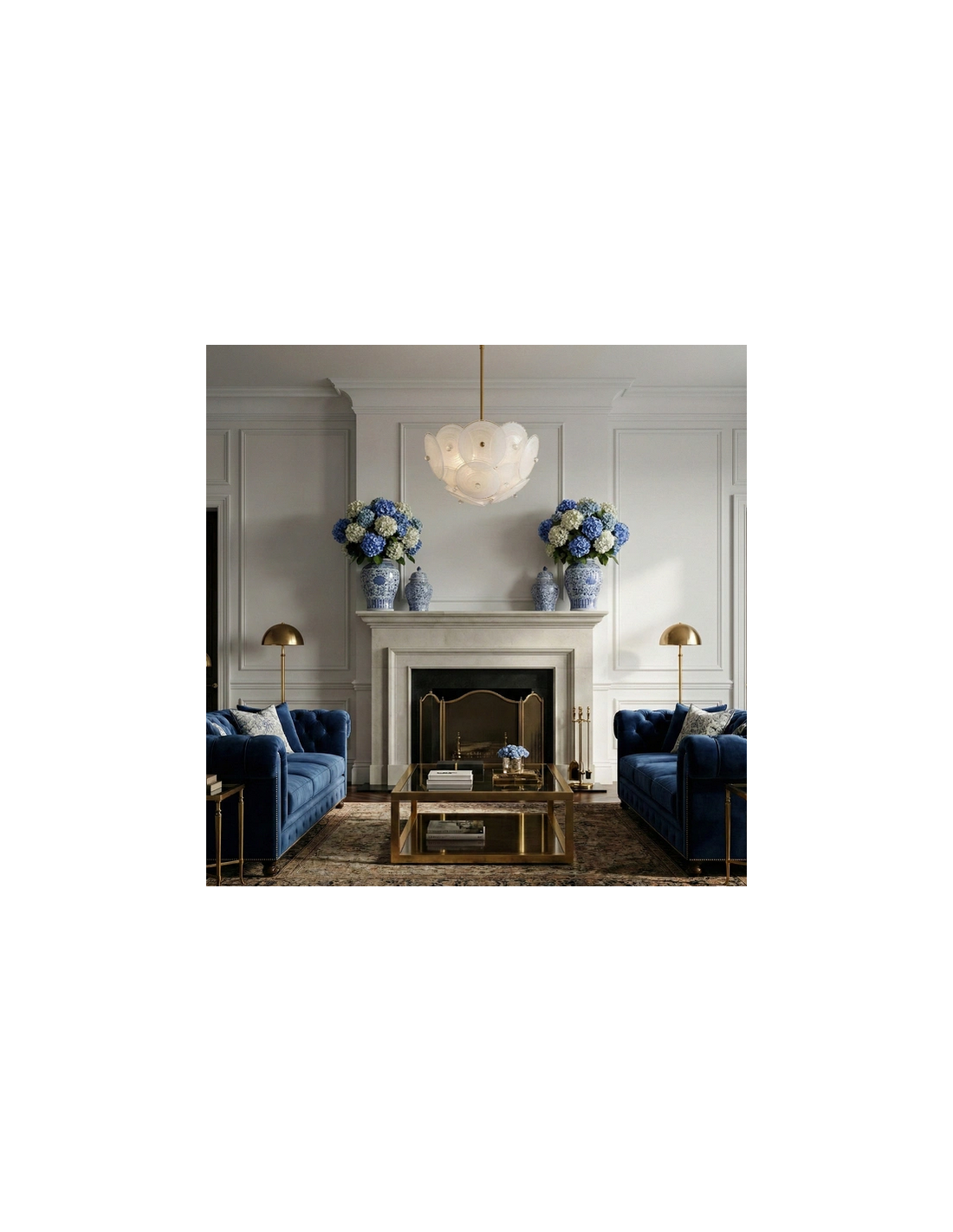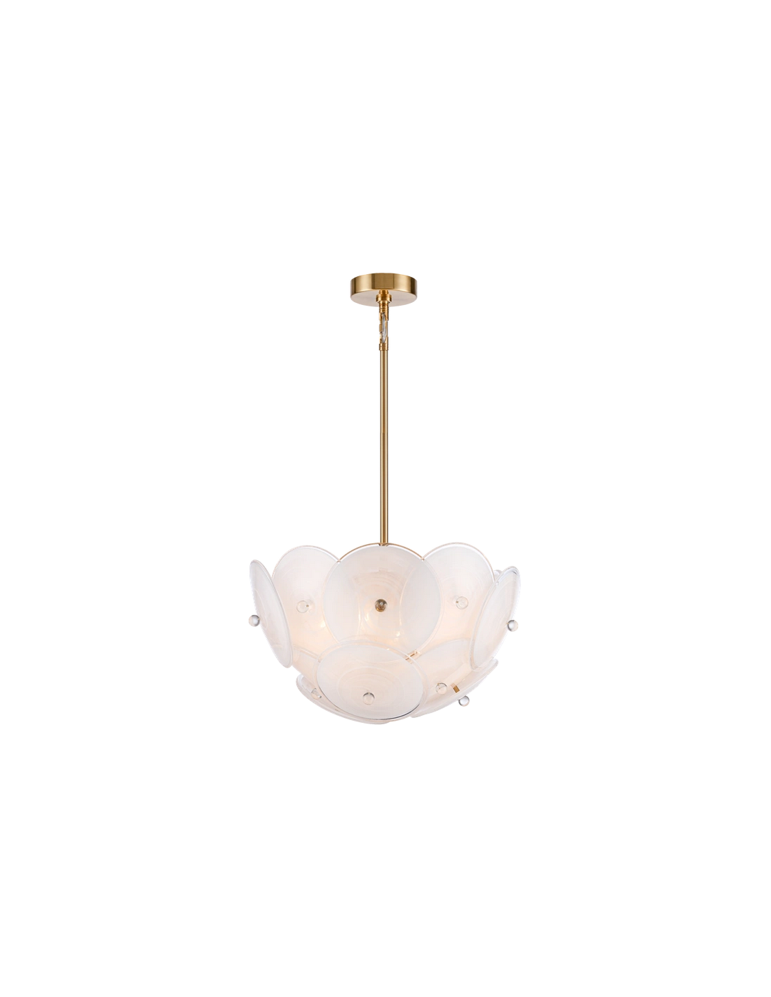 ARDEN Lysekrone udført i et design af børstet messinglakeret metal og hvidt glas. Lampen måler 60 cm i diameter og 46 - 151 cm i højden. Lampen anvender 6 x E14 lyskilder (Ekskl.).