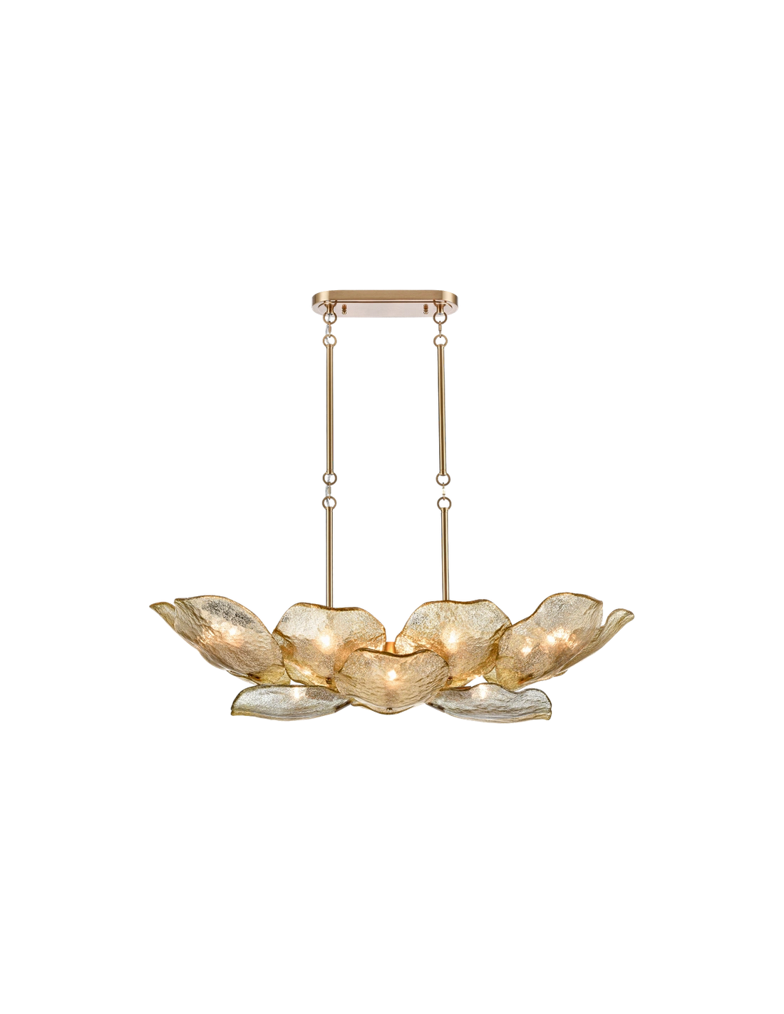 WELLINGTON Lysekrone udført i et design af antik messinglakeret metal og ravfarvet glas. Lampen måler 104,5 x 60 cm i bredde og dybde og 35 - 103 cm i højden. Lampen anvender 14 x E14 lyskilder (Ekskl.).