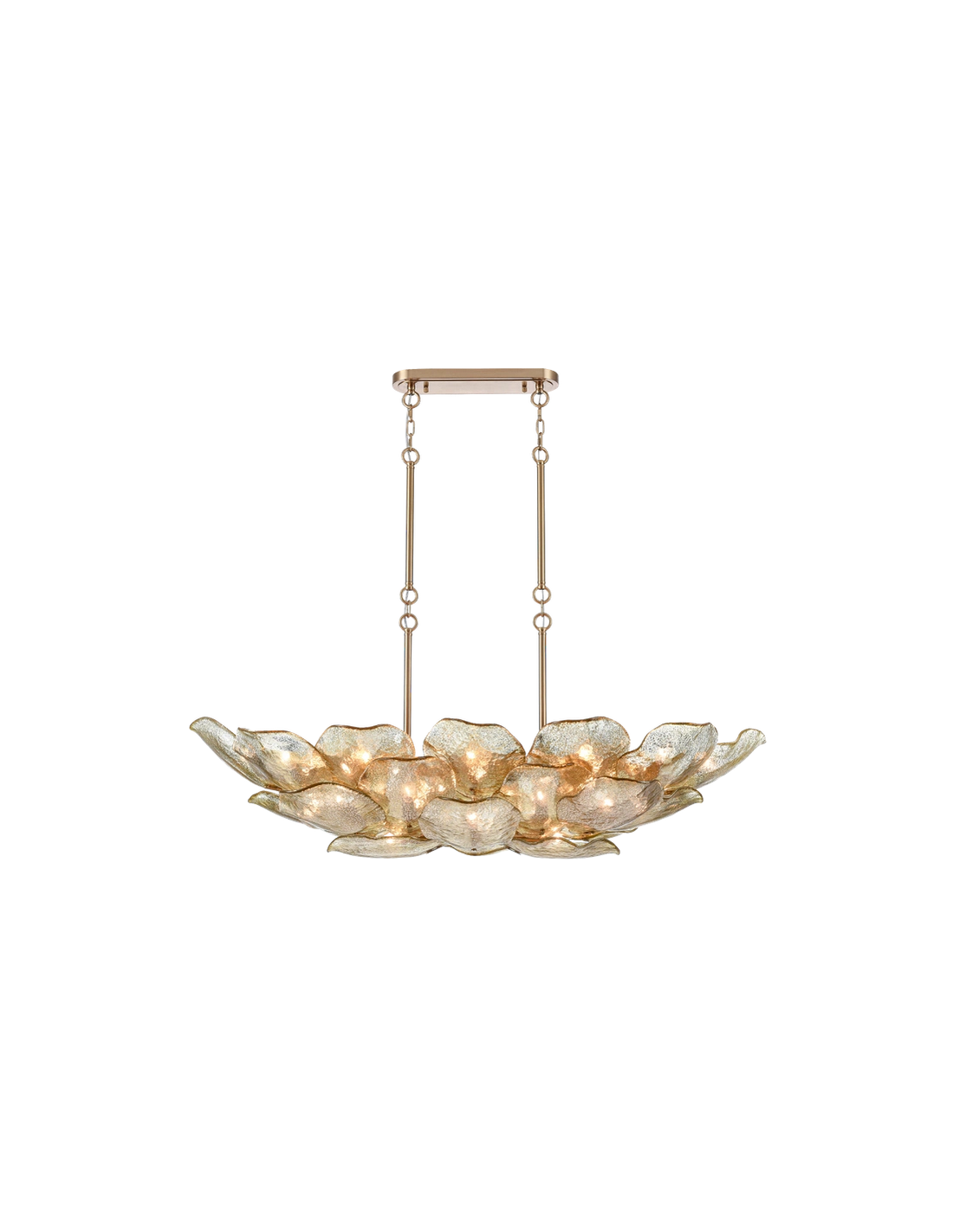 WELLINGTON Lysekrone udført i et design af antik messinglakeret metal og ravfarvet glas. Lampen måler 134 x 61 cm i bredde og dybde og 70,5 - 132 cm i højden. Lampen anvender 26 x E14 lyskilder (Ekskl.).