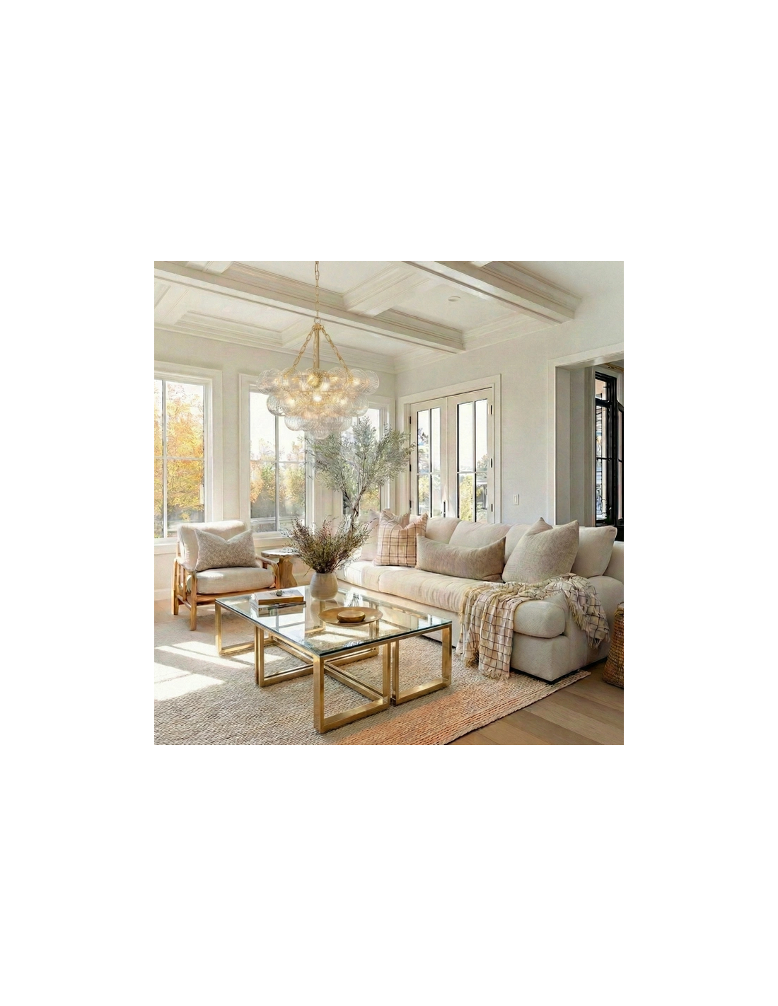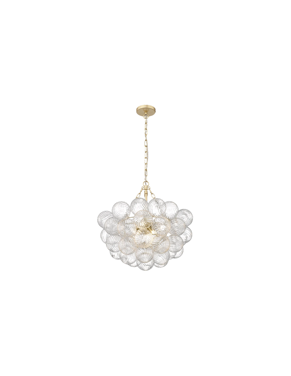 COMO Lysekrone udført i et design af mat guldfarvet metal og klart rillet glas. Lampen måler 54 cm i diameter og 52,5 - 177 cm i højden. Lampen anvender 7 x G9 lyskilder (Ekskl.).