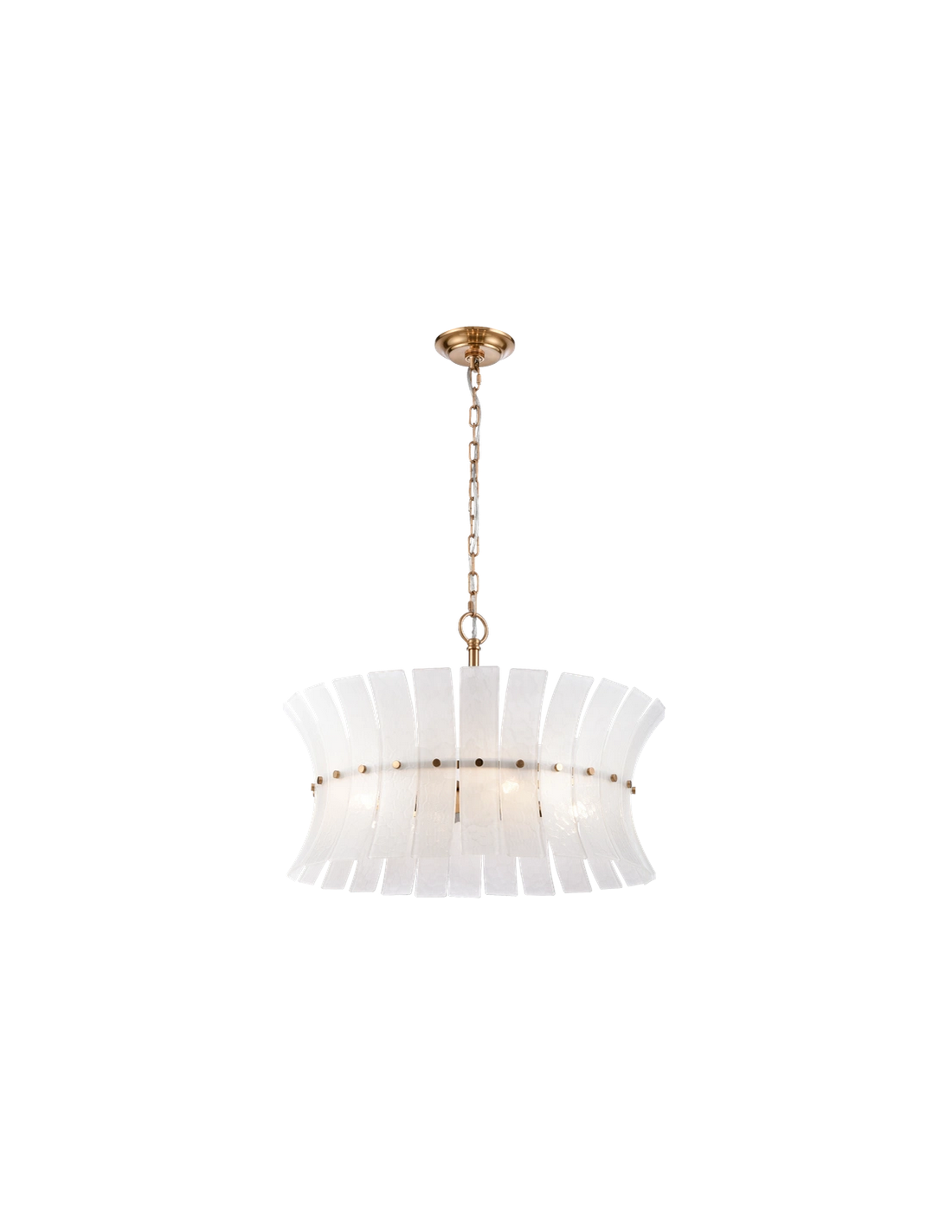 LANCASTER Lysekrone udført i et design af børstet messinglakeret metal og hvidt glas. Lampen måler 56,5 cm i diameter og 26 - 145,5 cm i højden. Lampen anvender 4 x E14 lyskilder (Ekskl.).