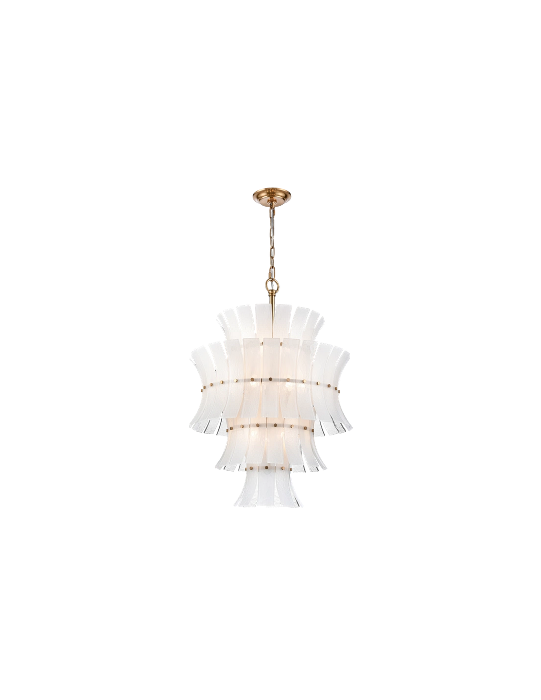 LANCASTER Lysekrone udført i et design af børstet messinglakeret metal og hvidt glas. Lampen måler 56 cm i diameter og 79 - 184 cm i højden. Lampen anvender 13 x E14 lyskilder (Ekskl.).