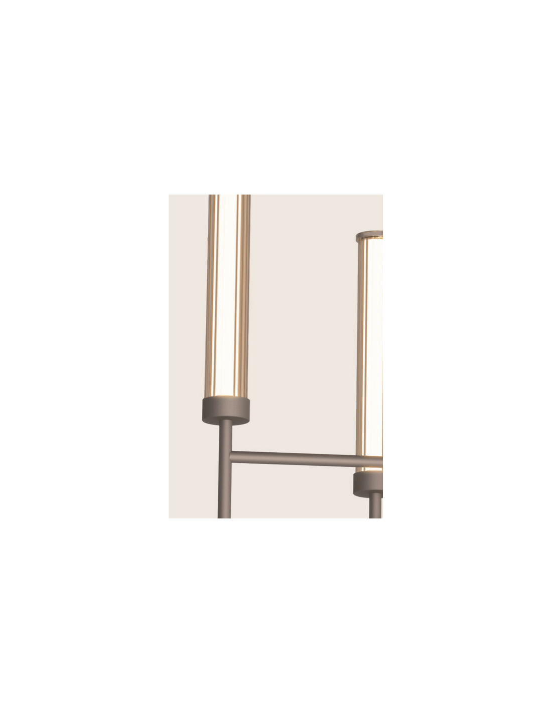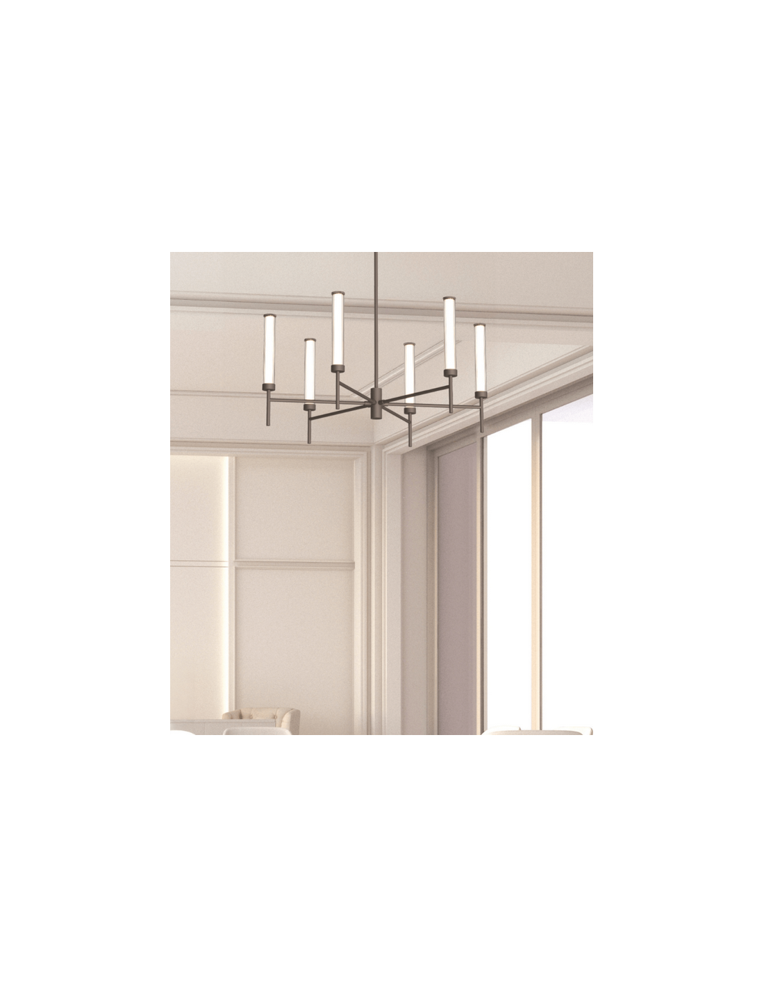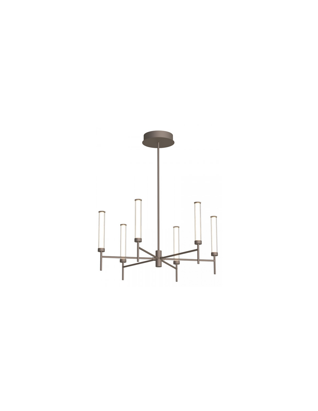 Lysekrone udført i et moderne og dekorativt design af børstet kaffebrun metal, hvid akryl og klart glas. Lysekronen måler 80,5 cm i diameter og 95 - 125 cm i højden. Lampen anvender 46W indbygget LED lyskilde og er dæmpbar med Triac lysstyringssystem.