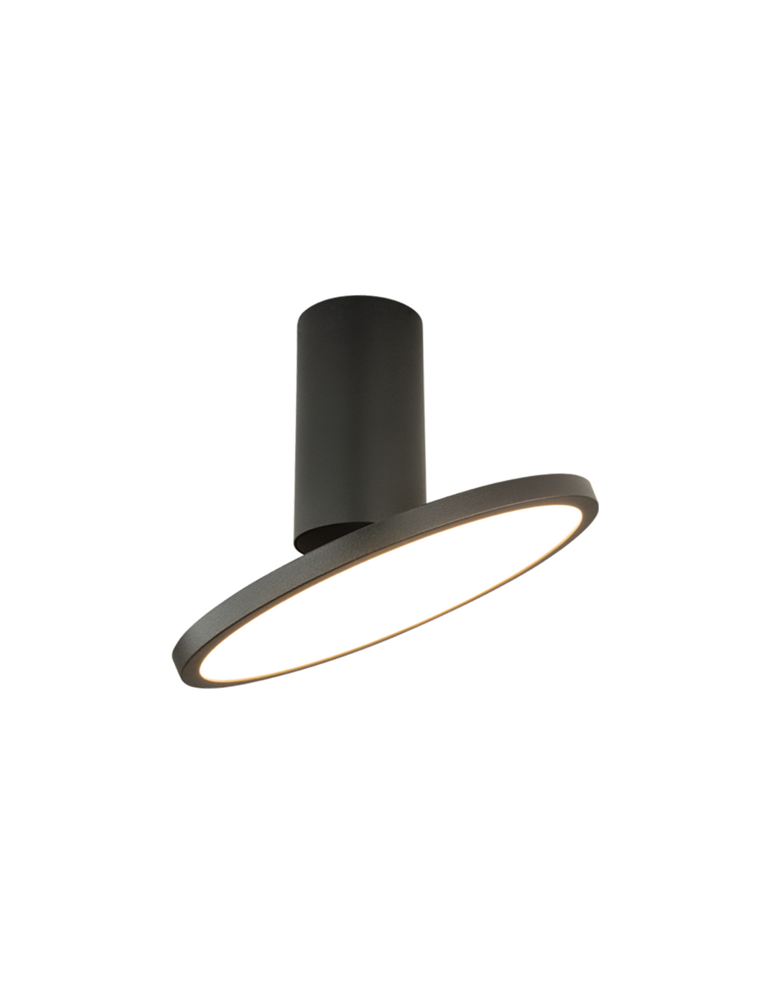 Påbygningsspot fremstillet i et stilrent og moderne design af satineret sortlakeret aluminium, med skærm i hvid polycarbonat. Spotten anvender 12W LED indbygget lyskilde og har indbygget driver. Spottens diameter er 20 cm og højde/fremspring på 21 cm. Lampehovedet er vipbart.